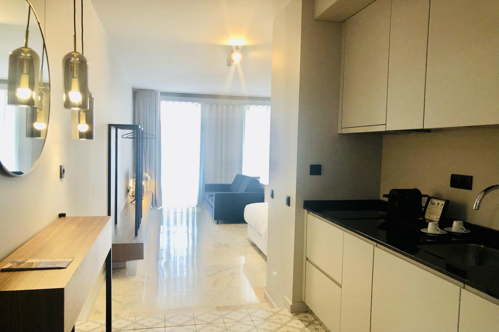 På 2. etage: (Køkken(elkedel, brødrister, kaffemaskine, mikrobølgeovn, køle-fryseskab, Saftpresser, , ), Stue/soveværelse(dobbeltseng, Fjernsyn, sofahjørne), badeværelse(bruser, håndvask, toilet, føntørrer), Internetadgang) , tørretumbler, vaskemaskine, klimaanlæg, strygejern