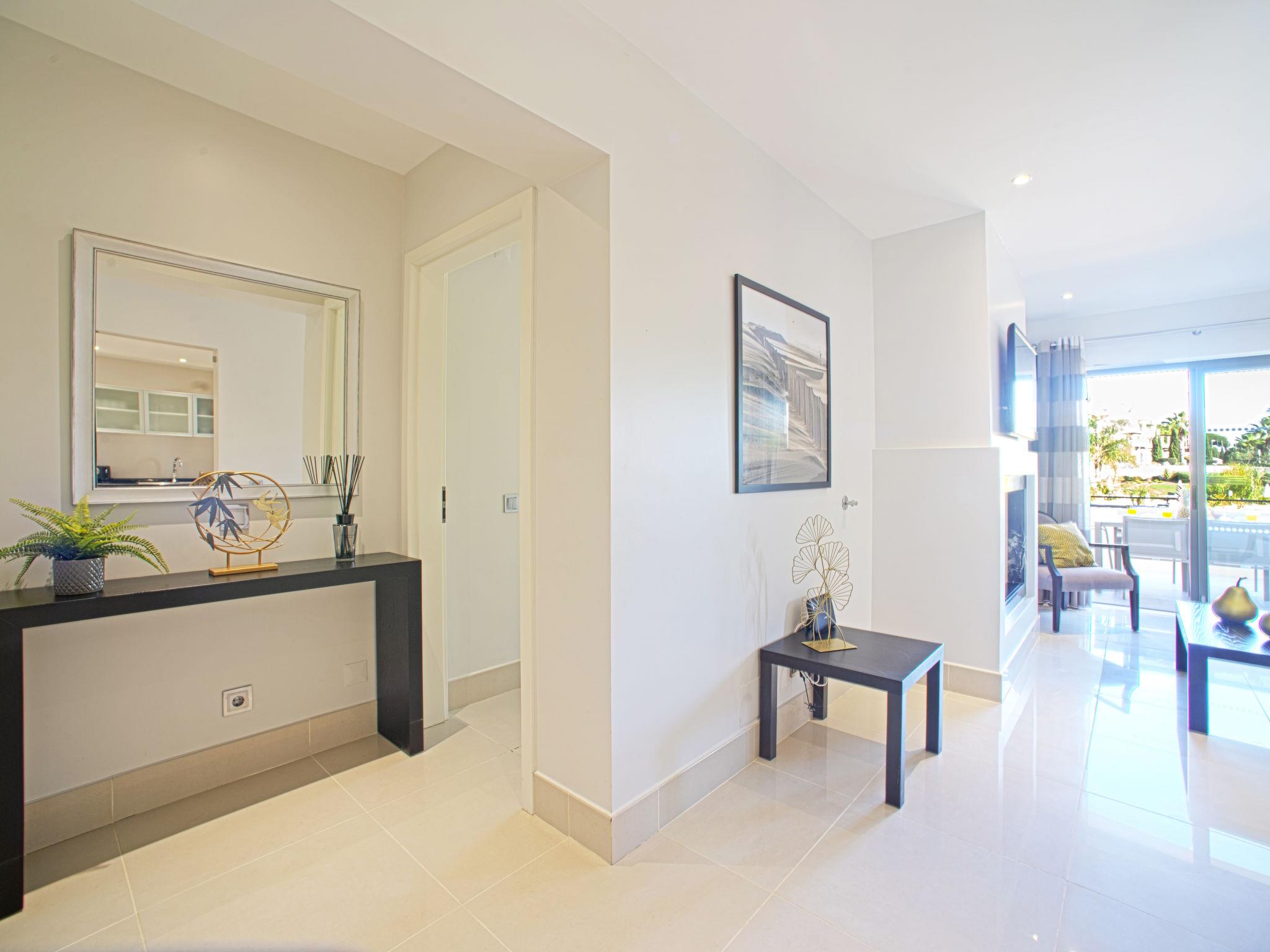 "Pine Hills Esmeralda", 3-room apartment 114 m2 on 1st floor. Modern and cosy furnishings: living/dining room with 1 sofabed (140 cm, length 190 cm), dining table, TV, international TV channels, flat screen, air conditioning and forced-air heating. Exit to the terrace. 1 room with 2 beds (90 cm, length 195 cm), shower/WC, air conditioning and forced-air heating. 1 room with 1 french bed (180 cm, length 195 cm), bath/WC, double hand-basin, air conditioning and forced-air heating. Exit to the terrace. Kitchen (oven, dishwasher, 4 ceramic glass hob hotplates, microwave, freezer, electric coffee machine, Capsules for coffee machine (Dolce Gusto Not Incl)). Sep. WC. Terrace furniture, deck chairs (2). Side view of the swimming pool and the garden. Facilities: washing machine, iron, children's high chair, baby cot for up to 2 year olds, hair dryer. Internet (WiFi, free). Parking space n L57 (roofed), garage. Please note: suitable for families. Non-smokers only. Fire extinguisher. 22794/AL
