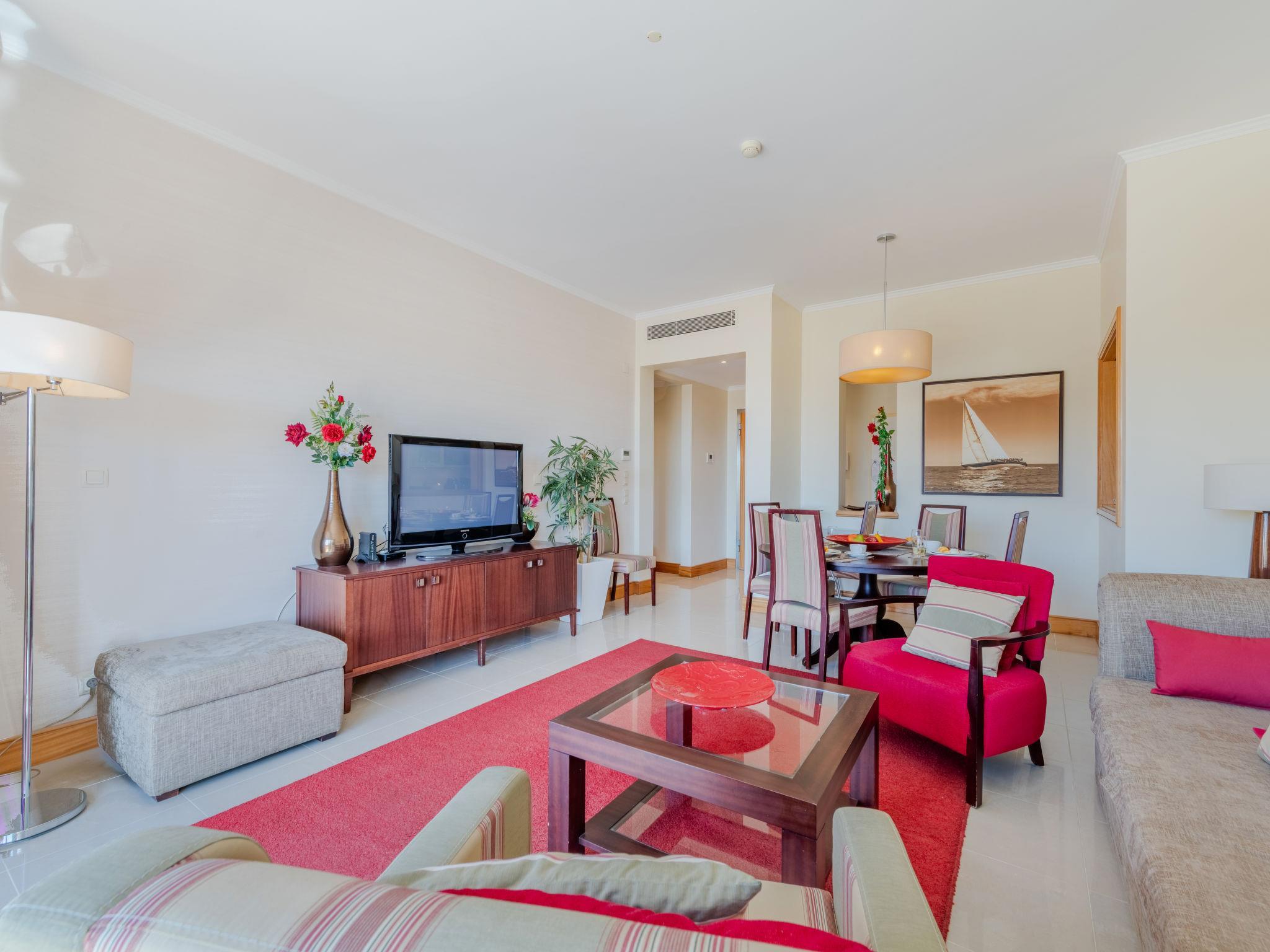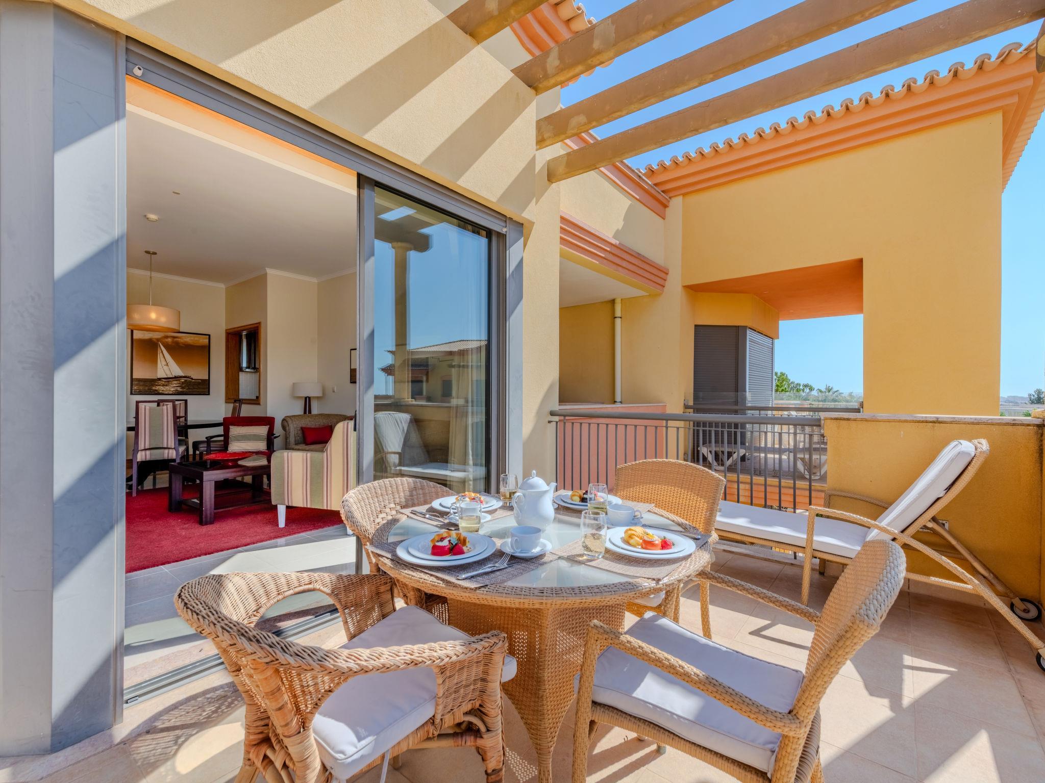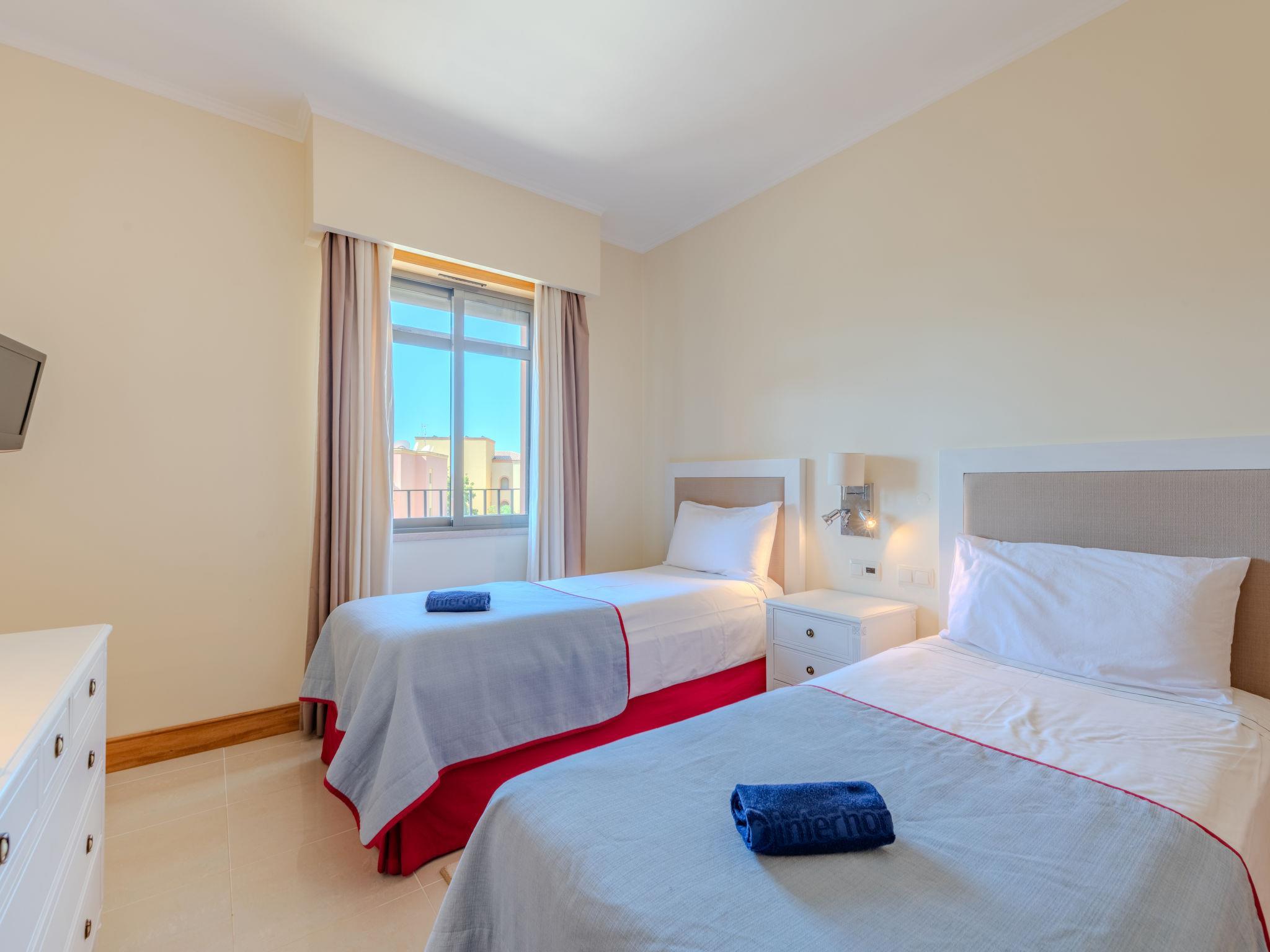 "The Residence at Victoria Clube de Golf", 3-room apartment 130 m2. Comfortable and beautiful furnishings: living/dining room with dining table, digital TV, flat screen, air conditioning and forced-air heating. Exit to the terrace. 1 room with 2 beds (90 cm, length 190 cm), air conditioning and forced-air heating. 1 room with 1 bed (140 cm, length 190 cm), bath/WC, air conditioning and forced-air heating. Kitchen (oven, dishwasher, 4 ceramic glass hob hotplates, toaster, kettle, microwave, electric coffee machine). Shower/WC. Terrace furniture, deck chairs (2). View of the garden. Facilities: washing machine, iron, children's high chair, baby cot, hair dryer. Internet (WiFi, free). Parking space n 103C (roofed, 1 car). Please note: suitable for families. Non-smokers only. Fire extinguisher. 157774/AL