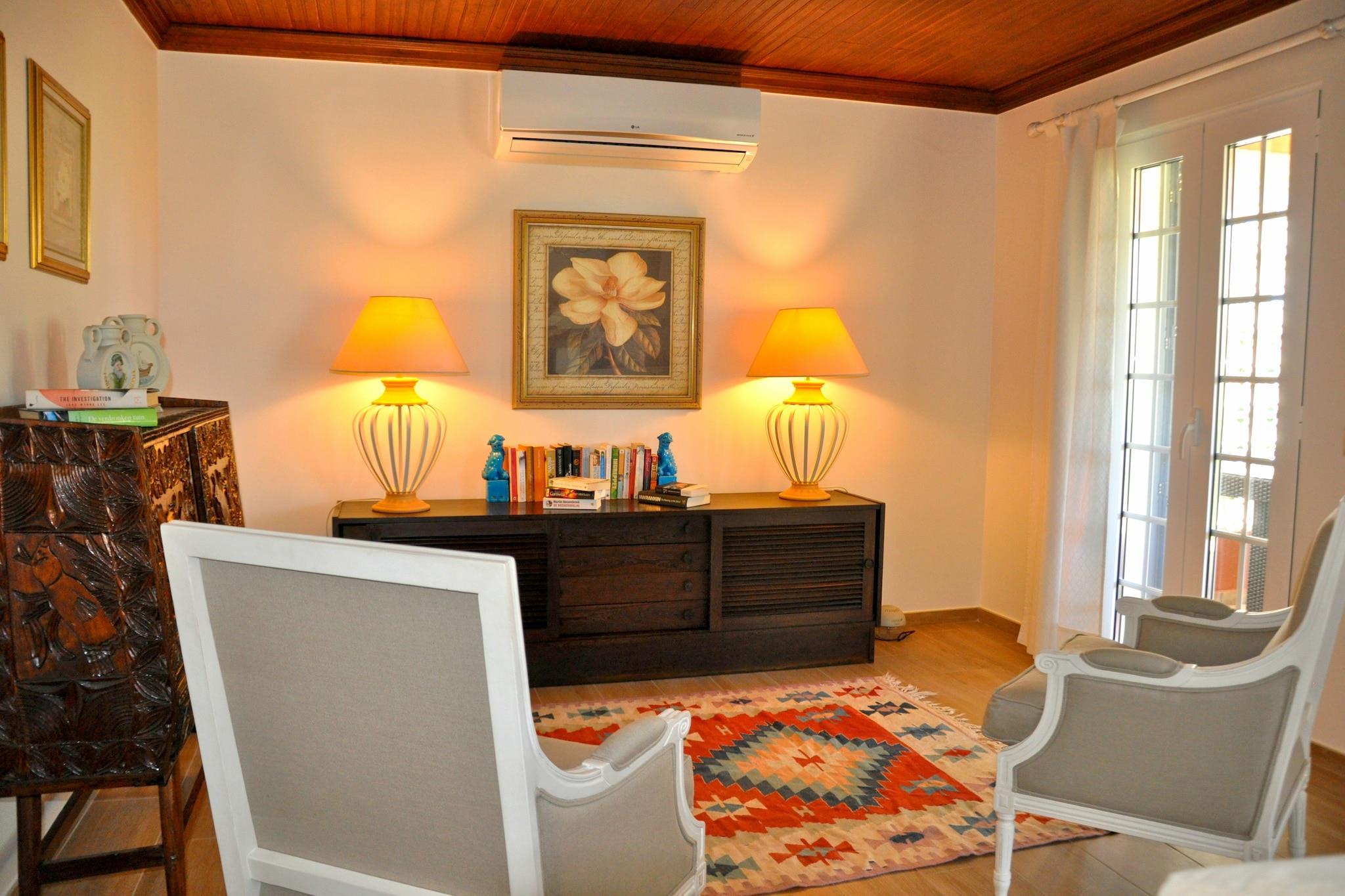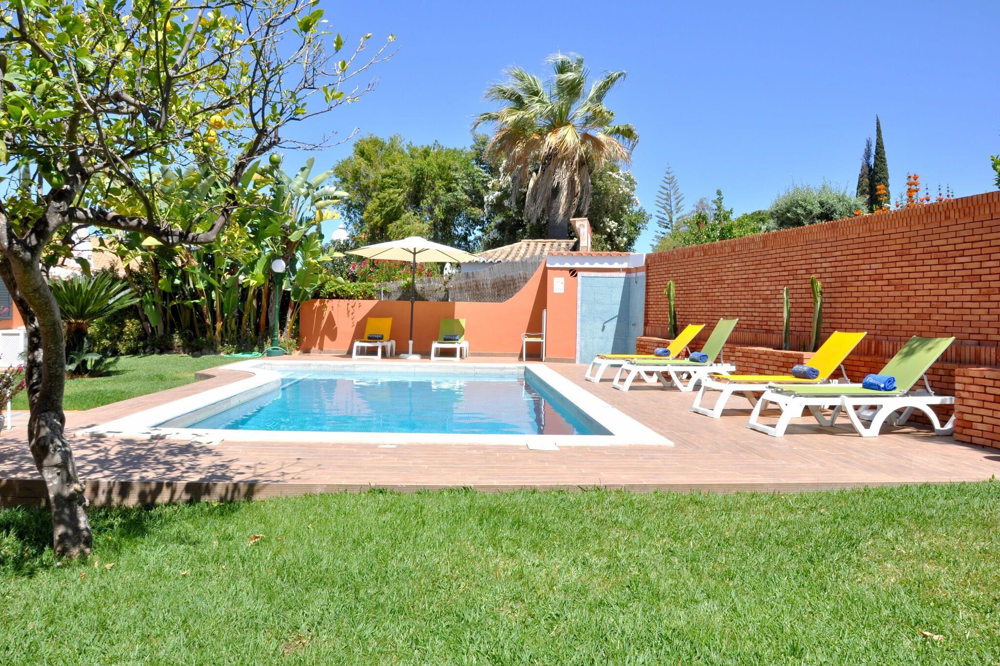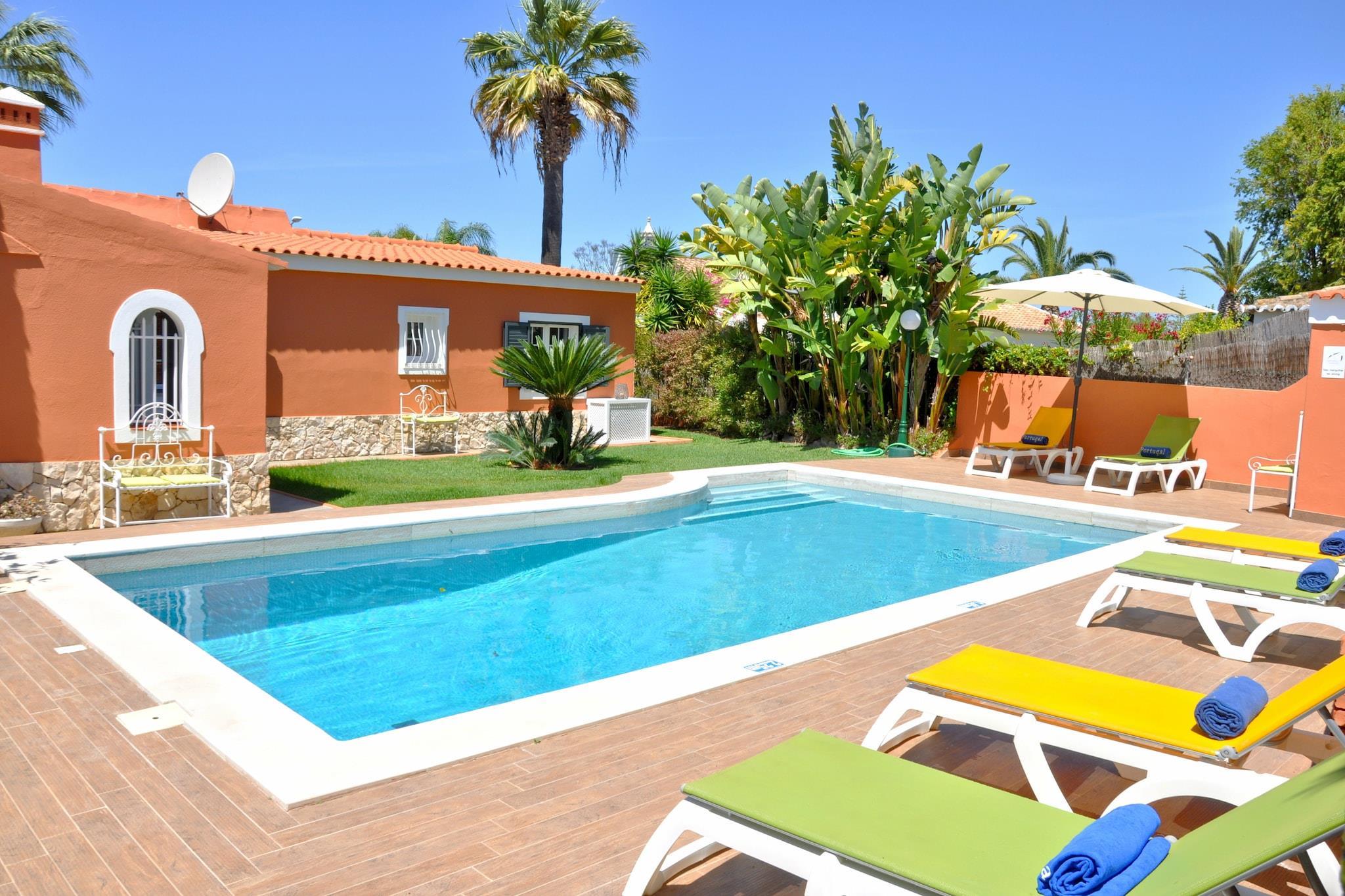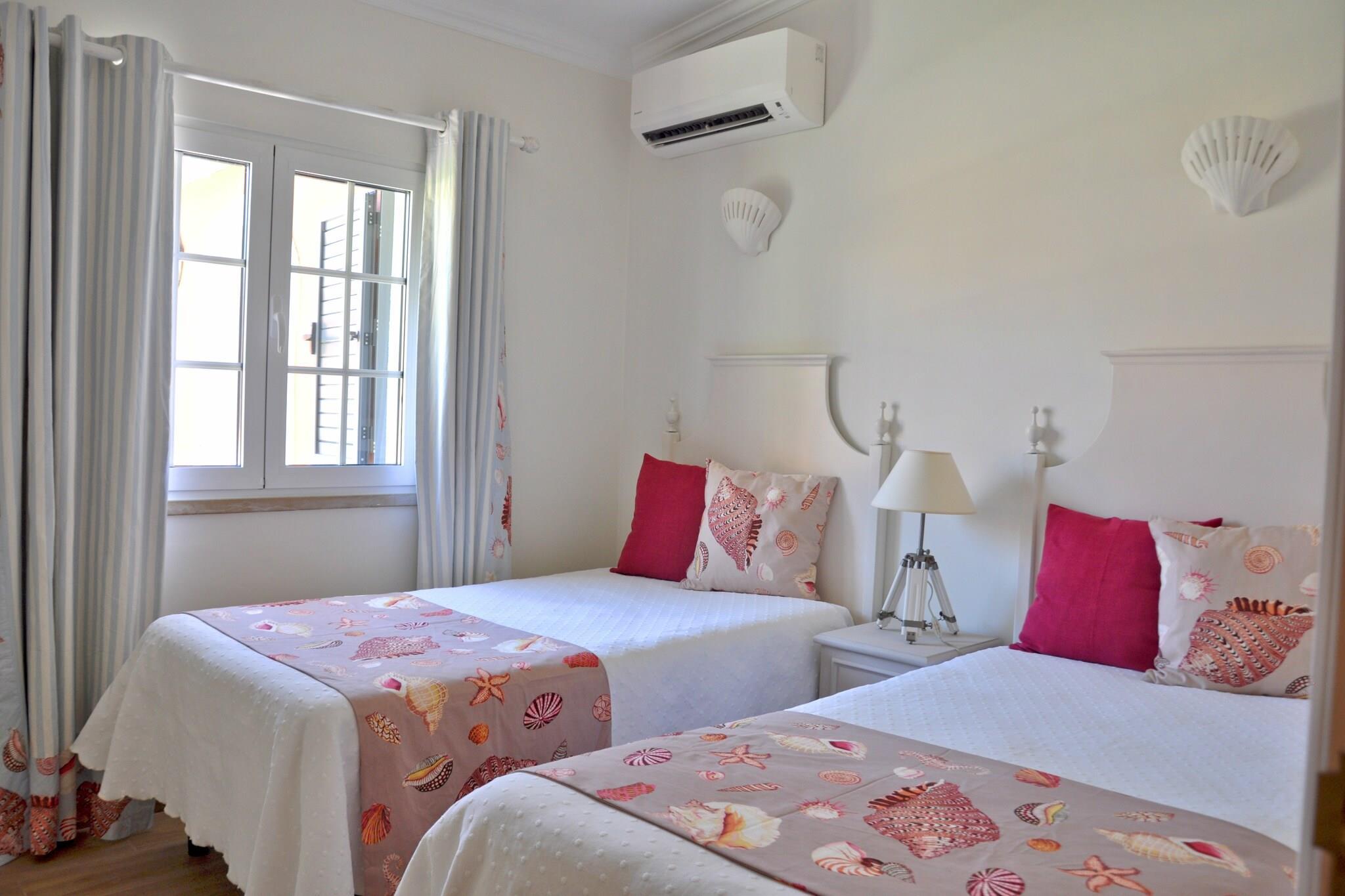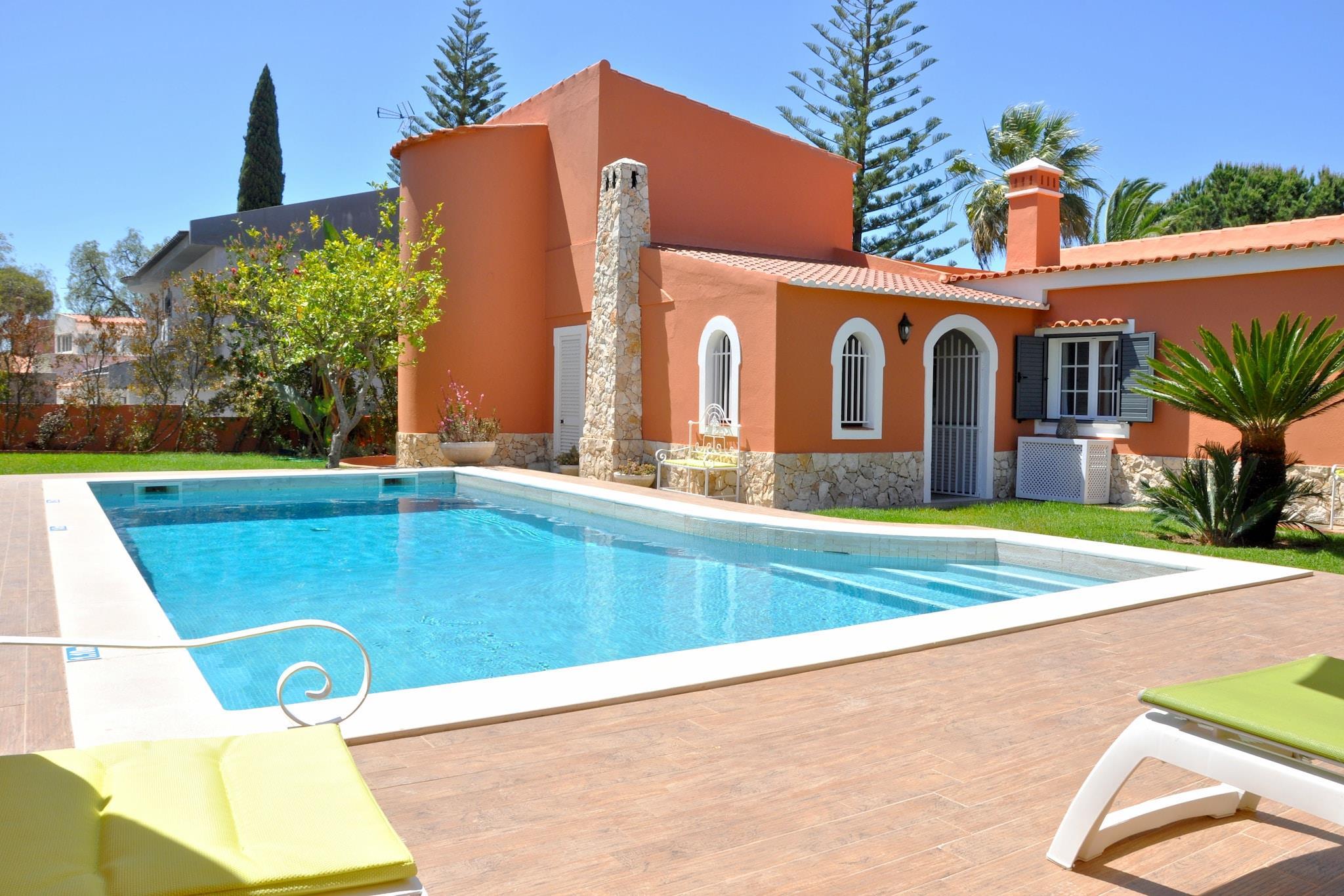 Beliggende i et af Vilamouras eksklusive boligområder, tæt på byens golfbaner, natteliv og lystbådehavn, er denne meget attraktive villa beliggende i dejlige omgivelser. Et fantastisk, veludstyret køkken giver en dejlig sommerlig følelse og åbner op til en rummelig spisestue. En stor åben planløsning med pine-træmøbler fører til terrassen og poolområdet. Ejendommen har terrasser foran og bag samt et dejligt græsareal med palmer. Indkvarteringen består af: - 1 dobbeltværelse med eget badeværelse - 2 soveværelser med dobbeltsenge - 2 badeværelser (suite incl.) Egenskaber: - Privat pool (størrelse: 3,80mx 8,20mx 4,80 / dybde: 1,05mx 2,00m) - Privat have - Havemøbler - BBQ-Fuldt udstyret køkken-Vaskemaskine-Opvaskemaskine-Mikrobølgeovne-Kabel TV-Wi-Fi internet-Air condition (kun værelser)