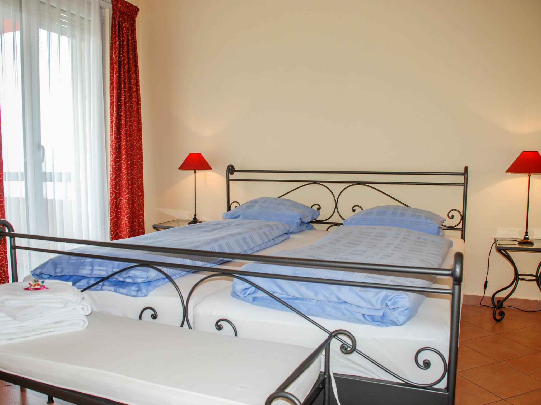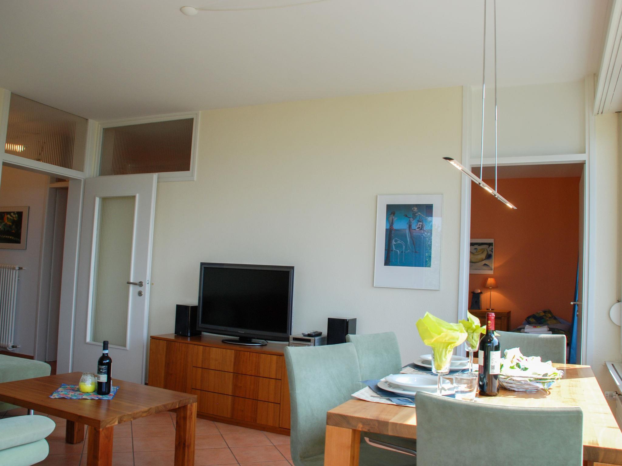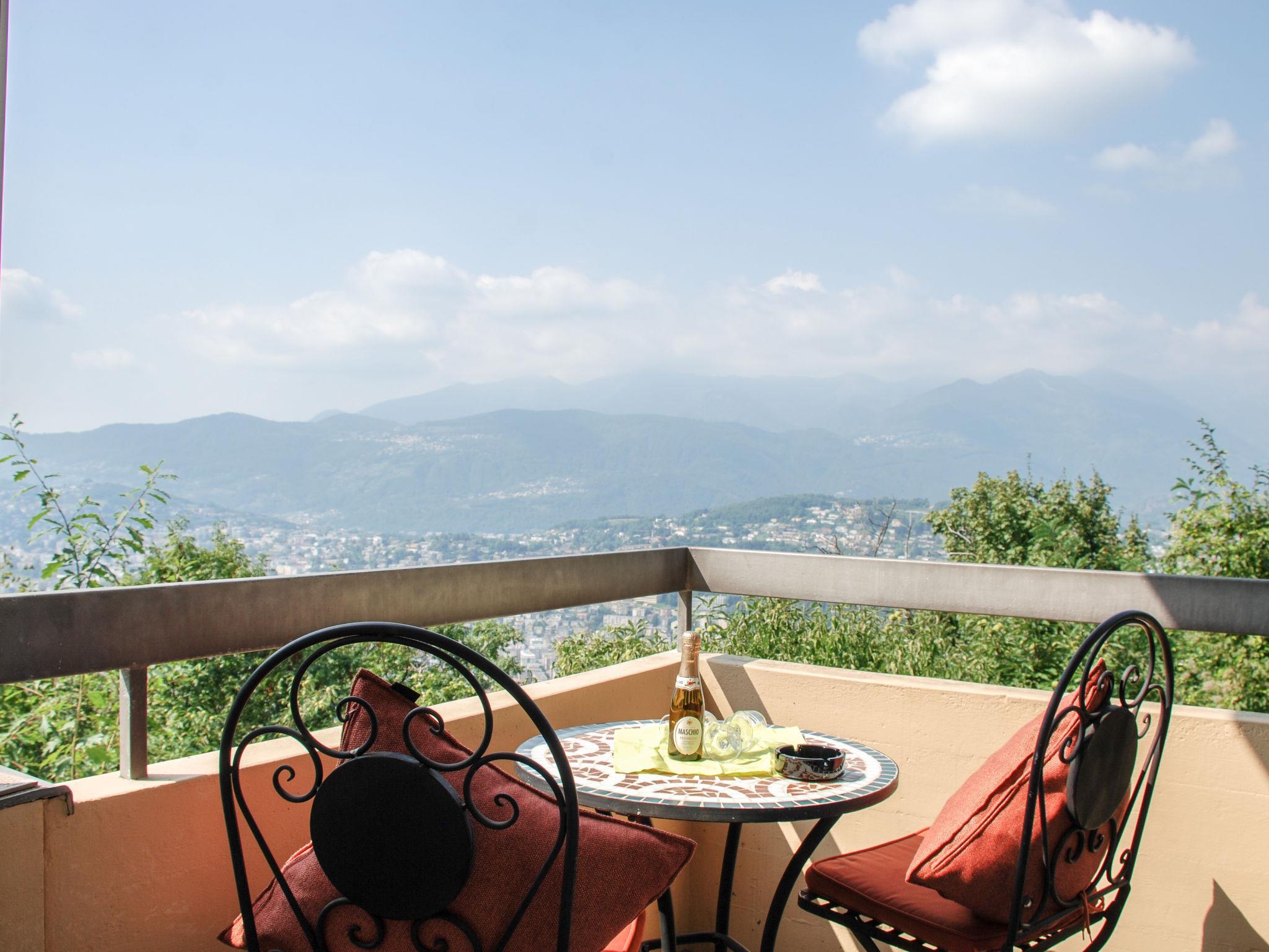 "Residenza Monte Bré - Apt.004 Haus1", 3-room apartment 58 m2, on the ground floor, south-west facing position. Spacious and bright, comfortable and modern furnishings: open living/dining room with panoramic window with dining table, cable TV, flat screen, radio, CD-player and DVD. Exit to the balcony. 1 double bedroom with 1 double bed (2 x 90 cm, length 200 cm). Exit to the balcony. 1 room with 2 beds (90 cm, length 200 cm) (2 x). Small kitchen (oven, dishwasher, 4 ceramic glass hob hotplates, kettle, microwave, electric coffee machine, Capsules for coffee machine (Nespresso) extra). Bath/WC. Heating. Balcony, south facing position. Terrace furniture. Beautiful view of the mountains, the countryside and the town. Please note: non-smokers only. NL-00007660