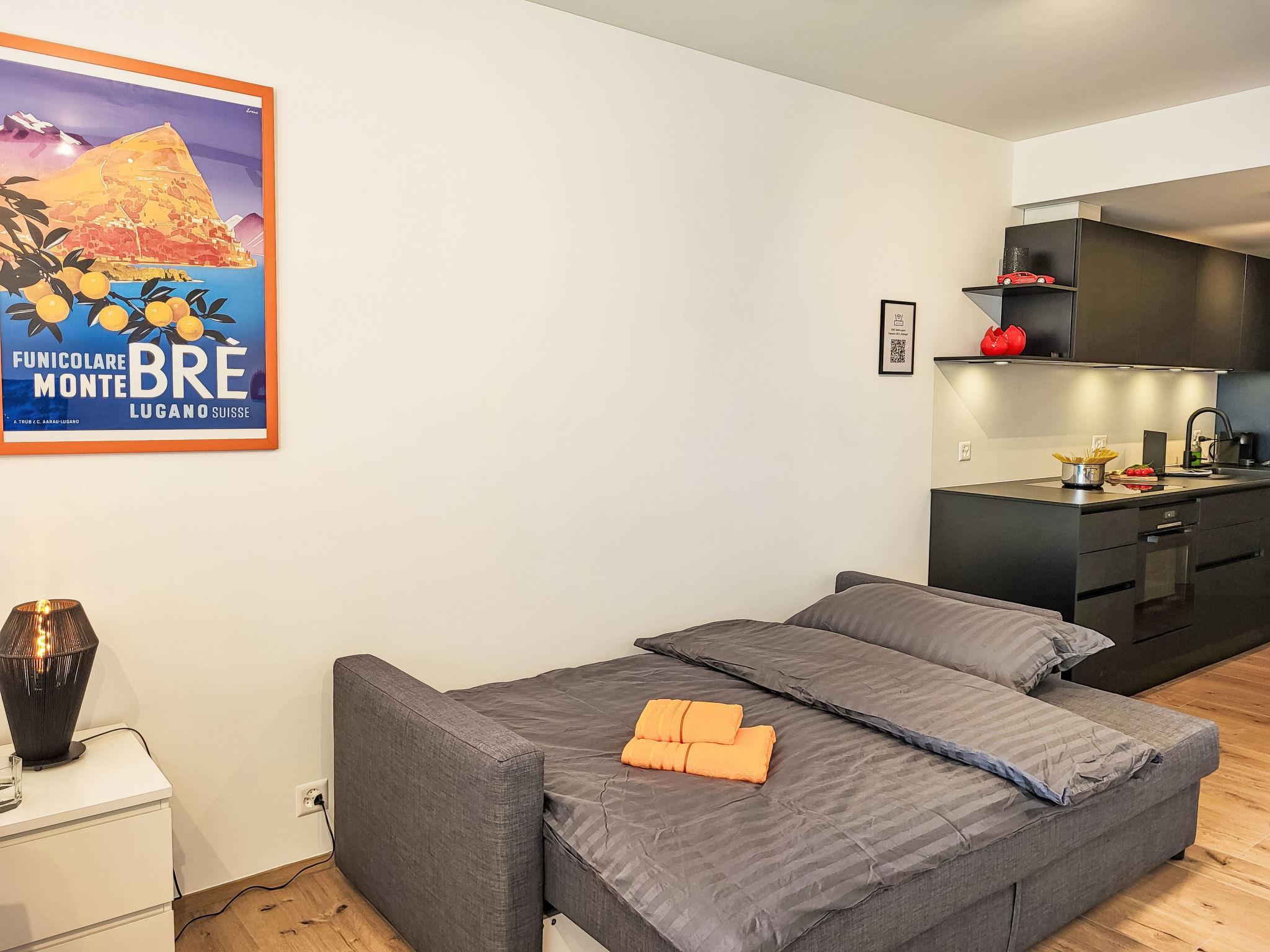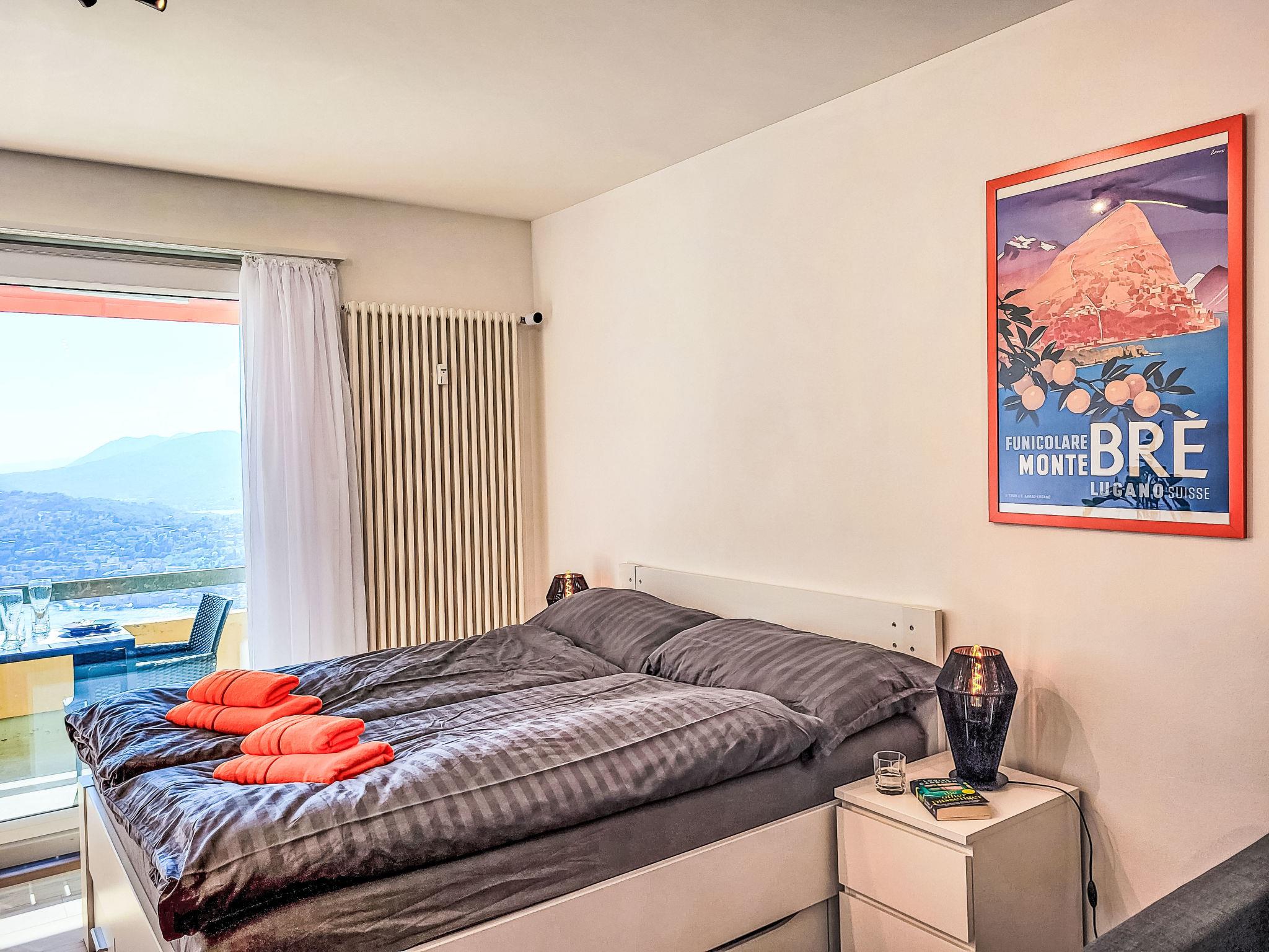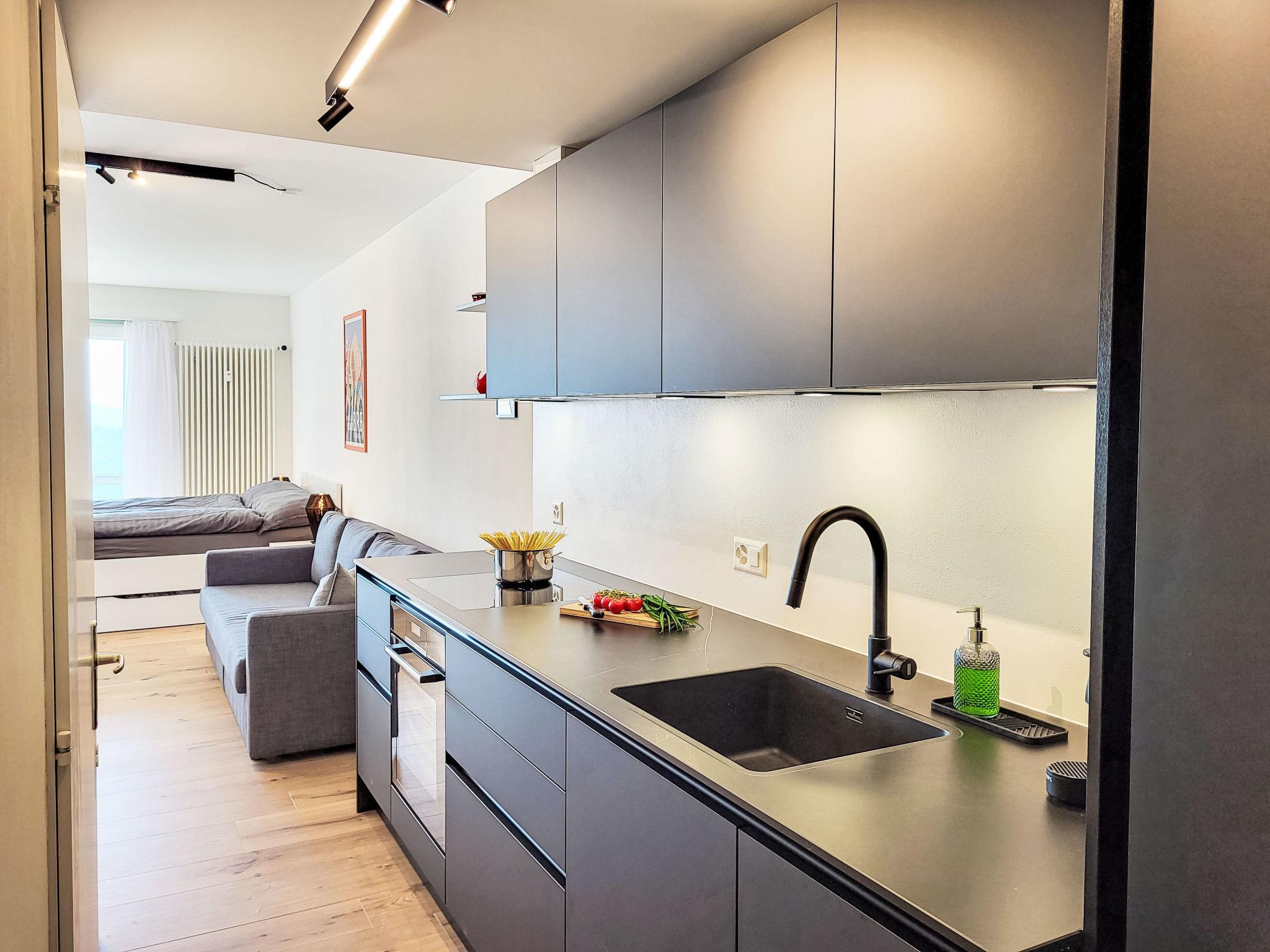 "Residenza Monte Brè - Apt. 203 Haus2", 1-room apartment 28 m2 on 2nd floor, south-west facing position. Fully renovated in 2025, comfortable and modern furnishings: open living/sleeping room with 1 sofabed (140 cm, length 200 cm), 1 double bed (160 cm, length 200 cm). Open kitchen in the entrance (oven, dishwasher, 4 induction hot plates, toaster, kettle, microwave, electric coffee machine, Capsules for coffee machine (Nespresso) extra). Shower/WC. Heating. Small balcony 4 m2, south-west facing position. Balcony furniture. Marvellous panoramic view of the lake, the mountains, the countryside and the city. Facilities: children's high chair, baby cot for up to 2 year olds (extra), hair dryer. Internet (WiFi, free, Bandwidth: 1'000 Mbit/s). Parking (extra) at the house. Please note: non-smokers only. NL-00012843