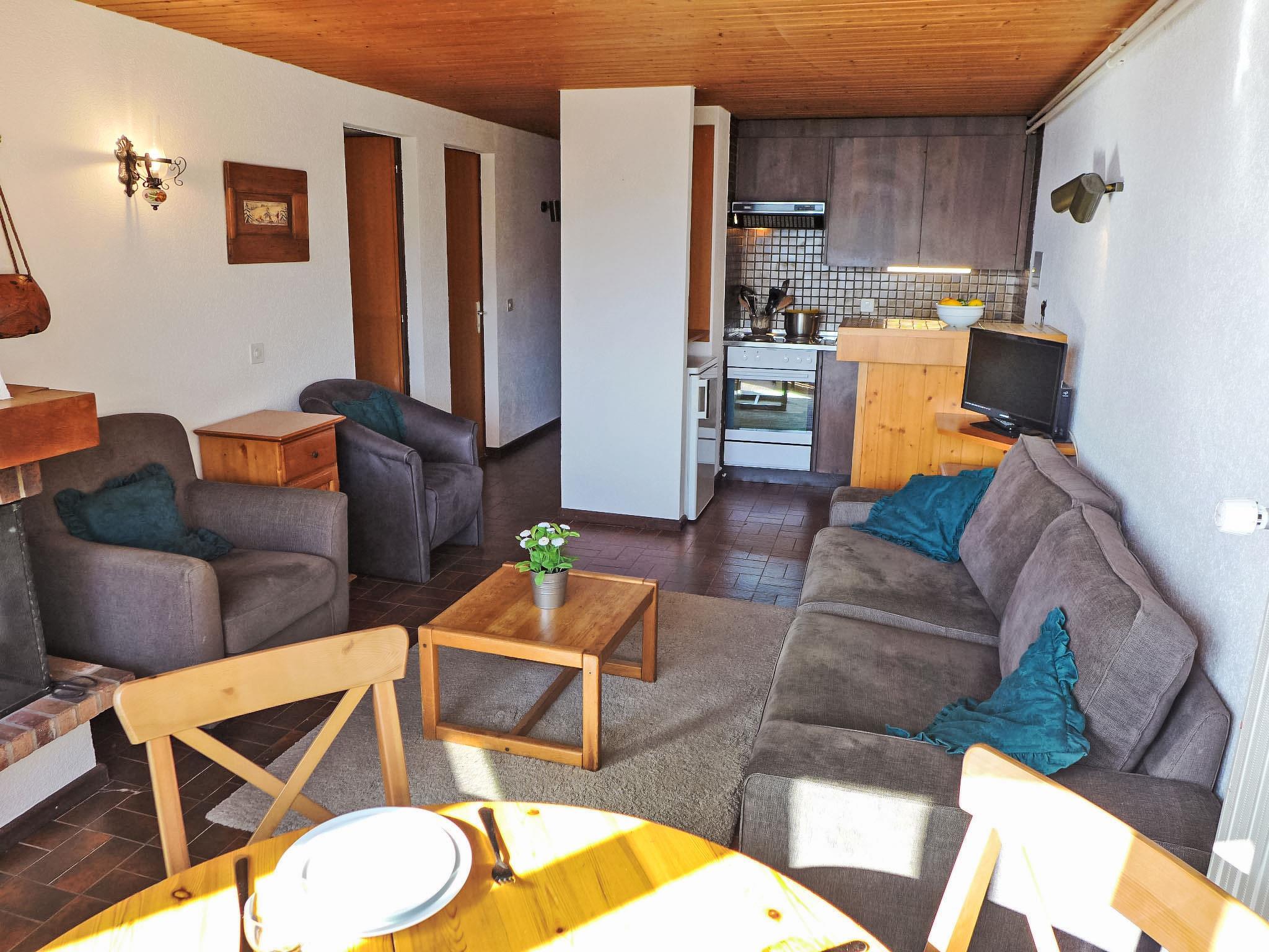 "La Vire D'Aufalle 14 Inférieur", 3-room apartment 45 m2, on the ground floor. Practical furnishings: living/dining room with open-hearth fireplace and TV (flat screen), DVD. Exit to the terrace. 2 rooms, each room with 2 beds. Small, open kitchen (3 hot plates, oven, toaster, kettle, electric coffee machine, raclette grill, fondue Set (cheese)). Bath/WC. Terrace, south facing position. Terrace furniture. View of the mountains and the countryside. Facilities: Internet (WiFi, free). Parking space n 14I (roofed) at 100 m, height 200 cm, width 237 cm.