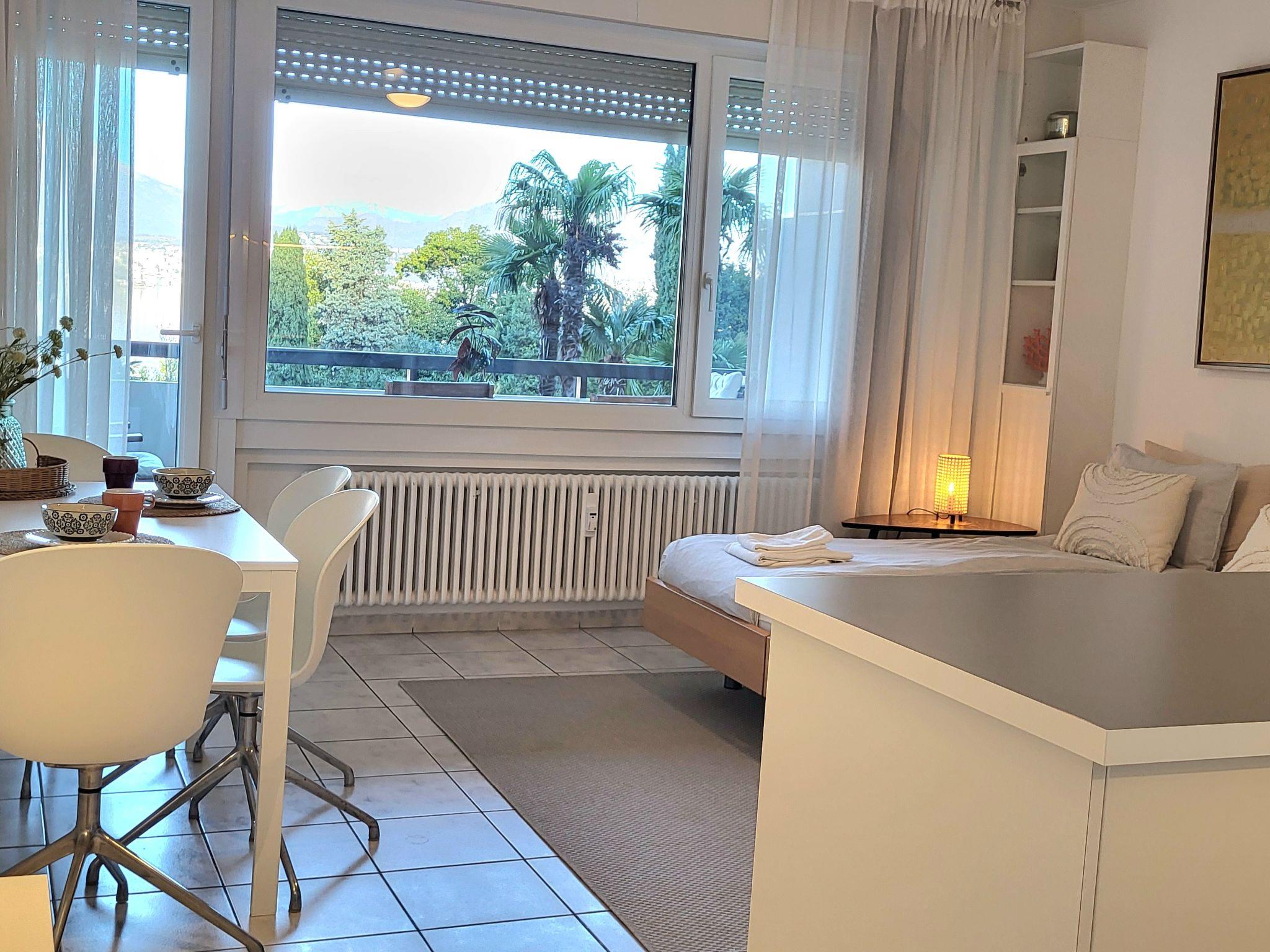 "Blue Lake Lugano Apt.312", 2-room apartment 50 m2 on 3rd floor, north-west facing position. Object suitable for 2 adults + 2 children. Spacious and bright, beautiful and modern furnishings: living/sleeping room with 2 beds (90 cm, length 200 cm), international TV channels, flat screen and air conditioning. Exit to the balcony, north-west facing position. 1 open double bedroom, without window with 1 x 2 bunk beds (90 cm, length 200 cm), fan. Open kitchen (oven, 2 ceramic glass hob hotplates, electric coffee machine, Capsules for coffee machine (Nespresso) extra). Shower/WC. Natural stone floors. Small balcony 10 m2, north facing position and west facing position. Terrace furniture. Marvellous view of the lake, the countryside and the resort. Facilities: children's high chair, baby cot for up to 2 year olds (extra), hair dryer. Internet (WiFi, free, Bandwidth: 500 Mbit/s). Parking at the house. Please note: non-smokers only.