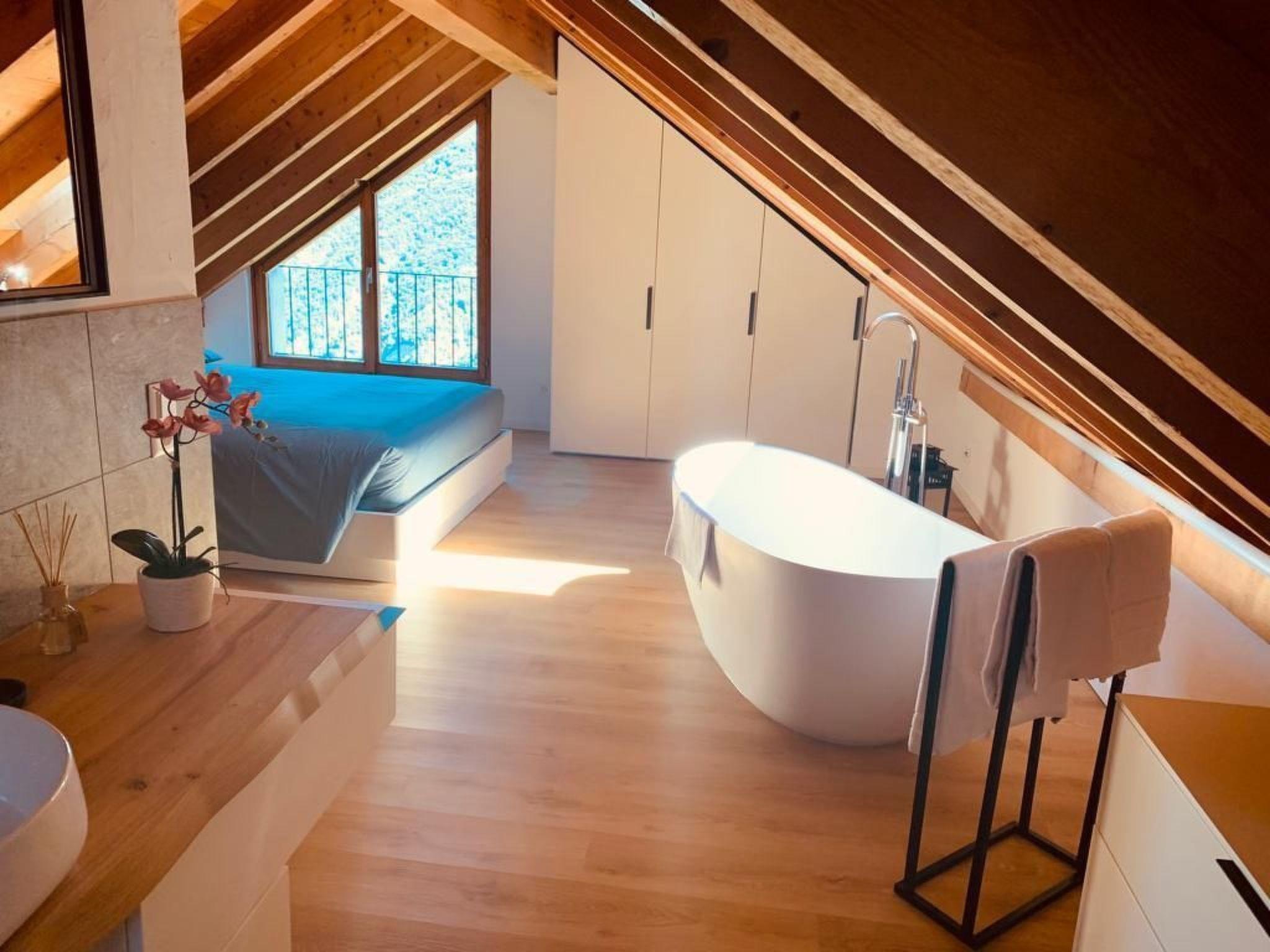 Inside, the house is spread over 3 floors connected by a charming spiral staircase. On the upper floor, you will find a romantic attic room with a double bed (160x200 cm) and an open-plan bathroom with a freestanding bathtub from which to admire the valley below. On the second floor, a room with a 120x200 cm bed offers a wide view, and a second room has two single beds (90x200 cm). The bathroom, complete with shower and toilet, provides privacy and comfort. On the first floor, next to the living room with fireplace, there is a large and super-equipped kitchen, equipped with combi-oven, refrigerator, induction stove, dishwasher and much more, ideal for preparing delicious dinners to be enjoyed on the extendable table or on the comfortable sofa in front of the TV.