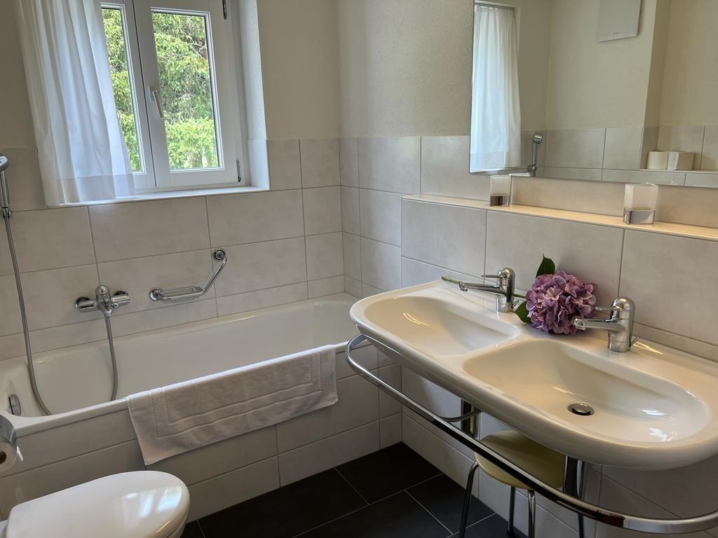 It has a bathroom with 2 washbasins as well as a bathtub, a small bathroom with toilet and washbasin. And a bathroom with shower and washbasin.