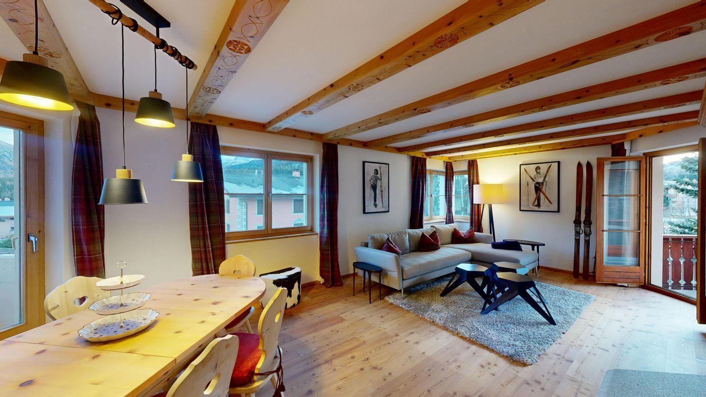 An zentraler Lage in Celerina befindet sich diese grosszügige 4.5-Zimmer-Wohnung in einem ruhigen Dreiparteienhaus. Die Wohnung überzeugt durch ihre hochwertige Ausstattung, den durchdachten Grundriss und eine geschmackvolle Einrichtung mit modernen Möbeln, Holz- und Kunstelementen.
