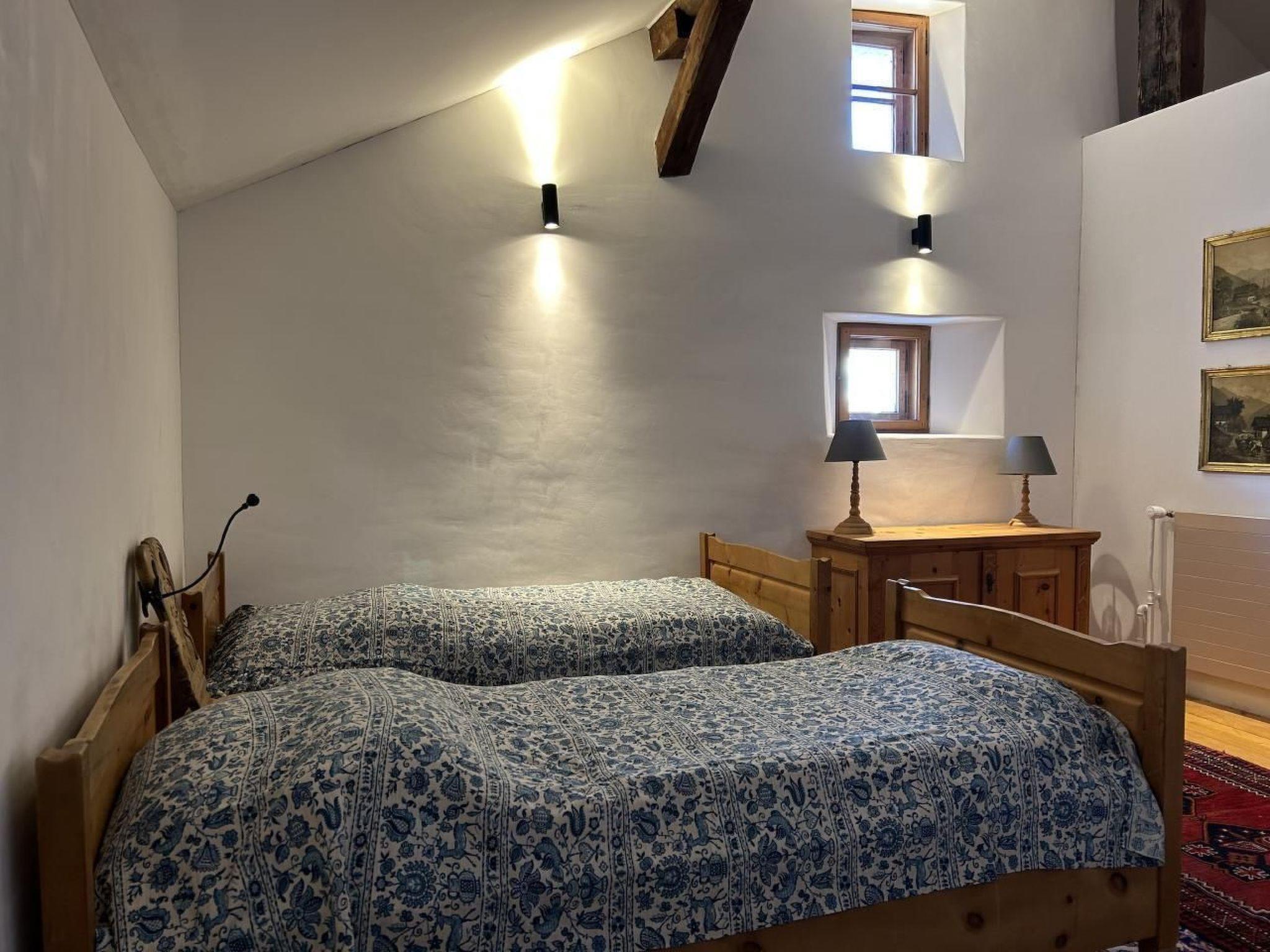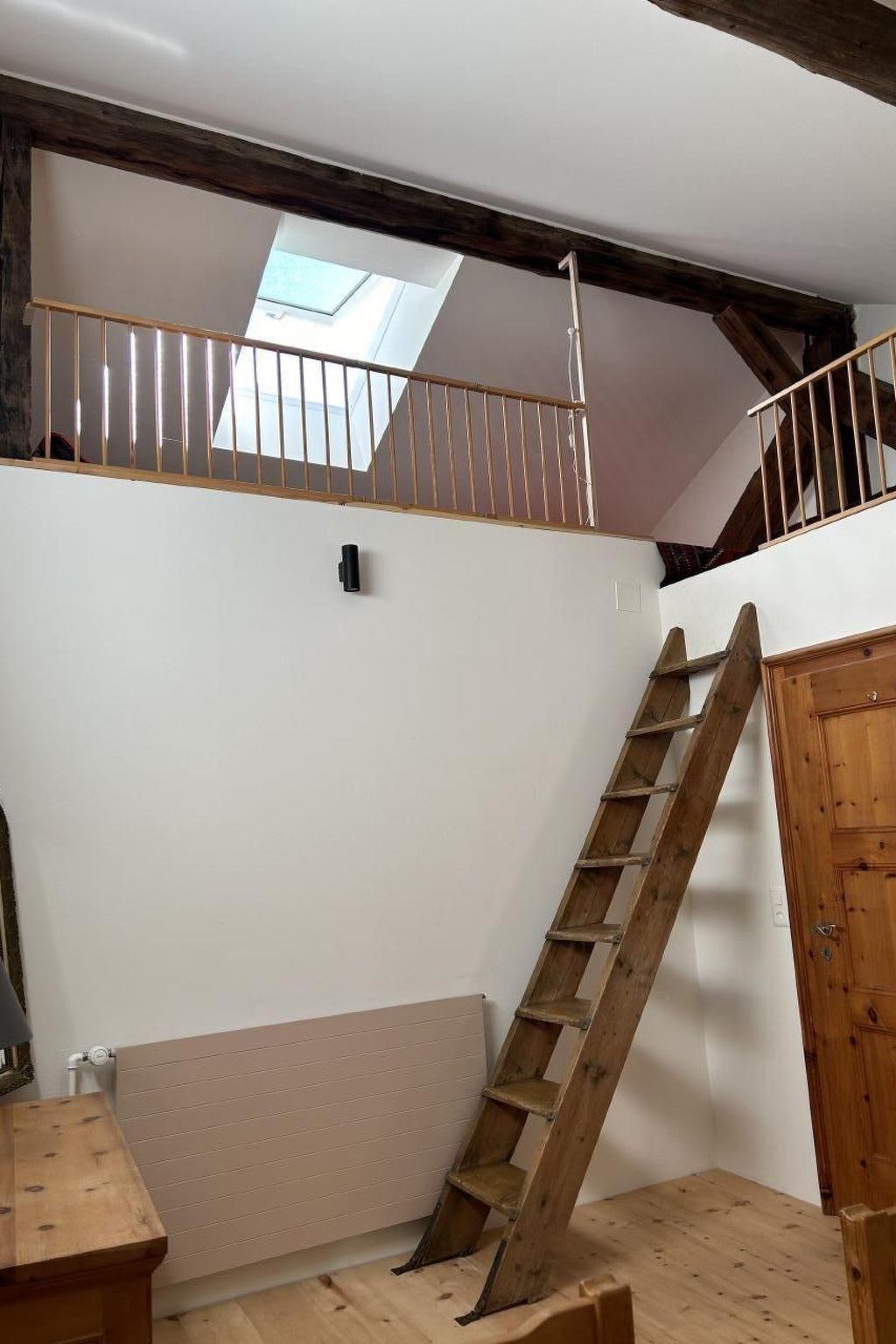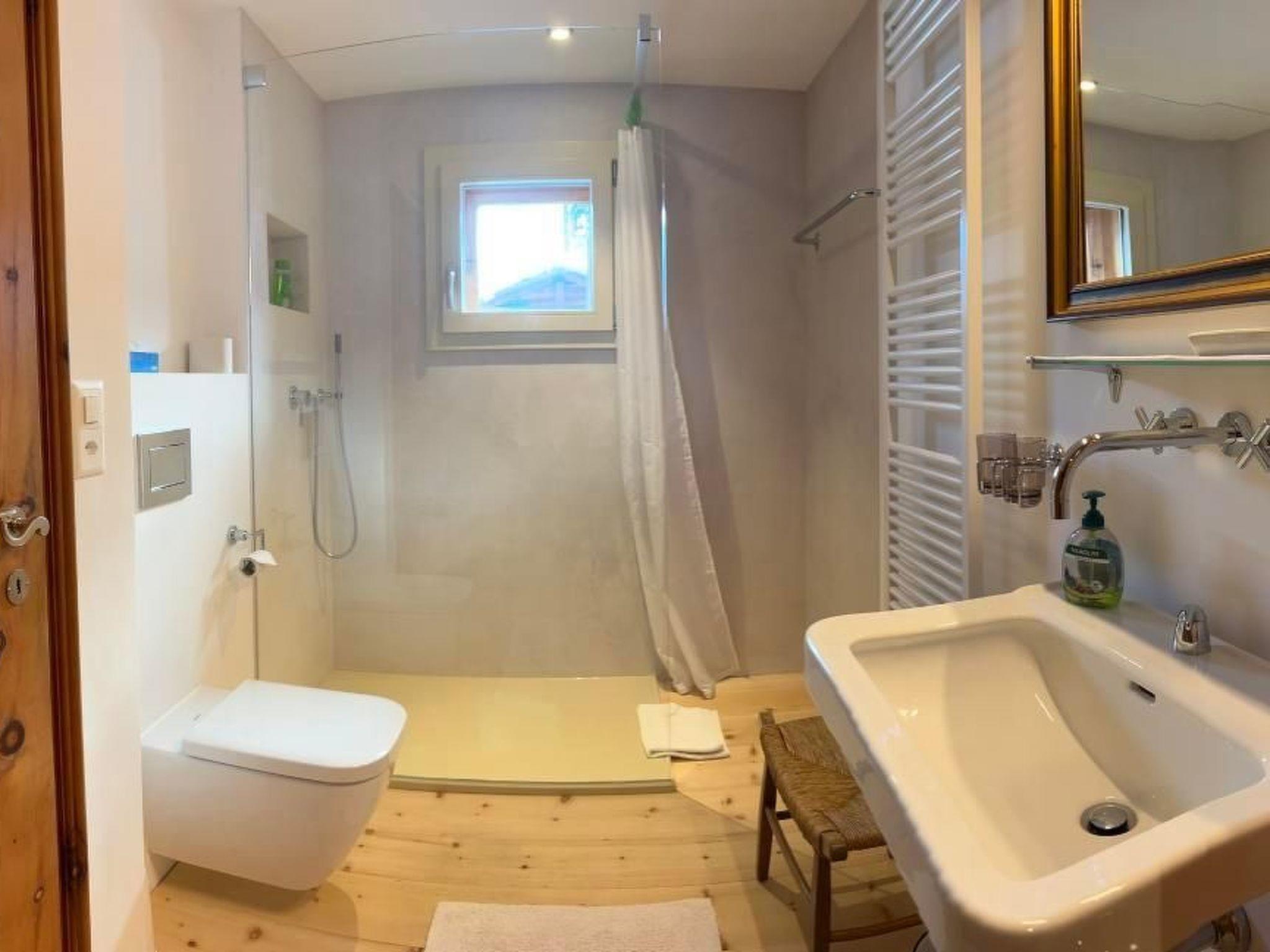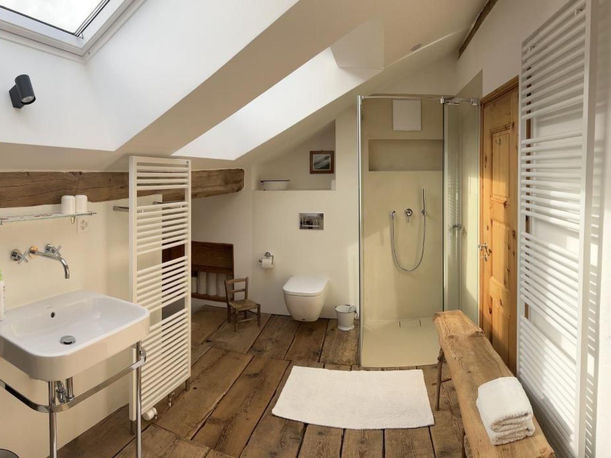 There are two sleeping areas on the upper floor, separated by the large gallery. The south-west facing area has a room with a large double bed and a room with a single bed. In between is a modern bathroom with a walk-in shower. The rooms have large south-west-facing windows and smell pleasantly of Swiss stone pine thanks to the panelling.