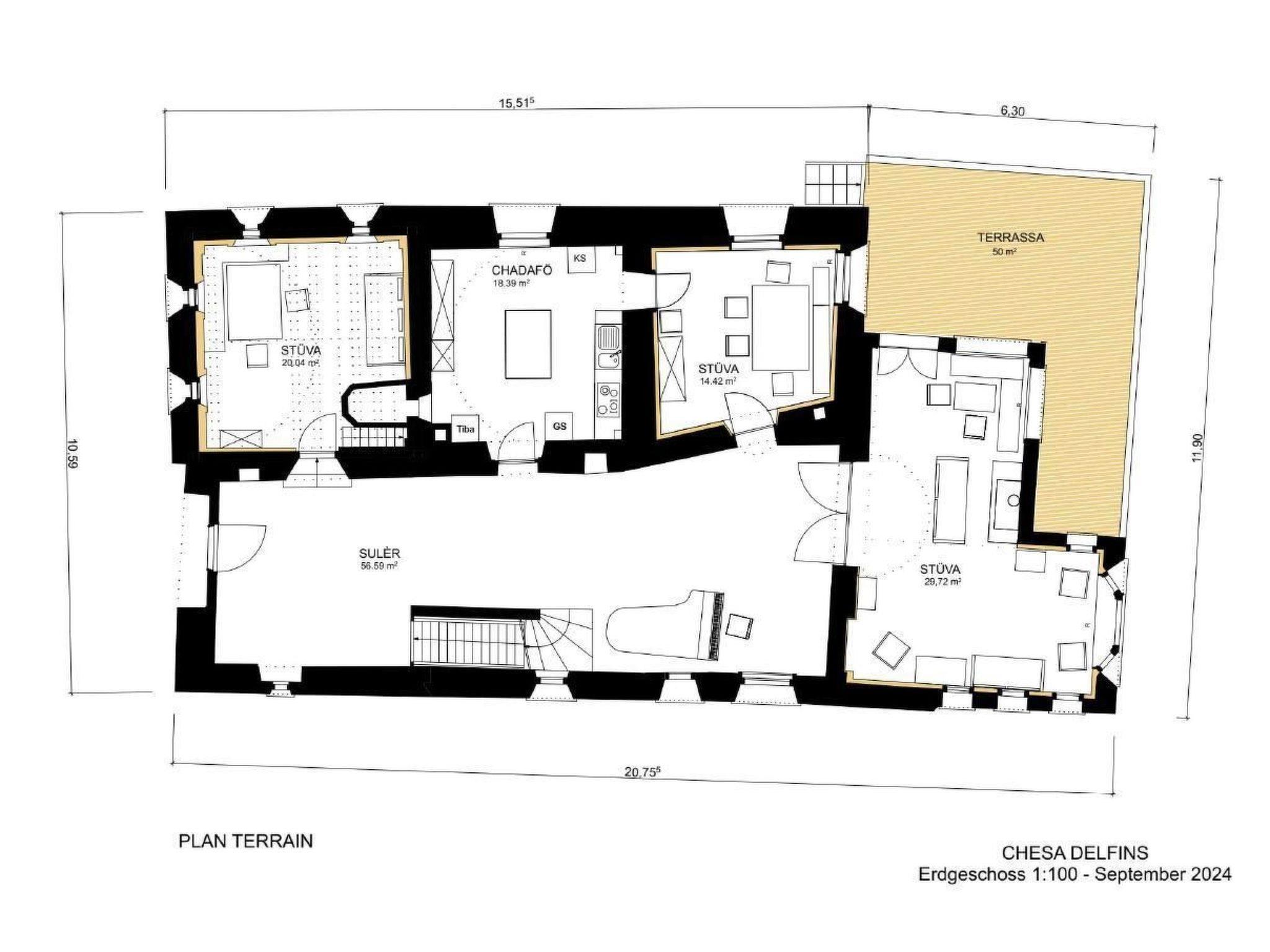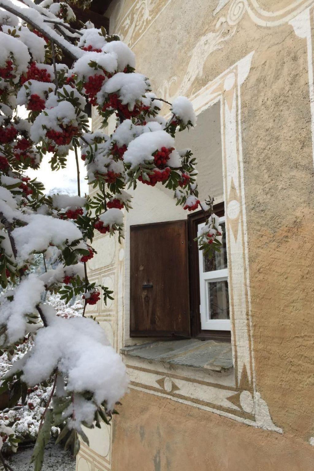 Like many old houses, the Chesa Delfins has been remodelled by its inhabitants over the centuries. However, the façades facing the village with their sgraffito, gate and small windows have been authentically preserved. In the 1930s, the dilapidated hay barn was replaced by an extension with a terrace and new bedrooms and bathrooms were built in the attic.