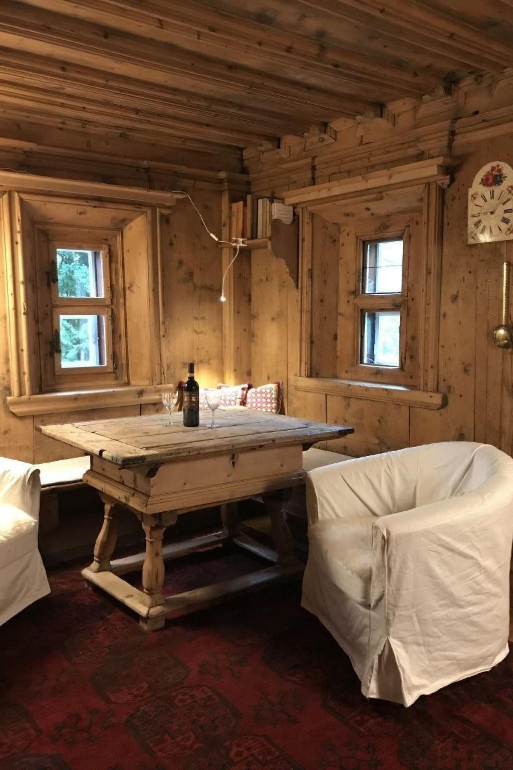 From the Sulér, you enter through the old barn door into a spacious living room with a fireplace and various seating areas. From there you continue onto the large terrace, into the fenced garden and onto the meadow in front of the house. The house is surrounded by 1500 square metres of land.