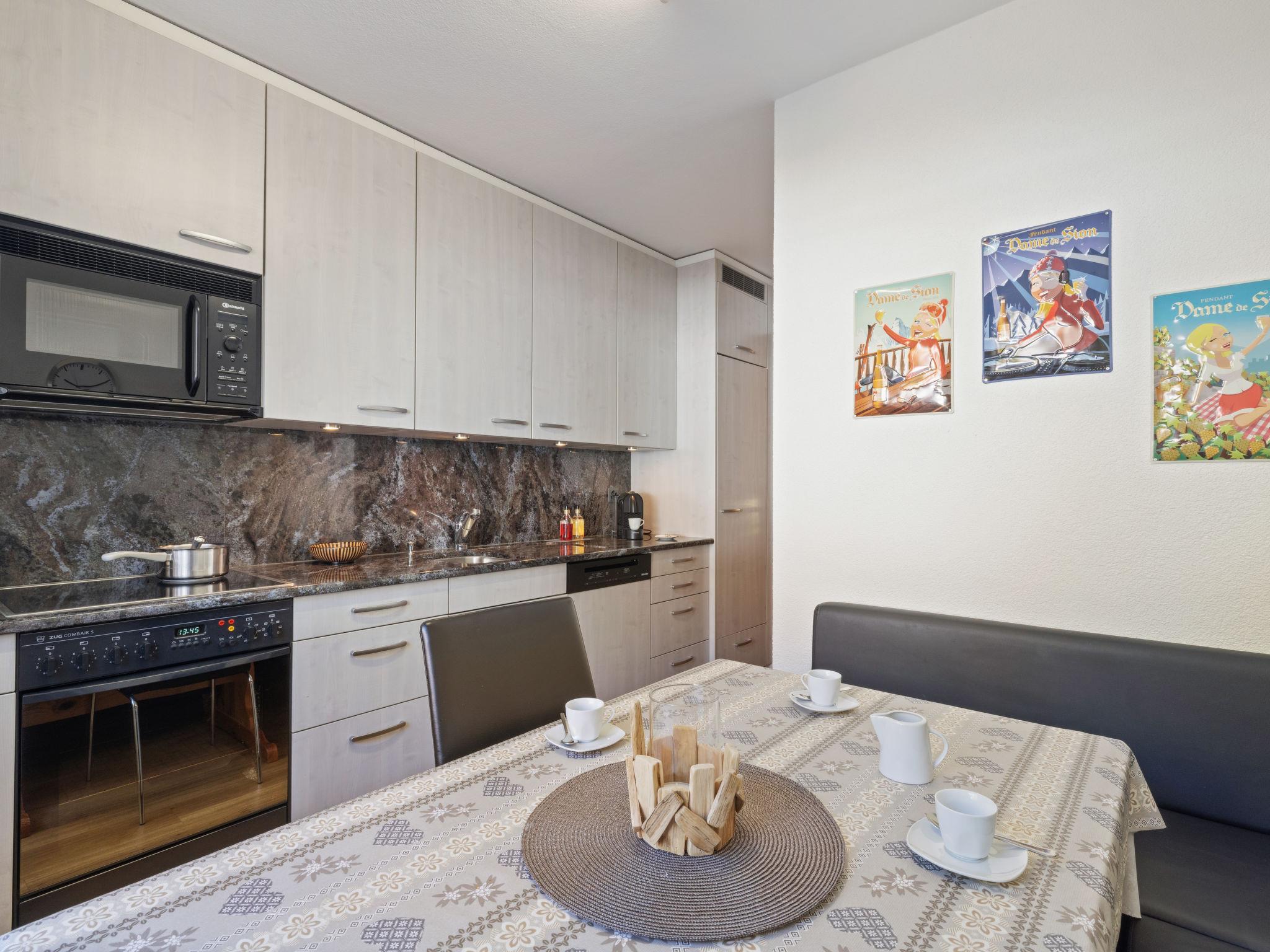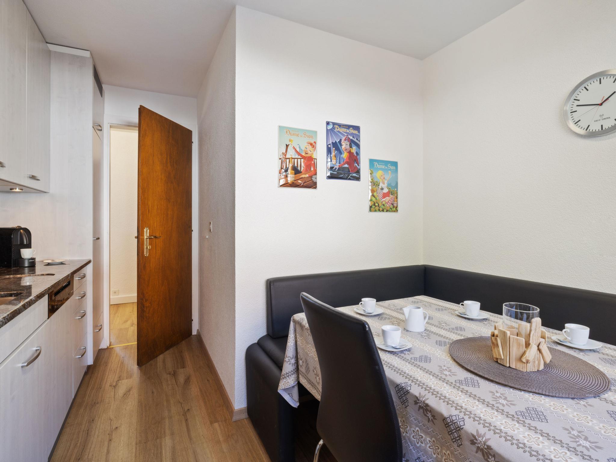 "Vermala Soleil B1", 4-room apartment 100 m2, on the upper ground floor. Fully renovated in 2016, beautiful furnishings: living/dining room with cable TV, flat screen, video, radio and DVD. 1 room with 1 french bed (160 cm, length 200 cm), cable TV (flat screen). Exit to the balcony, south facing position. 1 room with 1 french bed (160 cm, length 200 cm). 1 children's room with 2 x 2 bunk beds (90 cm, length 190 cm). Kitchen (oven, dishwasher, 4 ceramic glass hob hotplates, toaster, kettle, microwave, electric coffee machine, Capsules for coffee machine (Nespresso) extra, raclette grill, fondue Set (chinoise, cheese)) with dining table. Bath/WC, shower/WC, double hand-basin. Large balcony 15 m2, south facing position and west facing position. Balcony furniture, deck chairs (2). View of the mountains and the countryside. Facilities: iron, hair dryer. Internet (WiFi, free). Garage space n 26 at 15 m, height 200 cm, width 230 cm. Please note: non-smokers only.