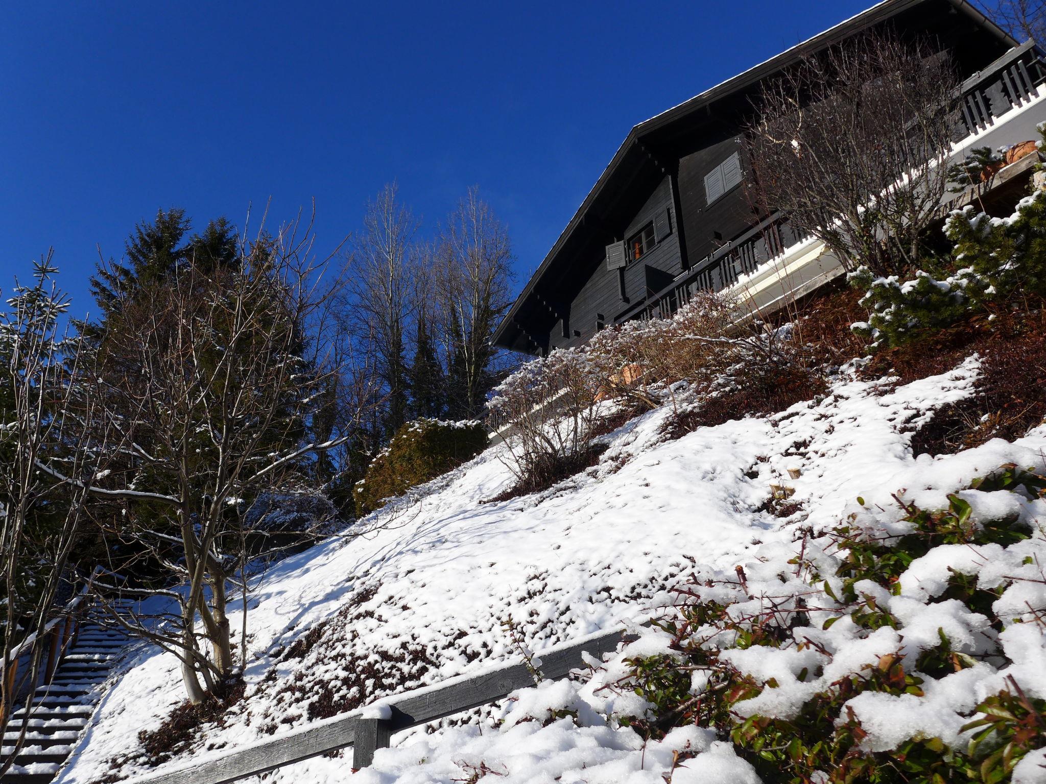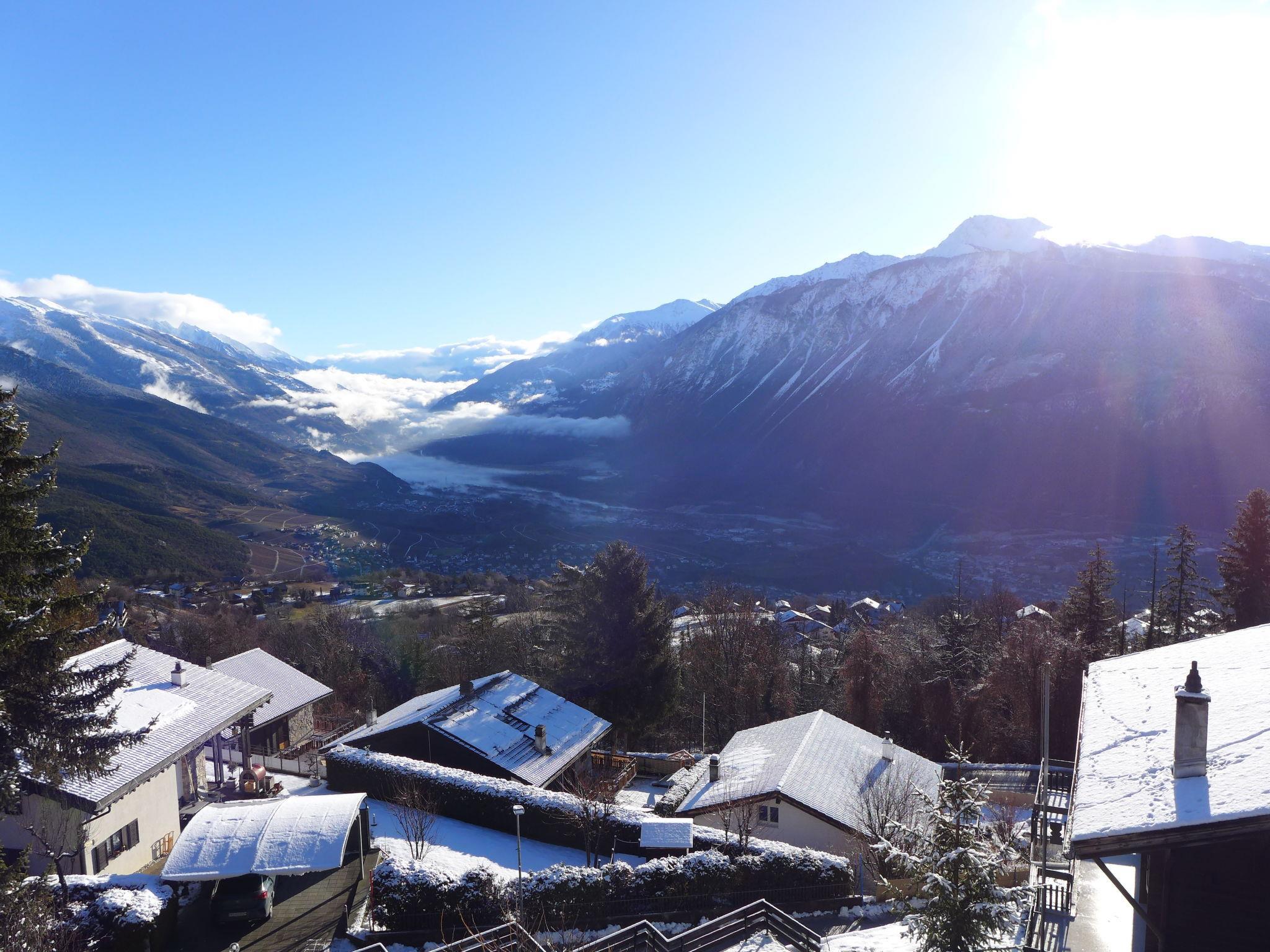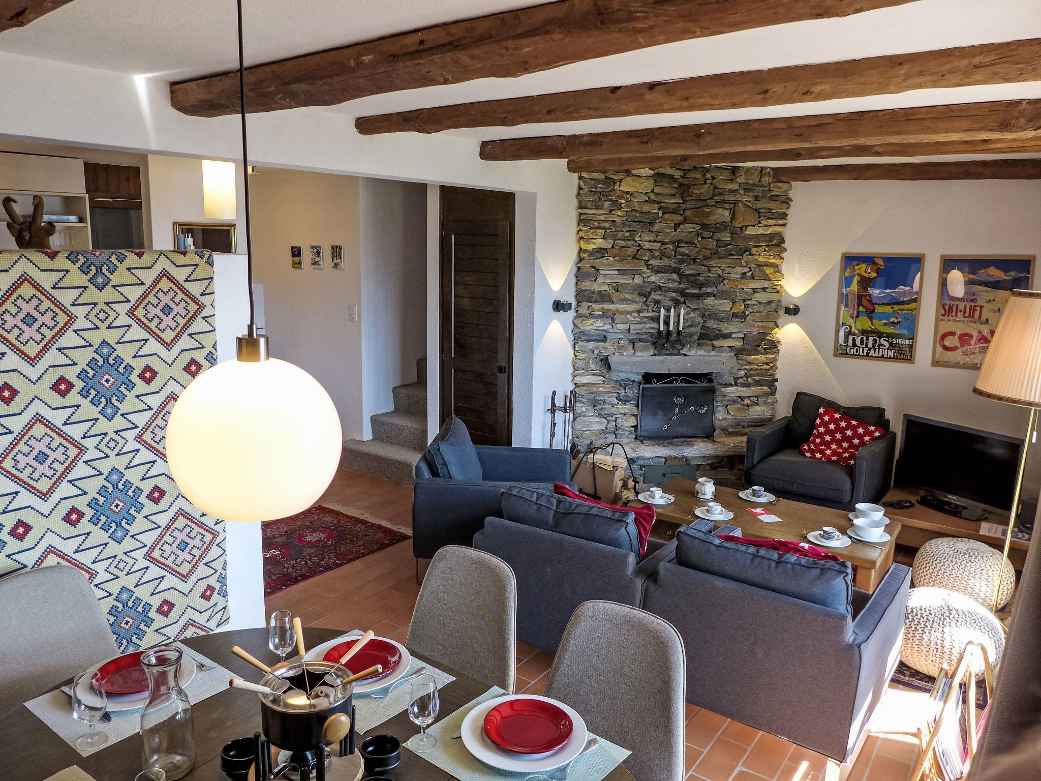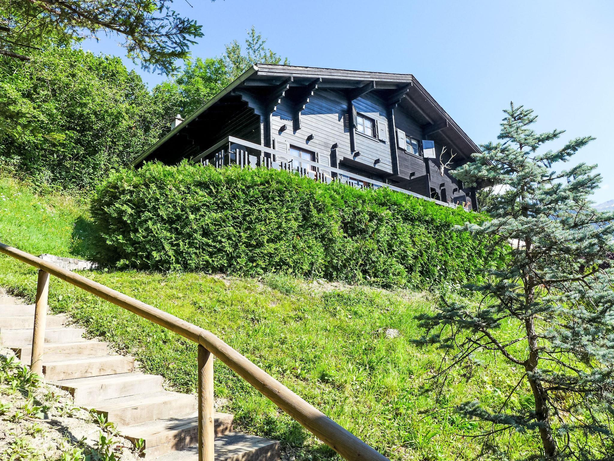 Mollens 7 km from Crans-Montana: Comfortable chalet "Sans Nom", 3 storeys, terraced, surrounded by trees. Above Mollens, in a quiet, sunny, elevated position, traffic calmed area, 6 km from the lake, 5 km from the skiing area, 20 m from the stream, in the countryside, south facing position. Private: garden with lawn, natural garden 500 m2. In the house: central heating system, drying room. Steep motor access. In Winter: please take snow chains, 4x4 car recommended in winter. Stepped path (40 steps) to the house. Shop 5.2 km, grocery 950 m, supermarket 5.5 km, restaurant 1.1 km, bakery 4.7 km, bus stop "Randogne, La Côte" 350 m, railway station "Funiculaire Bluche" 1.9 km, bathing lake "Moubra" 6.4 km, lake Grenon 6 km. Golf course (18 hole) 7.3 km, skisport facilities 5 km. Well-known ski regions can easily be reached: Lac Moubra 6.4 km, Etang Long 7.2 km. Please note: car recommended. The owner does not accept any youth groups.