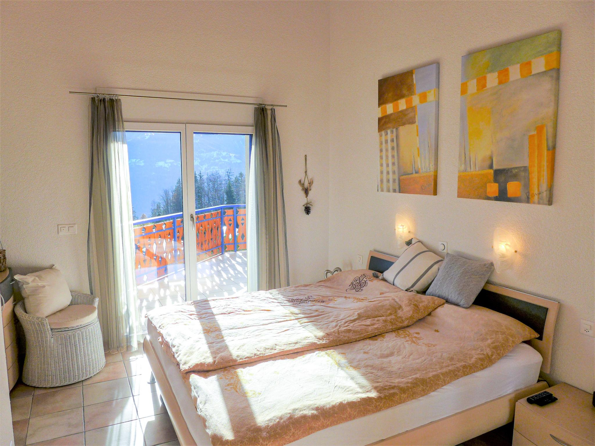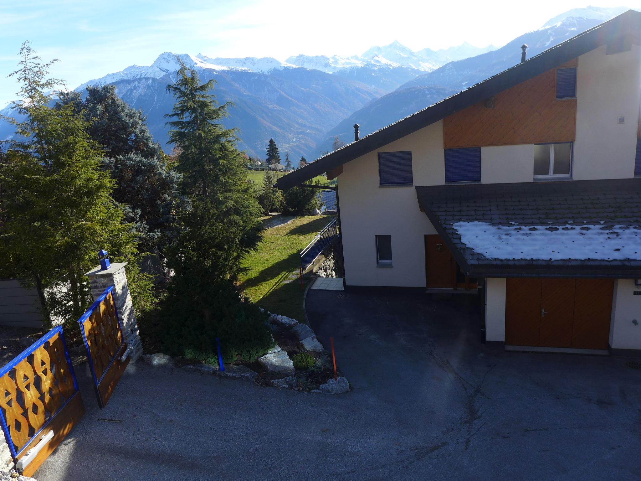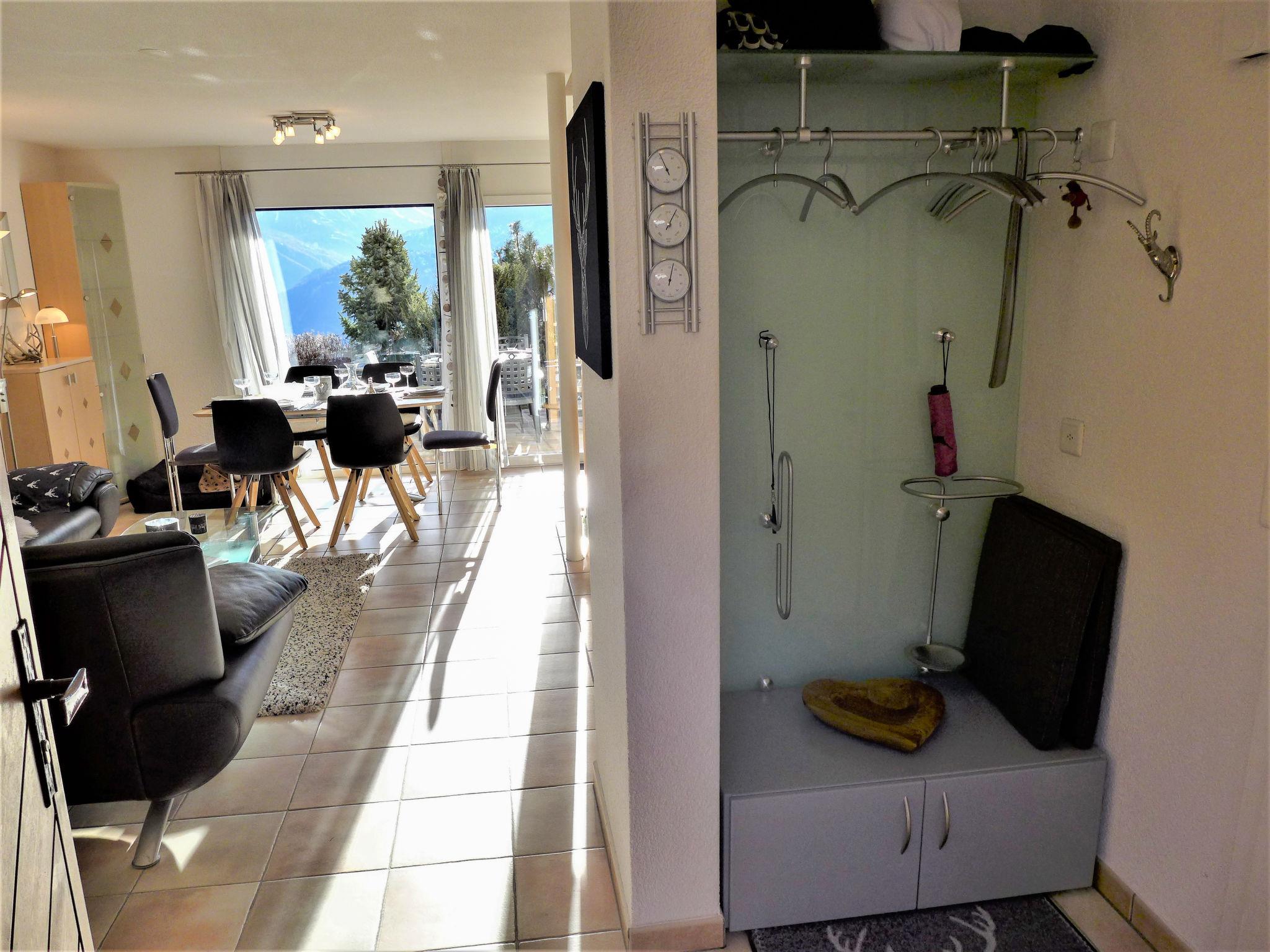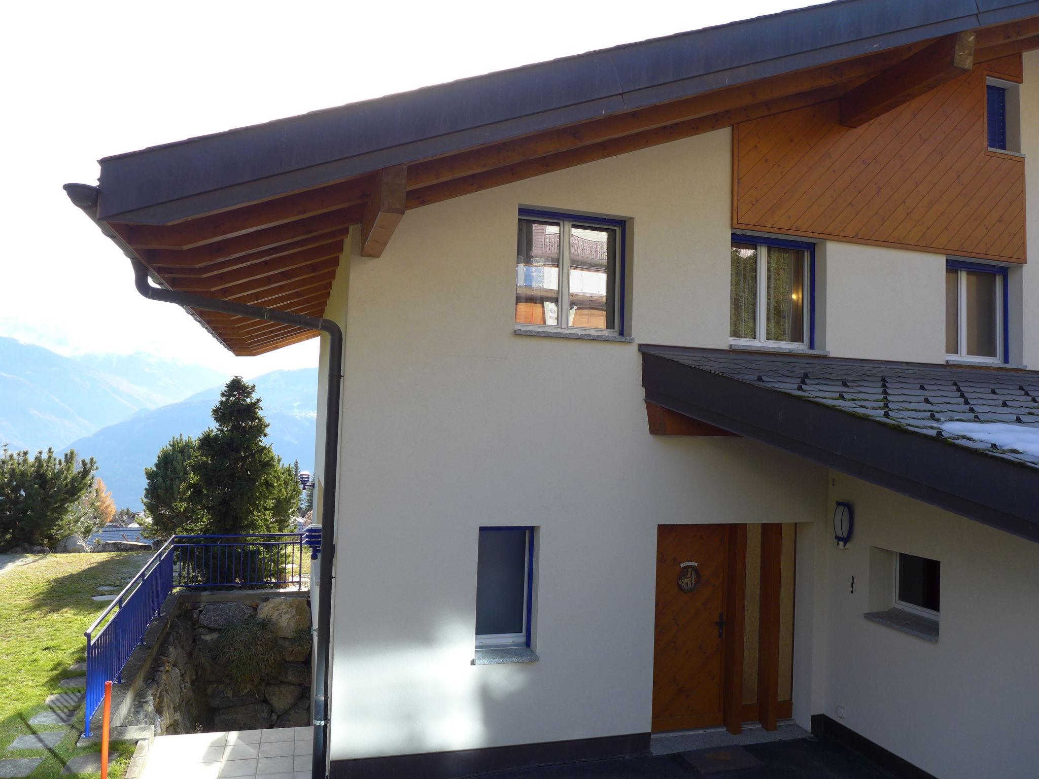 "Maison N°35", 4-room terraced house 75 m2 on 2 levels. Object suitable for 4 adults + 2 children. Spacious and bright, comfortable and beautiful furnishings: open living/dining room with cable TV, flat screen, radio and hi-fi system. Exit to the terrace. Kitchen (oven, dishwasher, 4 ceramic glass hob hotplates, toaster, kettle, microwave, freezer, electric coffee machine, Capsules for coffee machine (Nespresso) extra, raclette grill, fondue Set (chinoise, cheese)). Sep. WC. Upper floor: 1 room, ceiling height 300 - 400 cm with 1 french bed (180 cm, length 200 cm), TV. Exit to the balcony. 1 small room with 1 pull-out bed (2 pers. 2 x 90 cm, length 190 cm). 1 room with 1 pull-out bed (2 pers. 2 x 90 cm, length 190 cm). Exit to the balcony. Shower/bidet/WC. Large balcony, south facing position, large terrace 10 m2, south facing position. Terrace furniture, electric barbecue (portable), deck chairs (2), box-room. Marvellous panoramic view of the mountains and the valley. Facilities: washing machine, dryer, hair dryer. Internet (WiFi, free). Parking (1 car), garage (1 car), height 200 cm, width 220 cm. Please note: suitable for families. Non-smoking house.