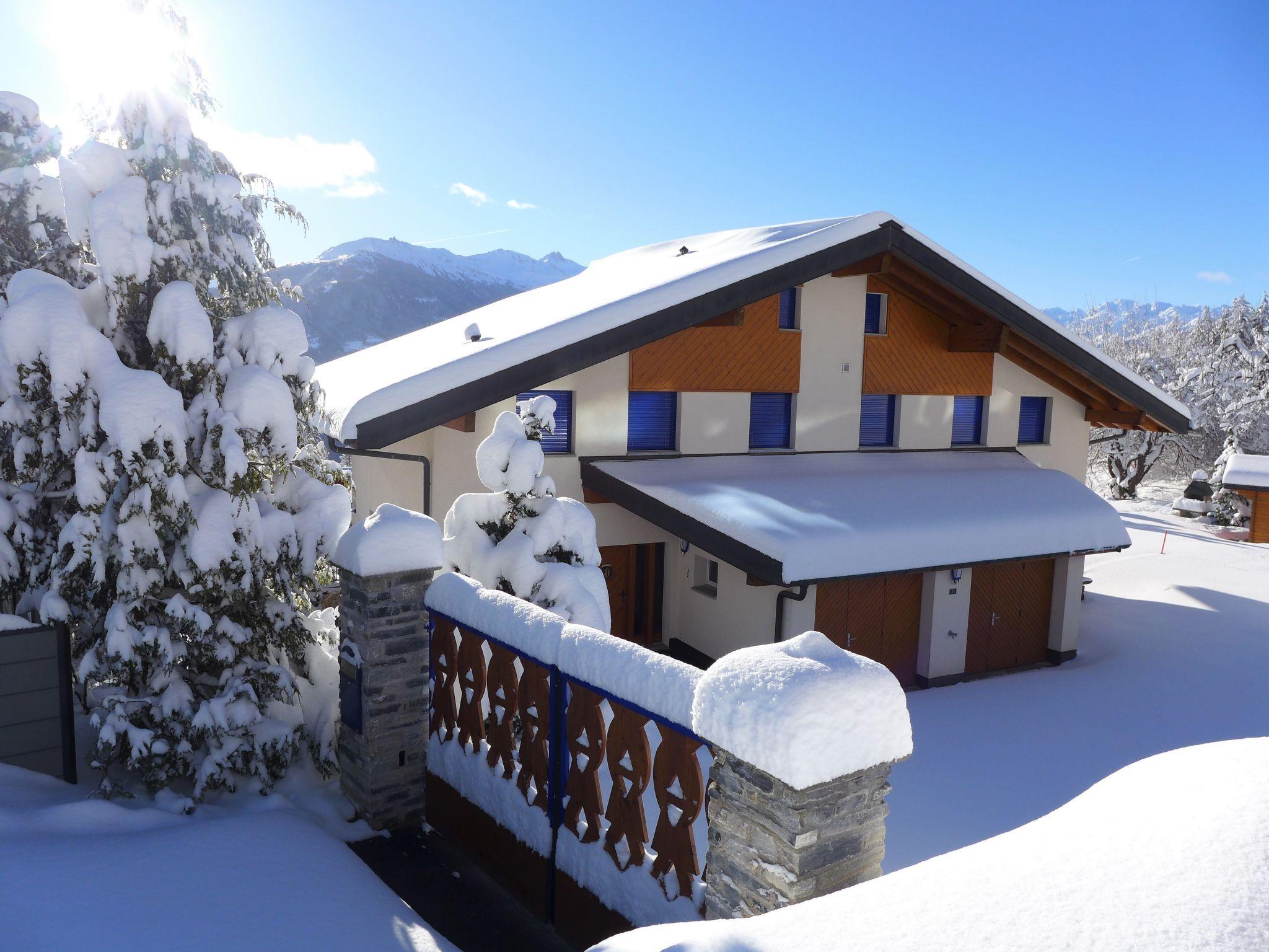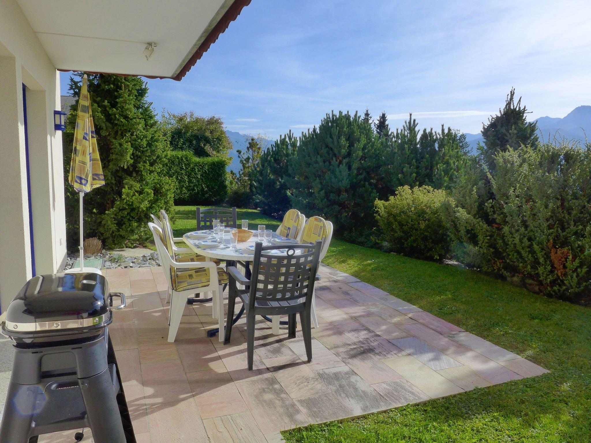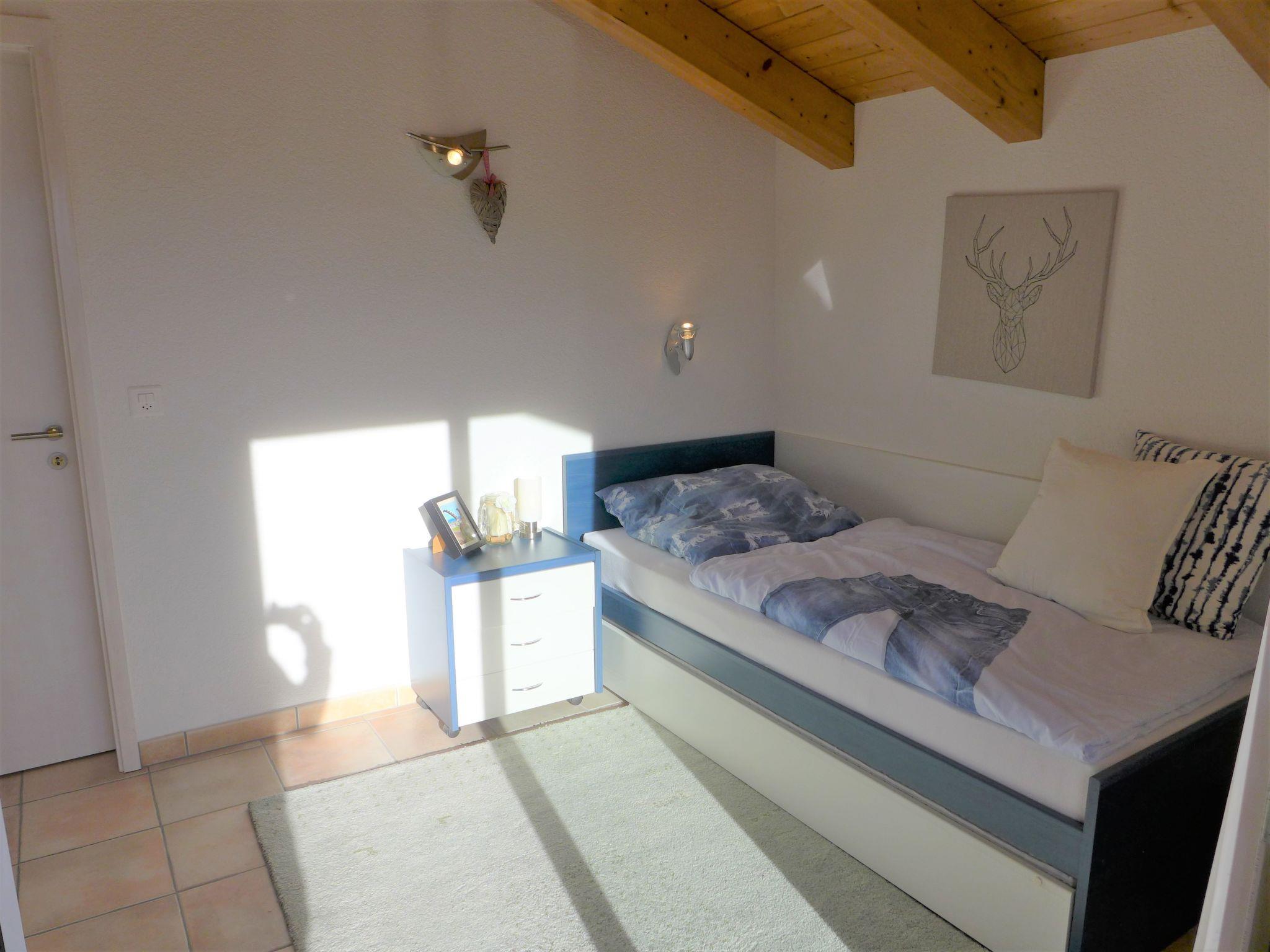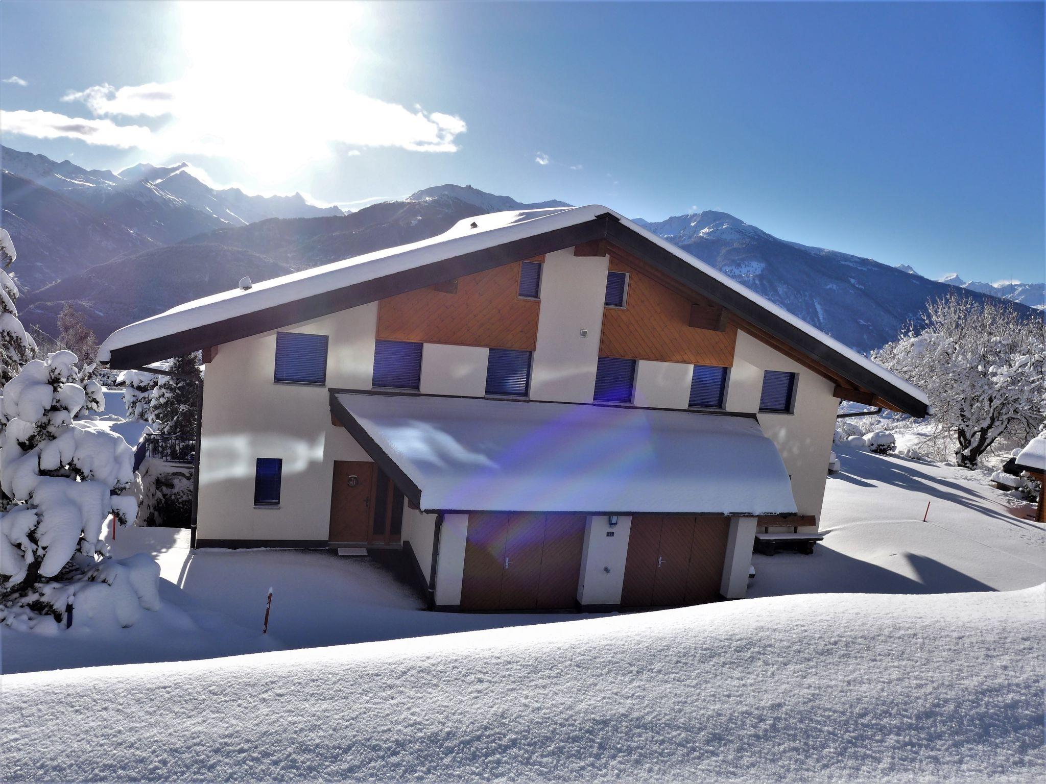 "Maison N°35", 4-room terraced house 75 m2 on 2 levels. Object suitable for 4 adults + 2 children. Spacious and bright, comfortable and beautiful furnishings: open living/dining room with cable TV, flat screen, radio and hi-fi system. Exit to the terrace. Kitchen (oven, dishwasher, 4 ceramic glass hob hotplates, toaster, kettle, microwave, freezer, electric coffee machine, Capsules for coffee machine (Nespresso) extra, raclette grill, fondue Set (chinoise, cheese)). Sep. WC. Upper floor: 1 room, ceiling height 300 - 400 cm with 1 french bed (180 cm, length 200 cm), TV. Exit to the balcony. 1 small room with 1 pull-out bed (2 pers. 2 x 90 cm, length 190 cm). 1 room with 1 pull-out bed (2 pers. 2 x 90 cm, length 190 cm). Exit to the balcony. Shower/bidet/WC. Large balcony, south facing position, large terrace 10 m2, south facing position. Terrace furniture, electric barbecue (portable), deck chairs (2), box-room. Marvellous panoramic view of the mountains and the valley. Facilities: washing machine, dryer, hair dryer. Internet (WiFi, free). Parking (1 car), garage (1 car), height 200 cm, width 220 cm. Please note: suitable for families. Non-smoking house.