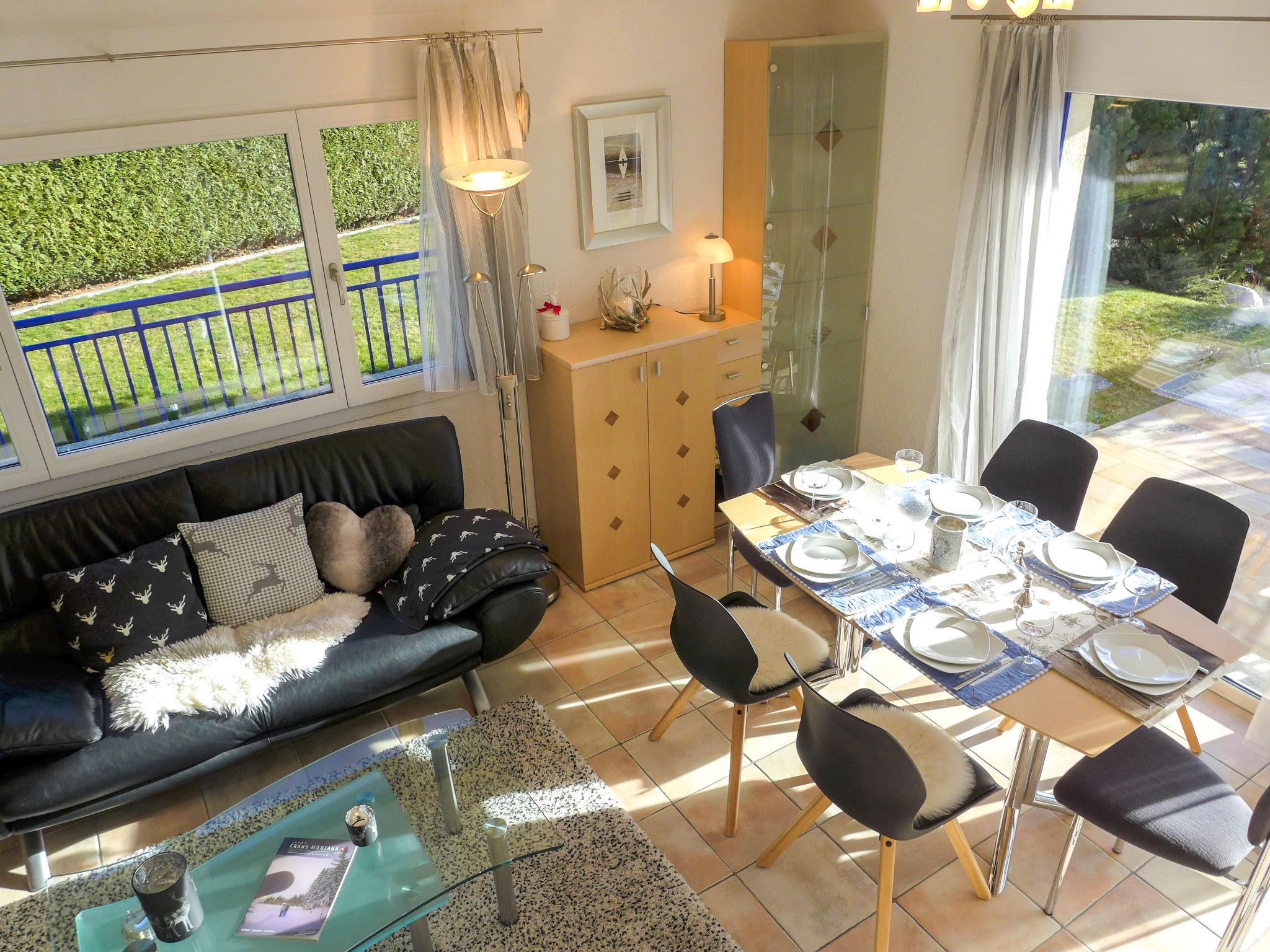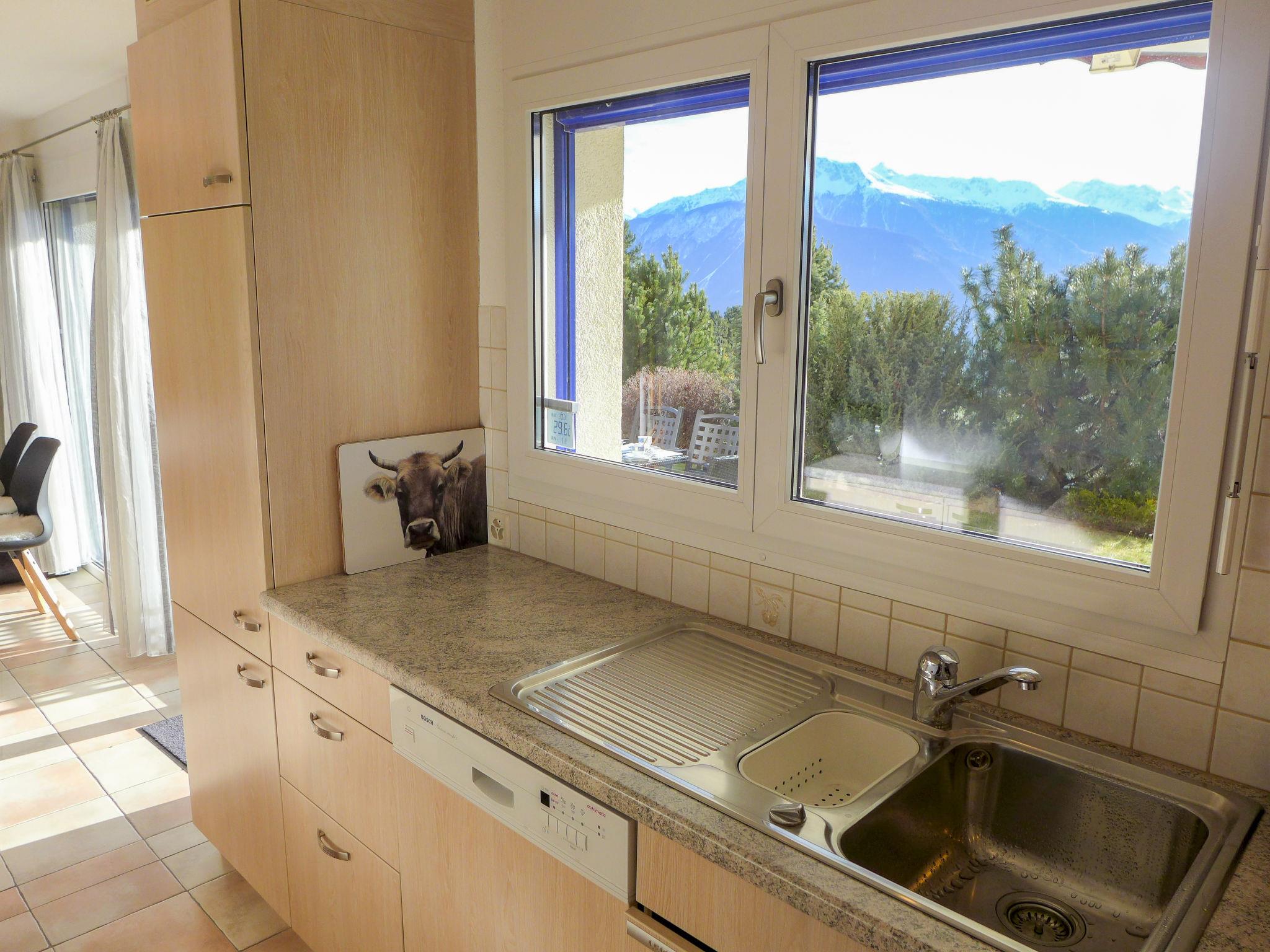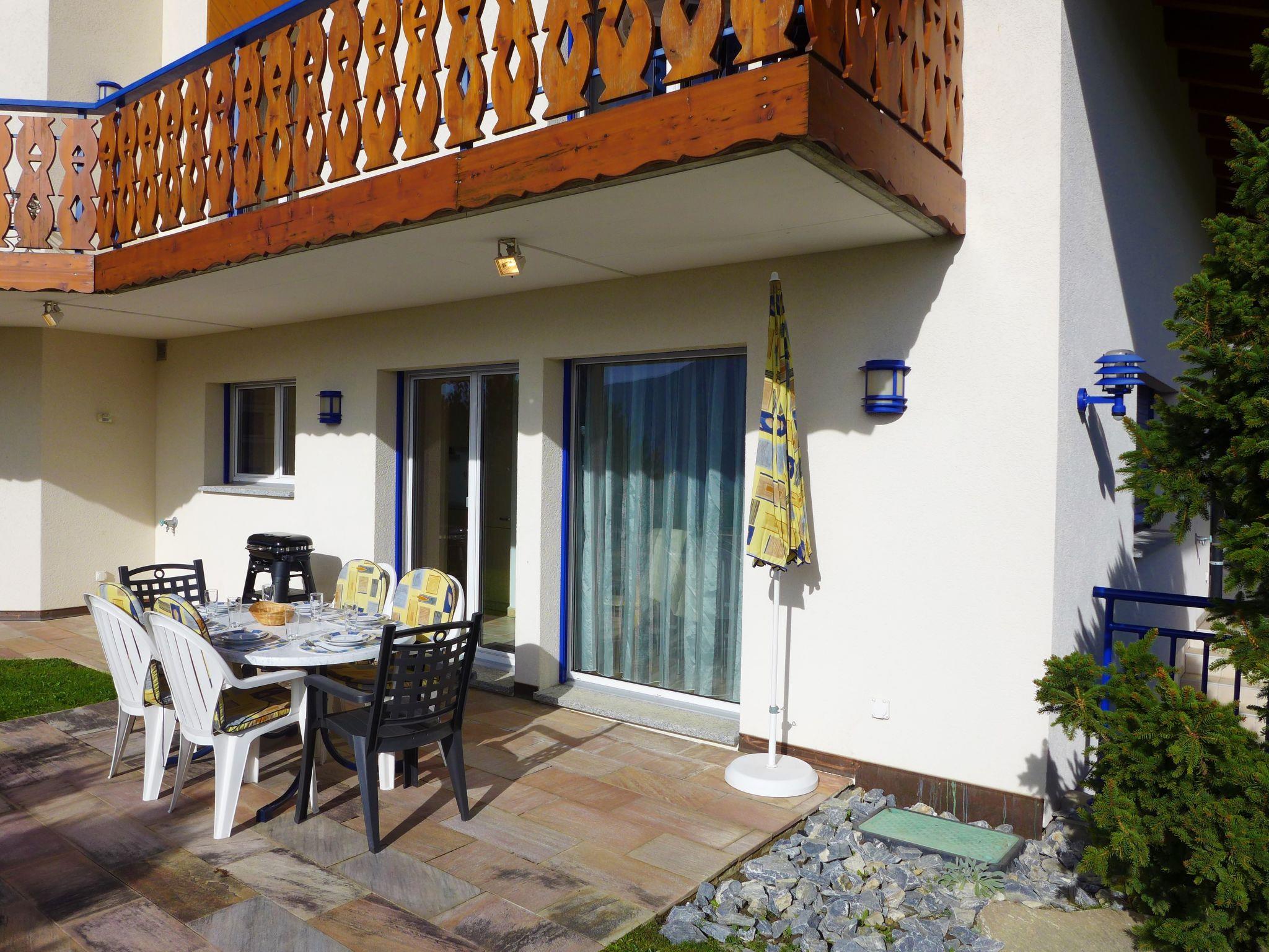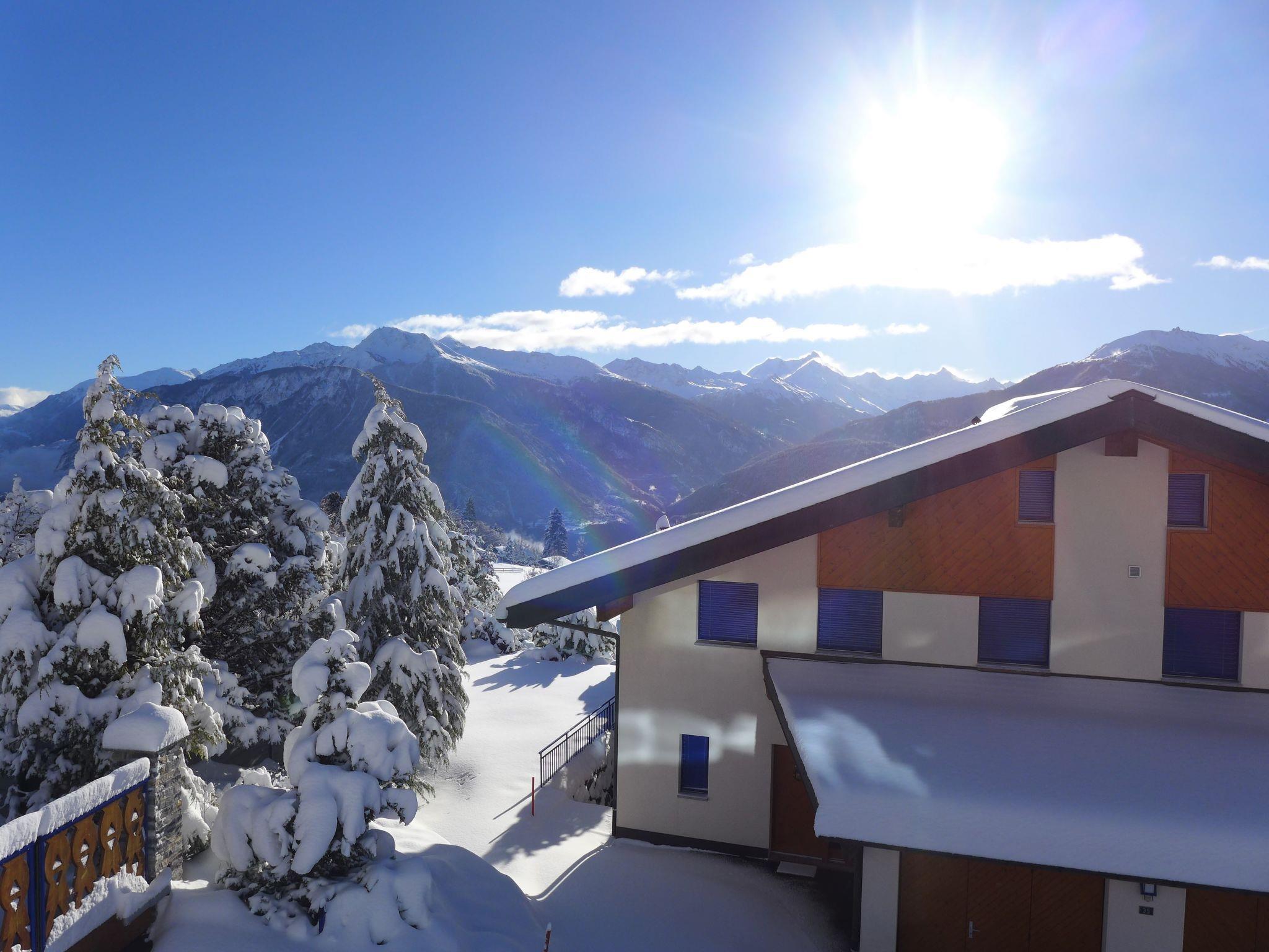 Very beautiful terraced house "Maison N°35", 2 storeys, terraced, built in 2003. In the hamlet Bluche, 4 km from the centre of Montana, in a quiet, sunny position, traffic calmed area, 100 m from the edge of the forest, 4 km from the lake, 4 km from the skiing area, in a cul-de-sac, in the countryside, south facing position. Private: garden (not fenced) lawn 15 m2. In the house: storage room for skis, central heating system, washing machine, tumble dryer. Parking (limited number of spaces), single garage. Supermarket 3.6 km, restaurant, café 500 m, bus stop "Bluche village" 900 m, railway station "Funiculaire Bluche" 900 m, bathing lake "Moubra" 4 km. Golf course (18 hole) 5.5 km, walking paths from the house 150 m, skisport facilities 3 km, ski school 4 km, cross country ski track 4 km. Well-known lakes can easily be reached: Etang Long 4.7 km, Grenon 5 km. Please note: car recommended. Object suitable for 4 adults + 2 children groups of teenagers on request only. The keys‘ handover takes place by the agency Interhome in Montana, 4 km.