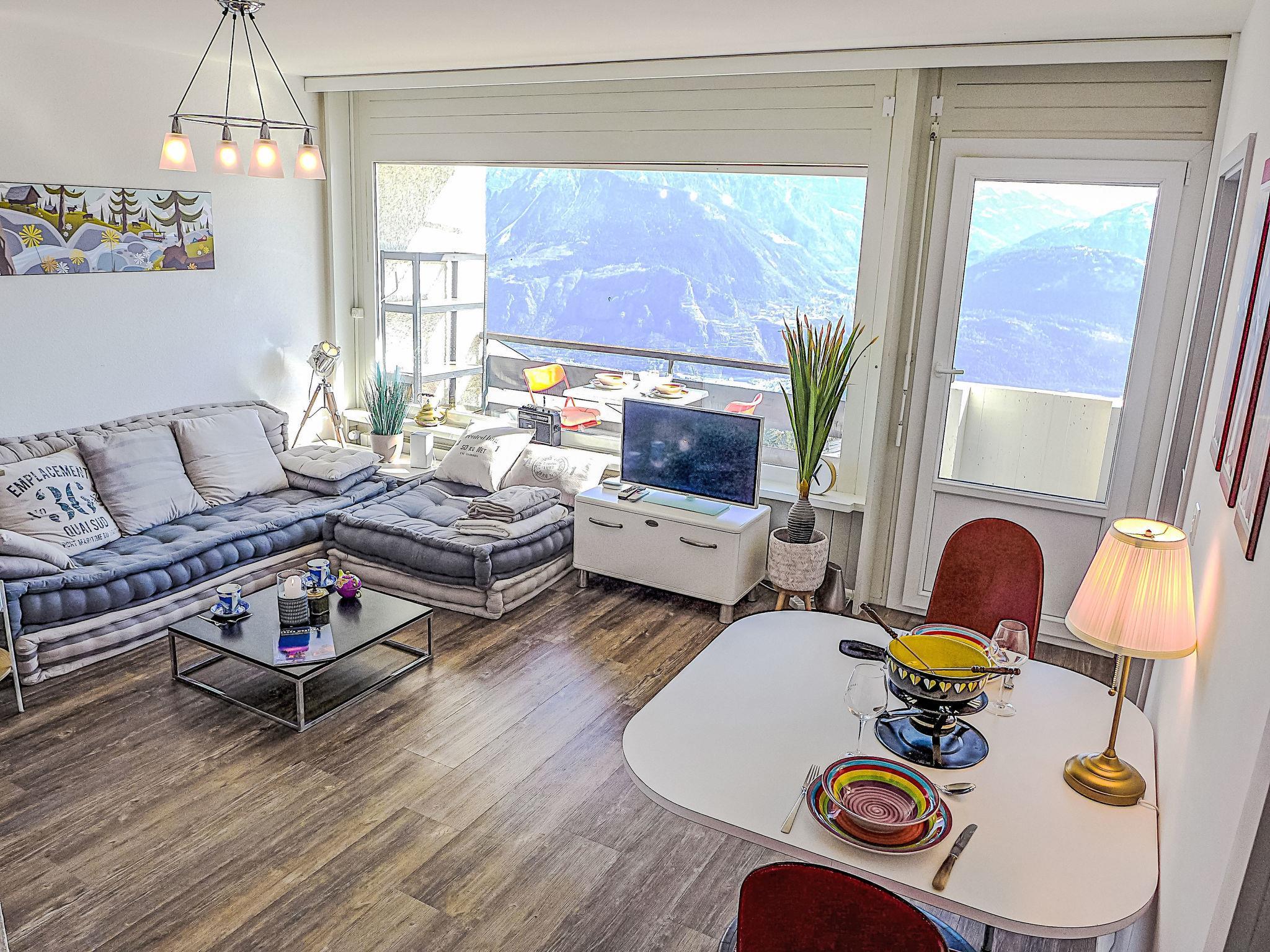 "Les Orzières 417", 2-room apartment 47 m2 on 4th floor. Bright, partly renovated in 2019, comfortable and cosy furnishings: living/dining room with cable TV. Exit to the balcony. 1 room with 1 french bed (140 cm, length 190 cm). Open kitchen (3 hot plates, oven, toaster, kettle, microwave, electric coffee machine, Capsules for coffee machine (Nespresso) extra, raclette grill, fondue Set (chinoise, cheese)). Shower/WC. Balcony 7 m2, south facing position. Balcony furniture, electric barbecue. Marvellous view of the mountains and the valley. Facilities: iron, hair dryer. Internet (WiFi, free). Garage space n 23 (1 car), height 225 cm, width 215 cm. Please note: non-smokers only. Maximum 1 pet/ dog allowed.