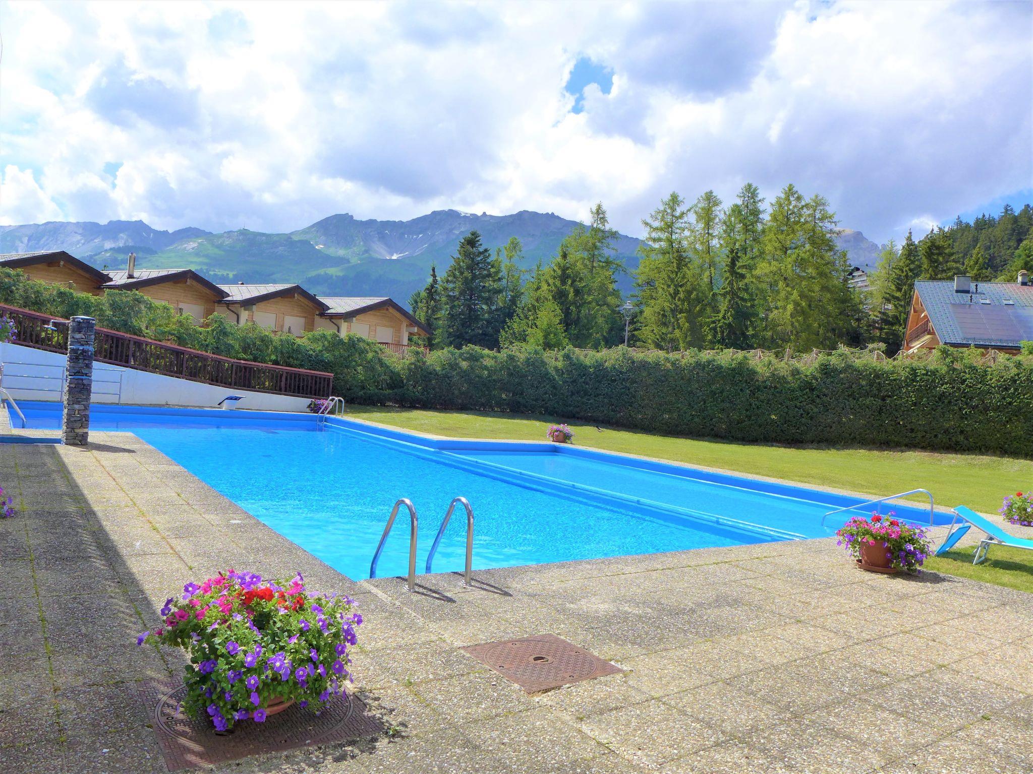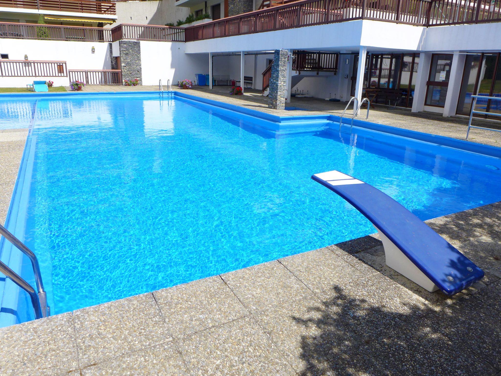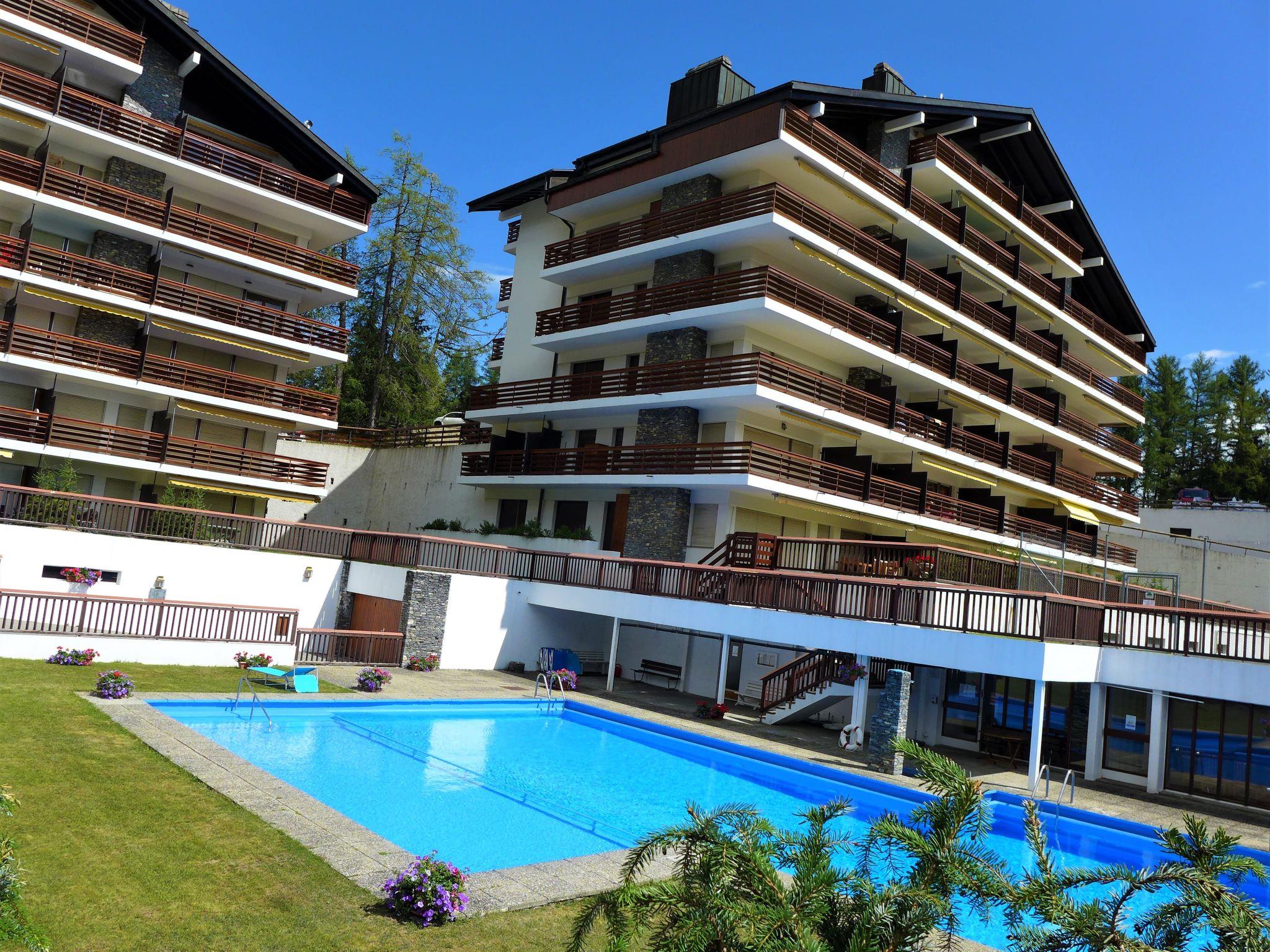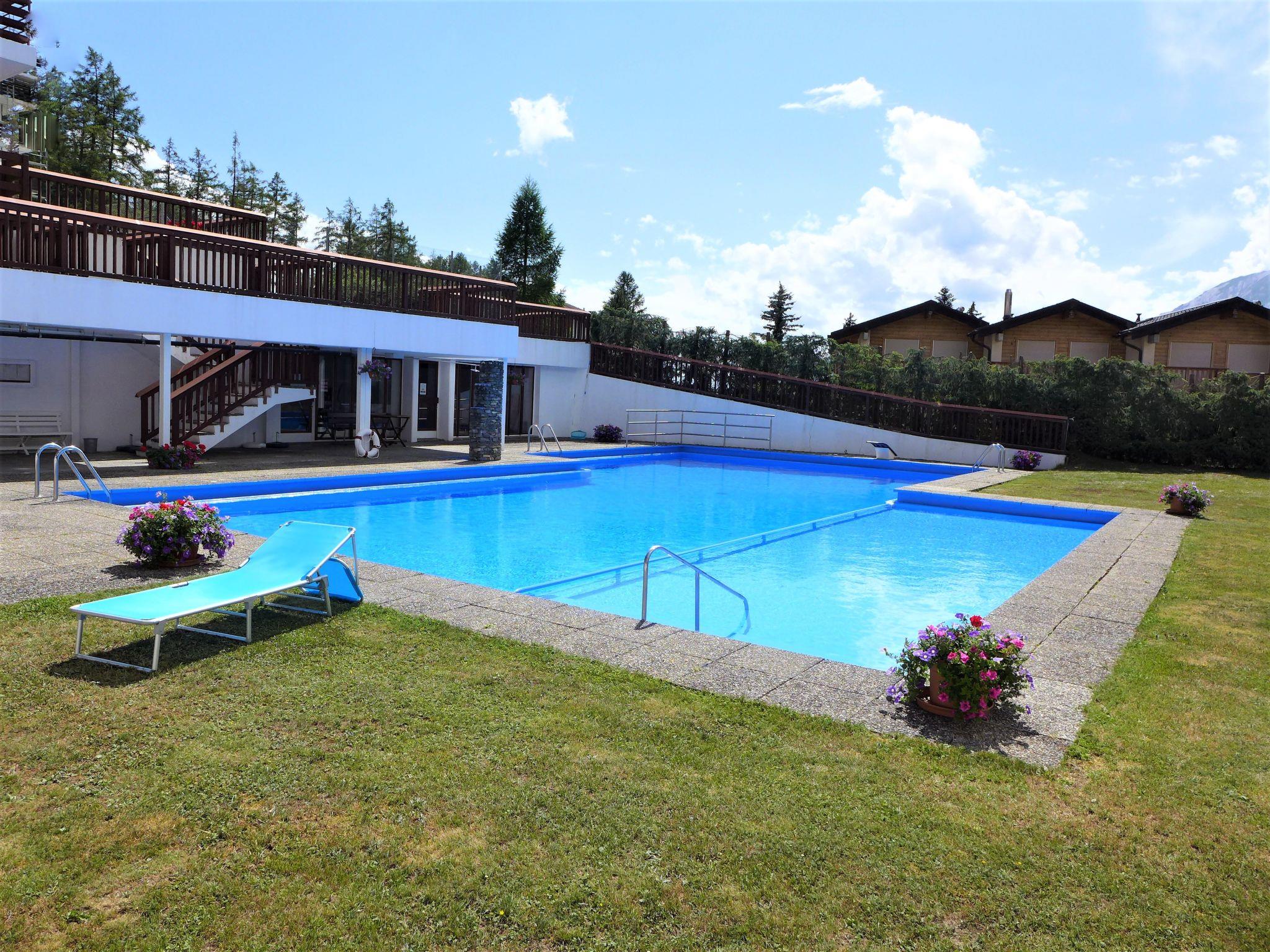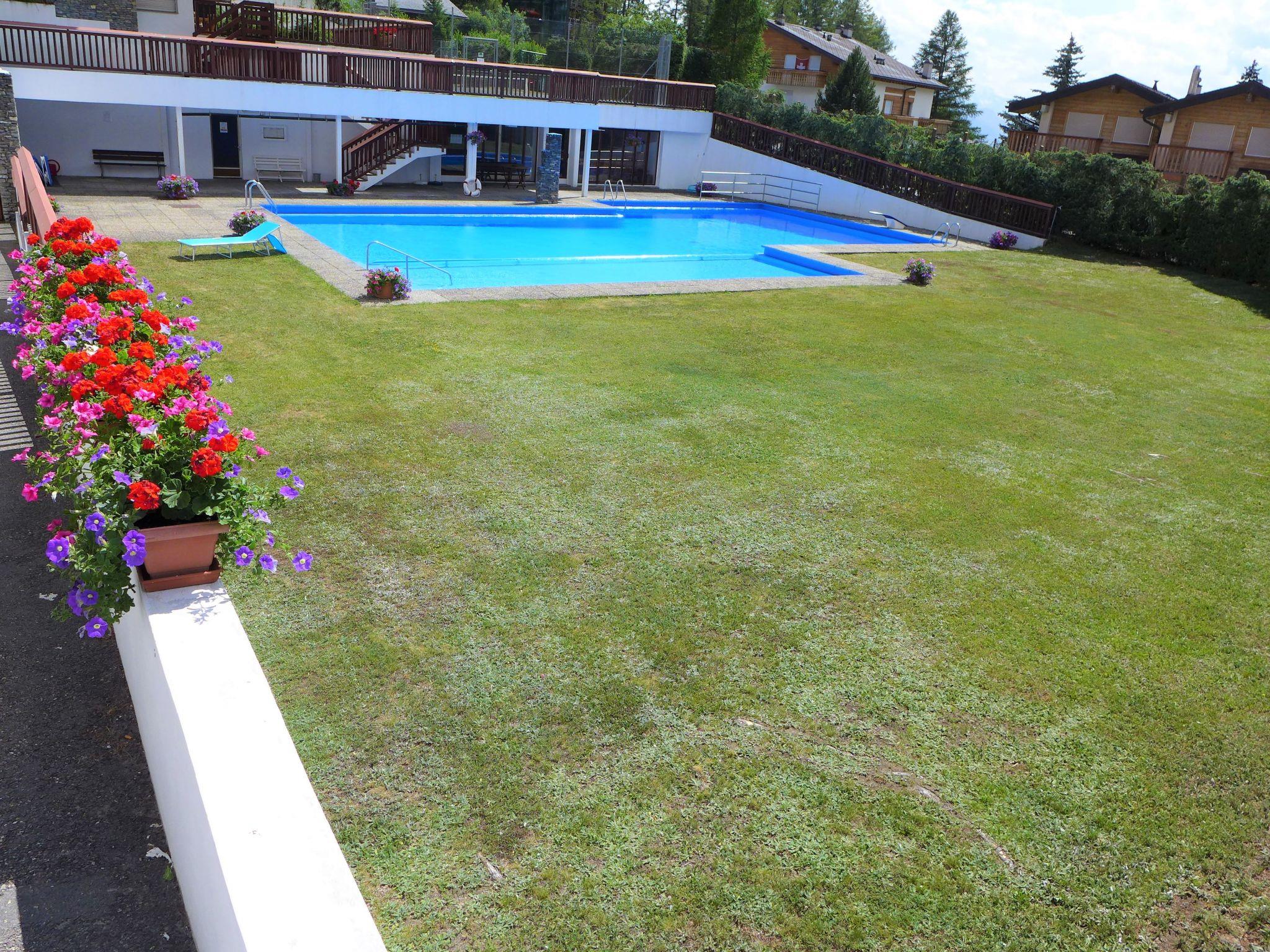 Large residence "Valdor". 1 km from the centre of Crans, 1 km from the lake, south-west facing position. For shared use: garden (not fenced) with lawn, swimming pool heated (seasonal availability: 01.Jul. - 15.Sep.) with internal staircase. Tennis (17.Jun. - 15.Sep.), table tennis. Private: lawn 130 m2. Terrace, garden furniture. In the complex: fitness room, lift, storage room for skis, central heating system, washing machine, tumble dryer (for shared use, extra). Parking (limited number of spaces) at the house. Shop 850 m, supermarket 1.3 km, restaurant 500 m, bakery 1.5 km, bus stop "Zier-Régent" 400 m, railway station "Funiculaire Montana Gare" 3 km, bathing lake "Moubra" 2.4 km, lake Etang Long 1 km. Golf course (18 hole) 900 m, skisport facilities 1 km, ski-kindergarten 600 m, cross country ski track 400 m. Well-known lakes can easily be reached: Lac Grenon 2.2 km. Please note: ski bus (free of charge). The keys‘ handover takes place by the agency Interhome in Montana, 3 km.
