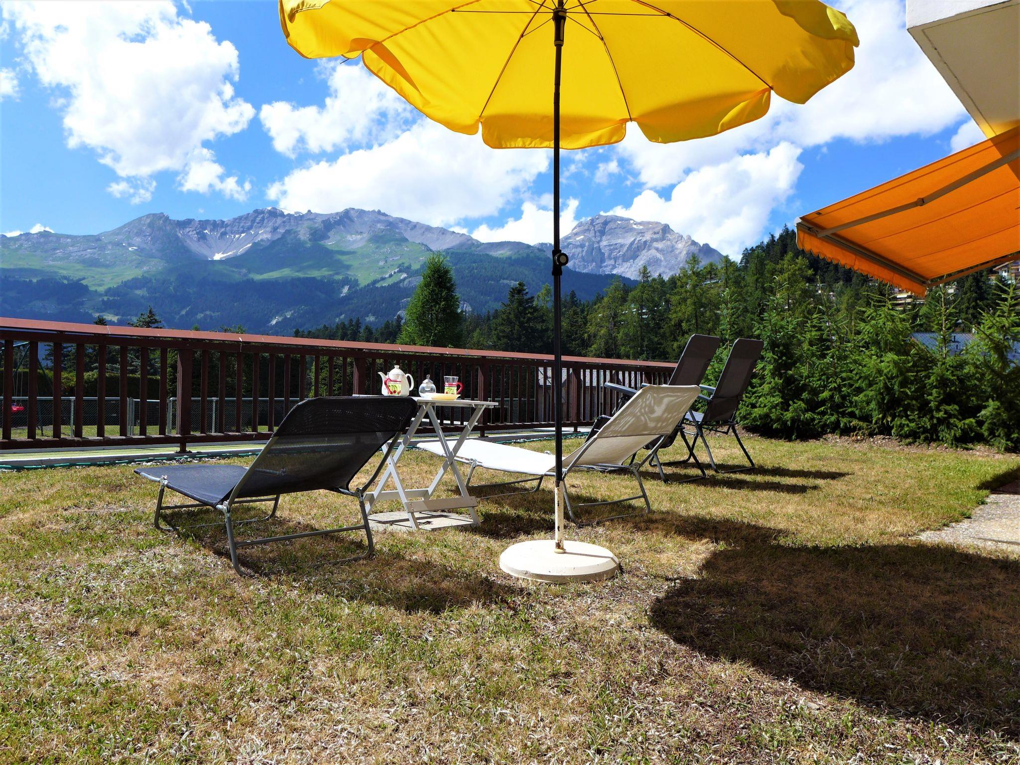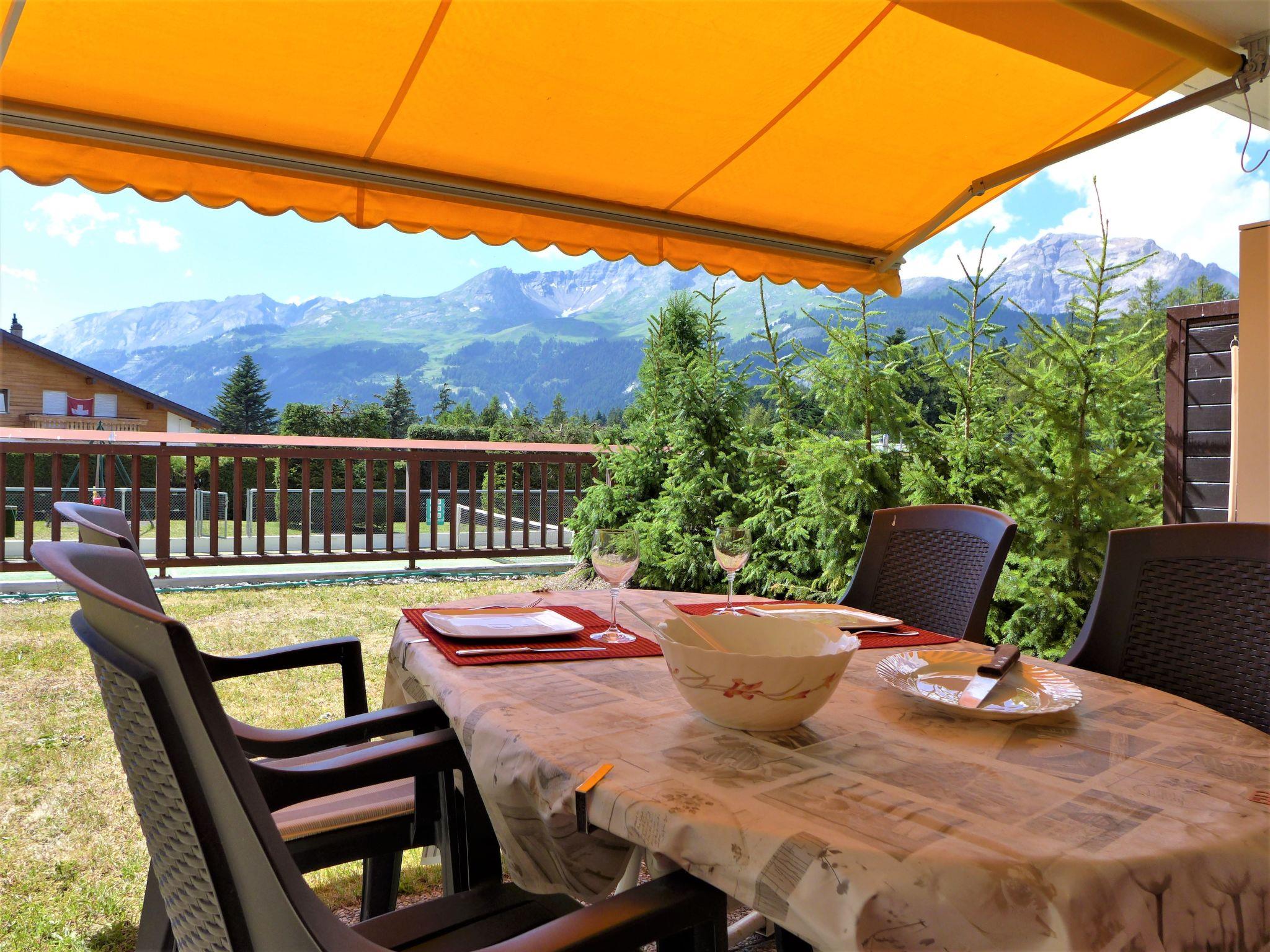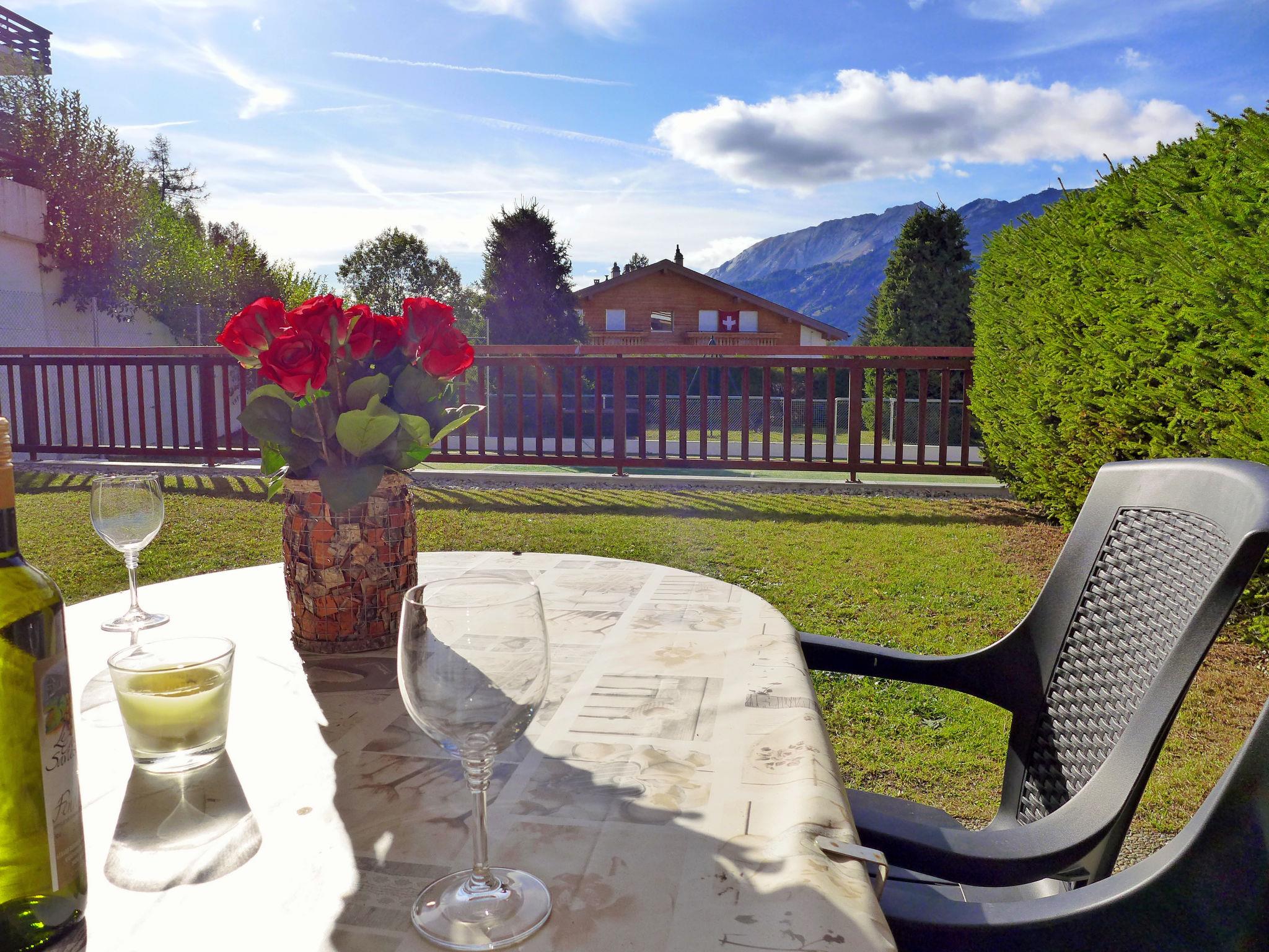 "Valdor A 42 Sud", 1-room studio 32 m2, on the ground floor, south-west facing position. Simple and comfortable furnishings: living room with 1 sofabed (140 cm, length 190 cm), dining table, cable TV, flat screen, radio, CD-player and DVD. Exit to the garden, to the terrace, south-west facing position. Kitchenette (2 hot plates, toaster, kettle, electric coffee machine, Capsules for coffee machine (Dolce Gusto) extra, raclette grill, combination microwave, fondue Set (chinoise, cheese)). Bath/WC. Large terrace, lawn. Terrace furniture, electric barbecue, deck chairs (2). Distant view of the mountains. Facilities: iron, hair dryer. Internet (WiFi, free). Please note: non-smokers only.