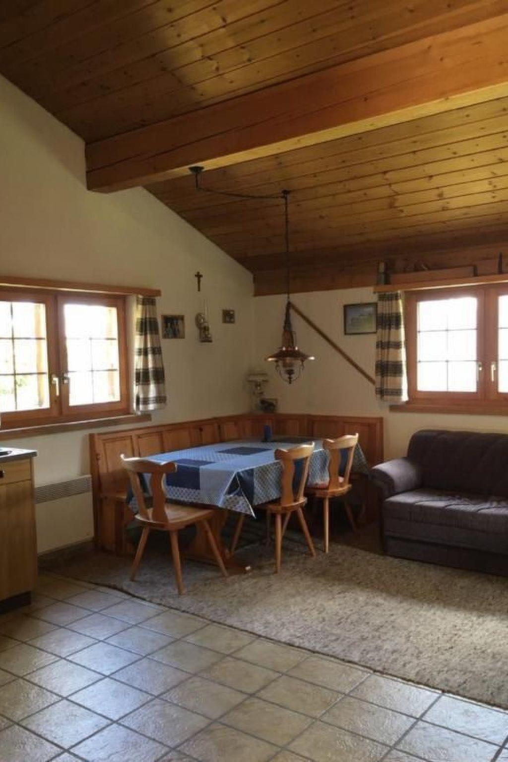 The interior of the Maiensäss is equipped with two cosy bedrooms that offer enough space for up to 4 people (2 x single beds + 1 x double bed). The cosy kitchen with its inviting corner bench, a wooden table and a 2-seater sofa invites you to linger together. With a cooker, fridge including freezer compartment, Nespresso coffee machine, fondue set, raclette oven and a comprehensive range of crockery and cutlery, all the amenities are available for enjoyable moments. The romantic fireplace makes for cosy evenings.