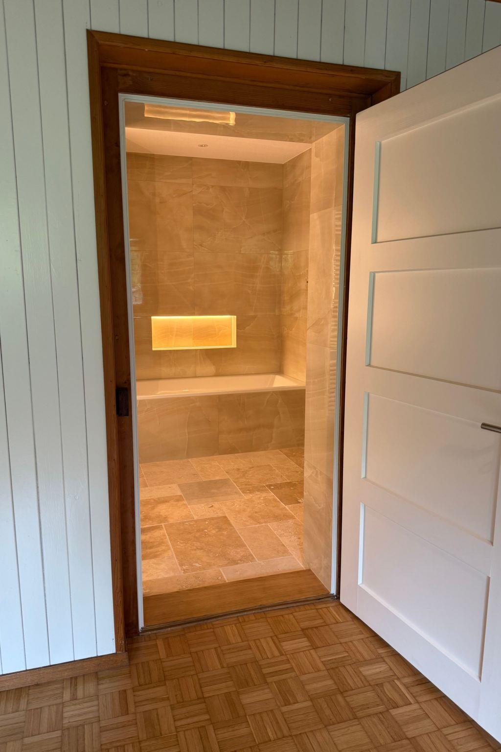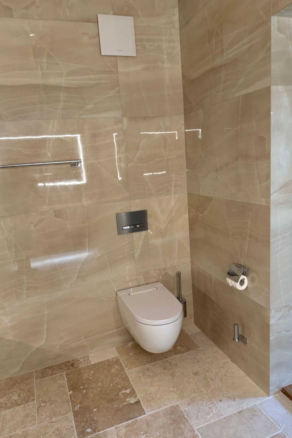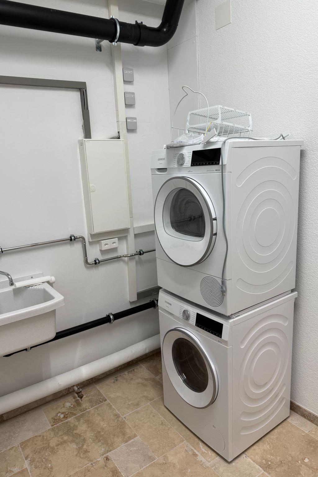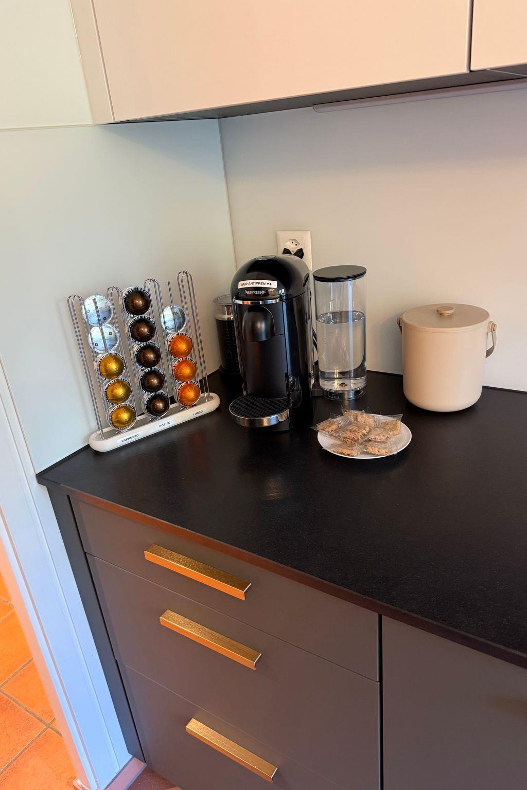 The apartment extends across the first floor on one side and flows into a private garden on the other. With three bedrooms and three toilets, the home offers plenty of room and privacy — ideal for families and groups traveling together. Two bathrooms, featuring both a walk-in shower and a bathtub, provide comfort after a day of activity. A fully equipped kitchen with induction hob, capsule coffee machine, and dishwasher makes cooking easy, while a traditional cheminée in the living room creates a cozy gathering place.