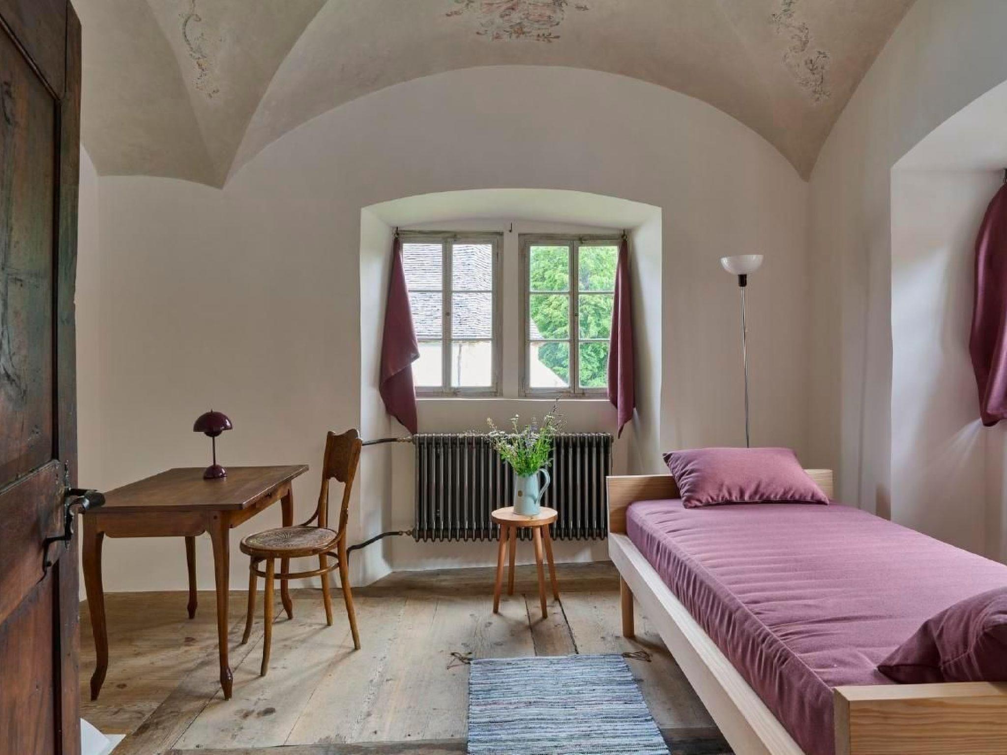 Number of persons 7: The house can accommodate seven guests in four bedrooms (1 double room, a room with two single beds (trapped), a sofa bed in the music room on the ground floor, a single bed in the chapel and 1 double bed (160x200) in the summer room (can only be used in the summer months). The house has three entrances. The main entrance is on the side facing the church, where the garden seating area is also located. One entrance leads directly to the music room, which can also be used as a room, and the third entrance can be reached via the stairs and leads from the village side into the stairwell.