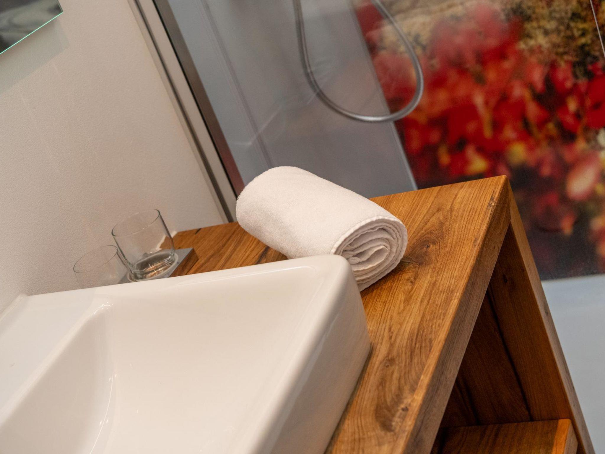 The holiday apartment has two bedrooms with double beds, one of which measures 180x200 cm and has separate mattresses. The spacious, fully equipped kitchen offers, among other things, a Nespresso coffee machine, kettle, as well as a fondue and raclette set. The cozy living room is designed in an open style and is equipped with a sofa, dining table, flat-screen TV and a Swedish stove. An inviting window seat invites you to read and relax. Free Wi-Fi is available. The offer is complemented by a large sun terrace that provides additional space to stay.
