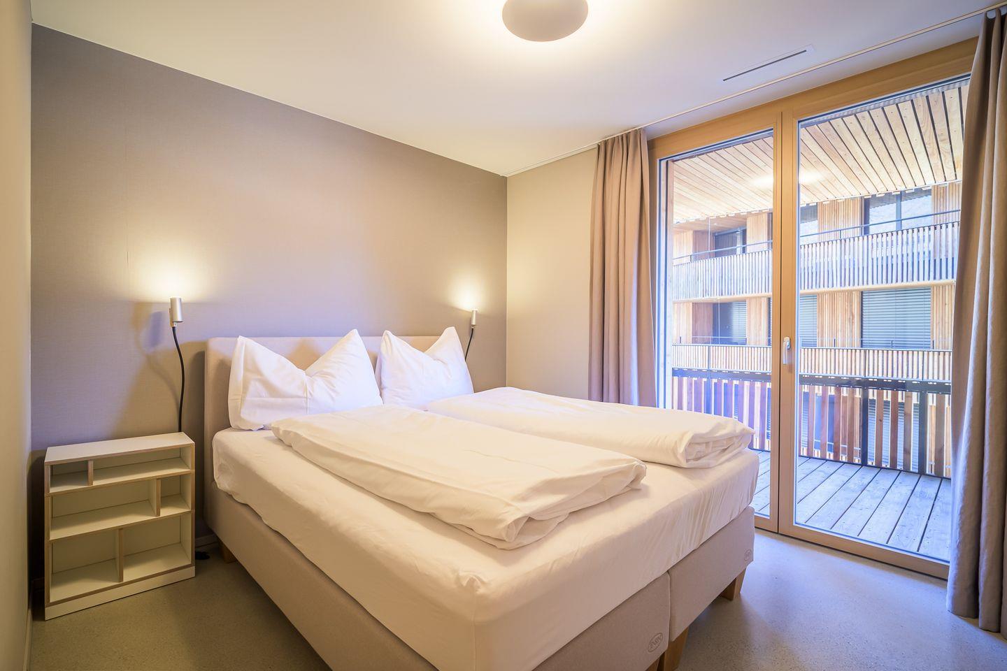 Gemütlicher Wohnraum mit offener, voll ausgestatteter Küche (Geschirrspüler, Herd, Backofen, Kühlschrank, Kaffeemaschine und Kochutensilien), zwei Schlafzimmer (ein Doppel-Boxspringbett und zwei Einzelbetten) sowie einem Badezimmer mit Dusche und eine separate Toilette. Ein eigener Skischrank und ein Tiefgaragenparkplatz, Parkhöhe 2.20m) sind kostenlos nutzbar. Eine Waschmaschine und ein Trockner stehen Ihnen im Apartmetn kostenfrei zur Verfügung.