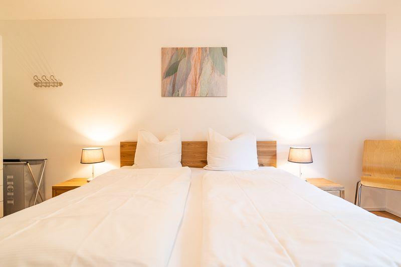 Das Apartment im 1. Obergeschoss verfügt über zwei Bäder, eins mit Dusche und das ander mit Wanne. 3 Zimmer bieten komfortablen Platz für 6 Personen, wobei ein Zimmer über ein Doppelbett und die anderen beiden Zimmer über Einzelbetten verfügen, die aber auch zusammen gestossen werden können.