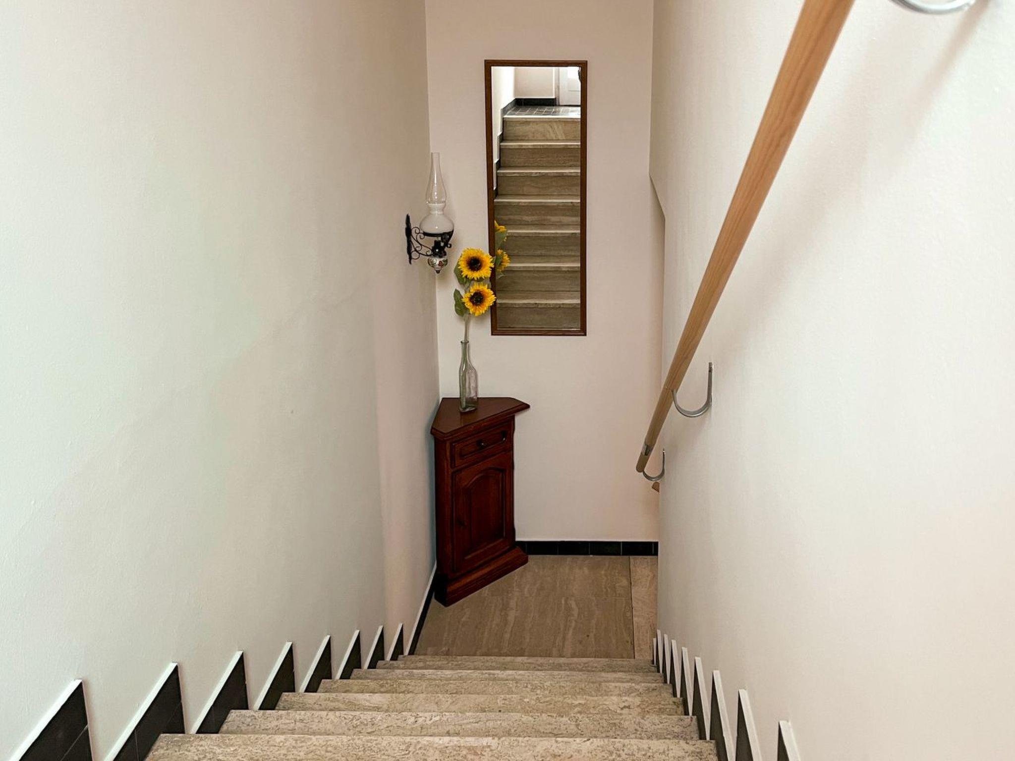 On the first floor is the open-plan living and dining area with a large sofa and adjoining terrace. The living room leads to the kitchen and a small bedroom with a double bed. On the ground floor there is another, larger bedroom with two single beds as well as a bathroom and a balcony with a view of the countryside. This makes Casa Fior di Loto ideal for holidays with family or friends.