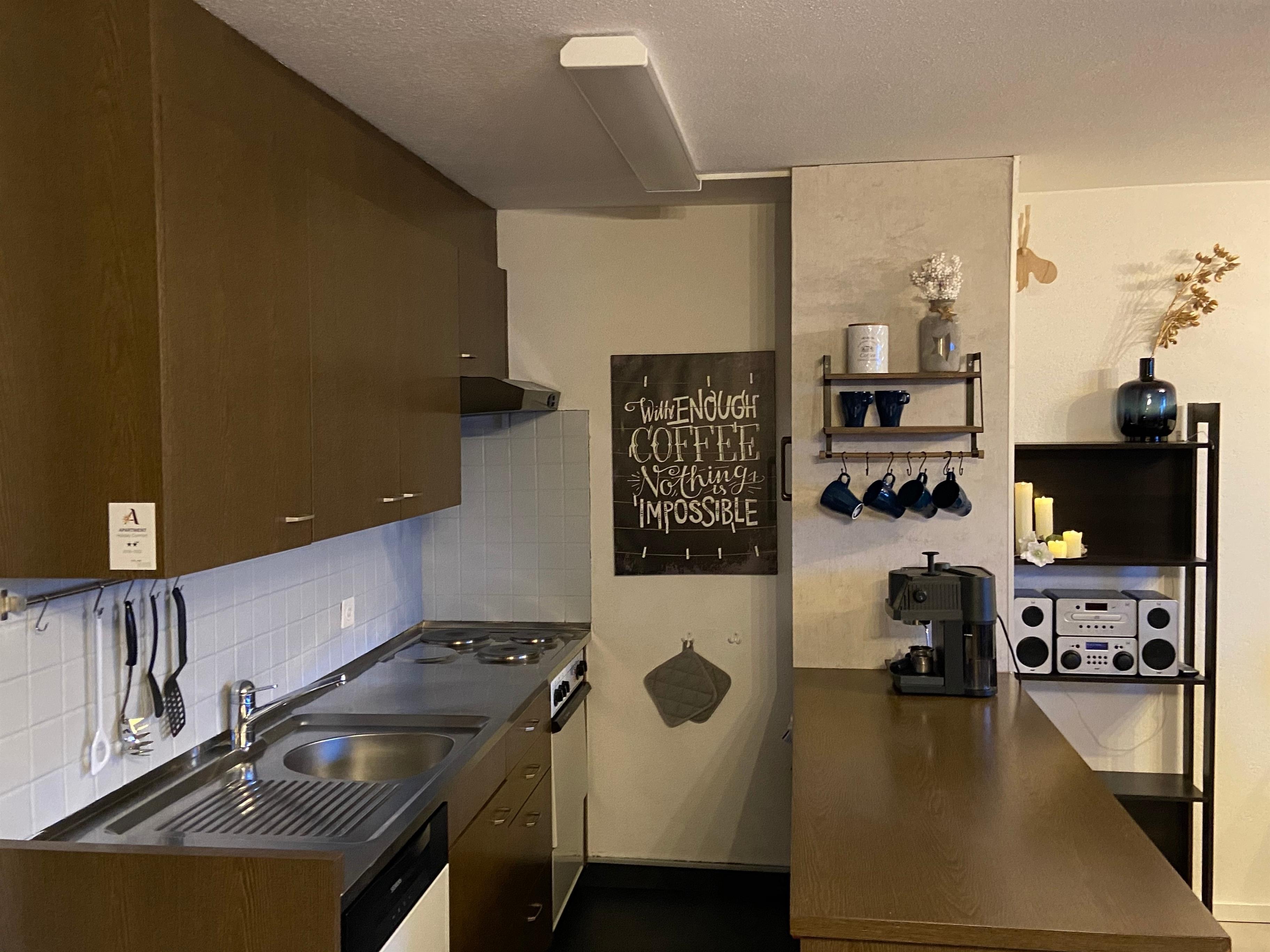 Die offene, gut ausgestattete Küche bietet unter anderem Spülmaschine, Kaffeemaschine, Backofen, Toaster, Mikrowelle und Raclettset.