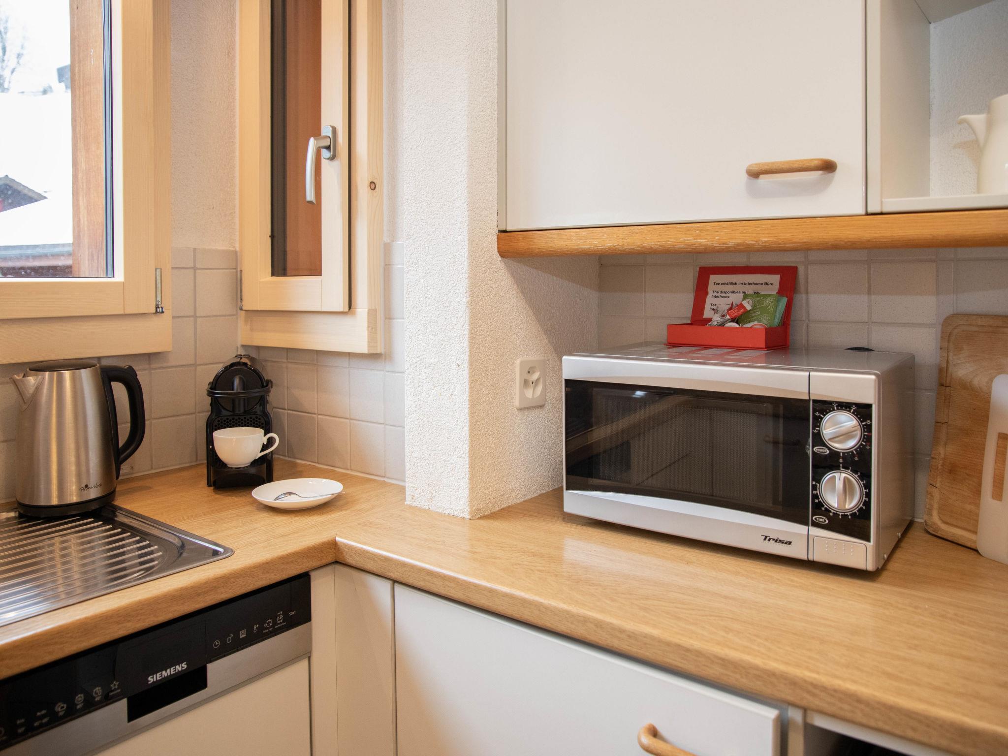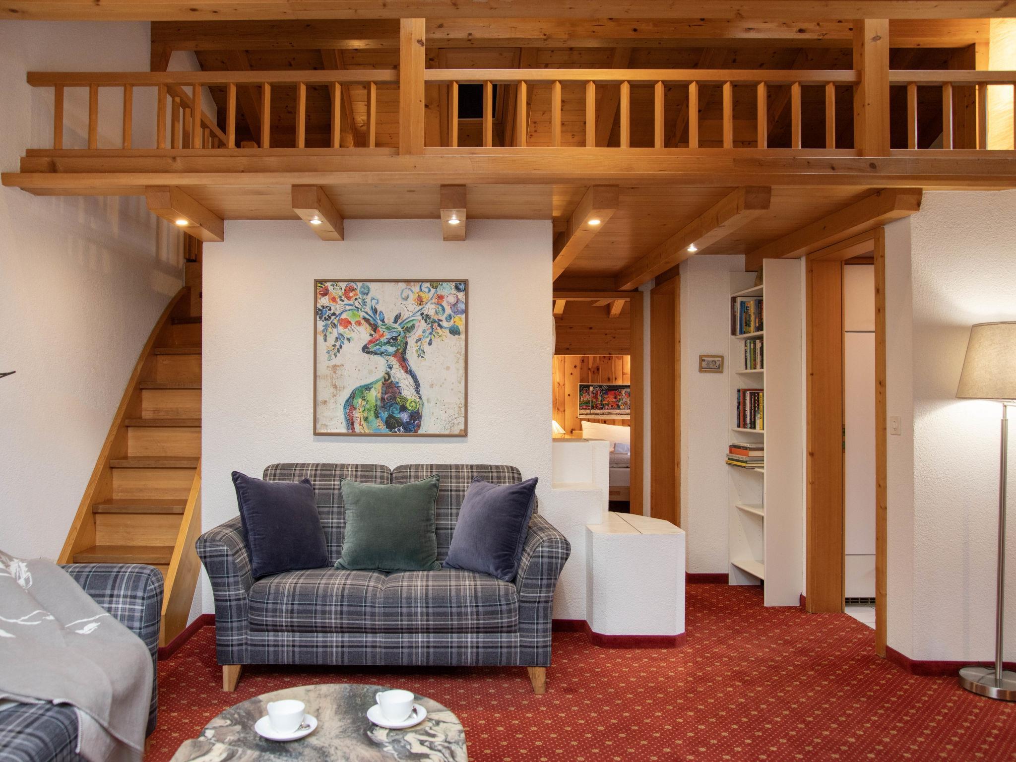 2-room apartment 56 m2 on 2 levels, on the top floor, north-east facing position. Partly with sloping ceilings, comfortable and tasteful furnishings: living/dining room with rooflight with open-hearth fireplace and cable TV (flat screen). Exit to the balcony, north facing position. 1 room with 1 double bed (2 x 90 cm, length 200 cm). Open gallery with sloping ceilings, - 160 cm. Kitchen (4 hot plates, oven, dishwasher, 4 ceramic glass hob hotplates, toaster, kettle, electric coffee machine). Bathroom, sep. WC. Balcony, north facing position. Terrace furniture. View of the garden. Facilities: baby cot, hair dryer. Internet (WiFi, free). Garage (extra). Please note: non-smokers only. Maximum 1 pet/ dog allowed. A fondue set (meat or cheese) and a raclette oven can be borrowed from reception. Moose plan with gallery, not suitable for infirm persons. Access to the apartment by elevator and stairs.
