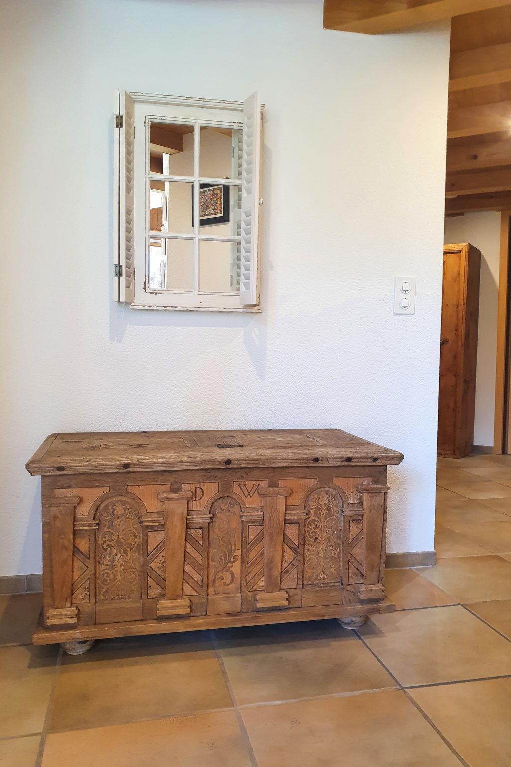 4-room apartment 124 m2, on the top floor. Partly with sloping ceilings, comfortable and cosy furnishings: living/dining room with open-hearth fireplace and cable TV (flat screen). Exit to the balcony, south facing position. 1 room with 1 french bed (180 cm, length 200 cm). 1 room with 1 french bed (140 cm, length 200 cm). 1 double bedroom with 2 beds (90 cm, length 190 cm), bath/shower/WC and cable TV. Open kitchen (oven, dishwasher, 4 ceramic glass hob hotplates, toaster, kettle, microwave, electric coffee machine, Capsules for coffee machine (Nespresso) extra). Bath/WC, sep. WC. Balcony 16 m2, south facing position. Terrace furniture. Marvellous view of the mountains and Eiger. Facilities: hair dryer. Internet (WiFi, free). Please note: non-smokers only. Maximum 1 pet/ dog allowed. A fondue set (meat or cheese) and a raclette oven can be borrowed from reception. Access to the apartment by elevator and stairs.