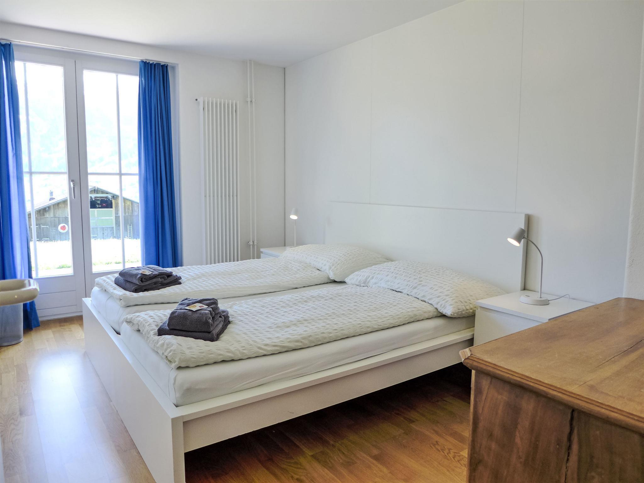 4-room apartment 86 m2, on the ground floor, south facing position. Practical and cosy furnishings: living/dining room 28 m2 with satellite TV (flat screen), radio and CD-player. Exit to the terrace. 2 rooms, each room with 2 beds (90 cm, length 200 cm). 1 room with 1 pull-out bed (2 pers. 2 x 90 cm, length 200 cm). Kitchen-/living room (oven, dishwasher, 4 ceramic glass hob hotplates, toaster, kettle, electric coffee machine, Capsules for coffee machine (Dolce Gusto) extra, raclette grill, fondue Set (cheese)). Bath/WC. Large terrace, south facing position. Terrace furniture. Marvellous view of the mountains, the valley and Eiger. Facilities: hair dryer. Internet (WiFi, free). Parking at the house. Please note: non-smokers only. Fire extinguisher.