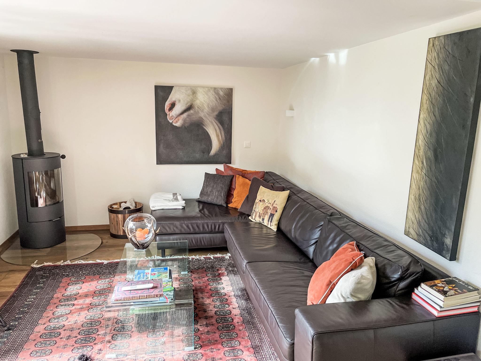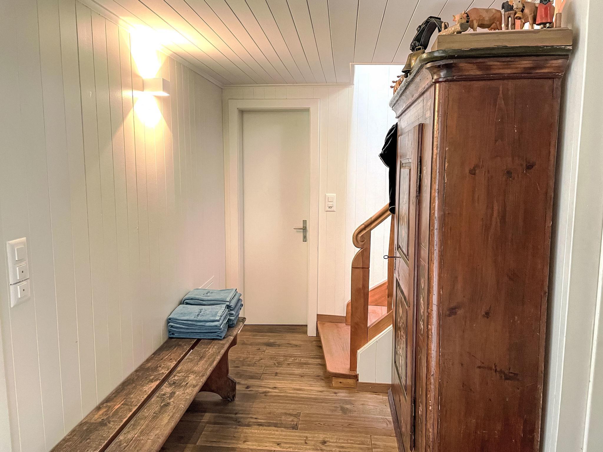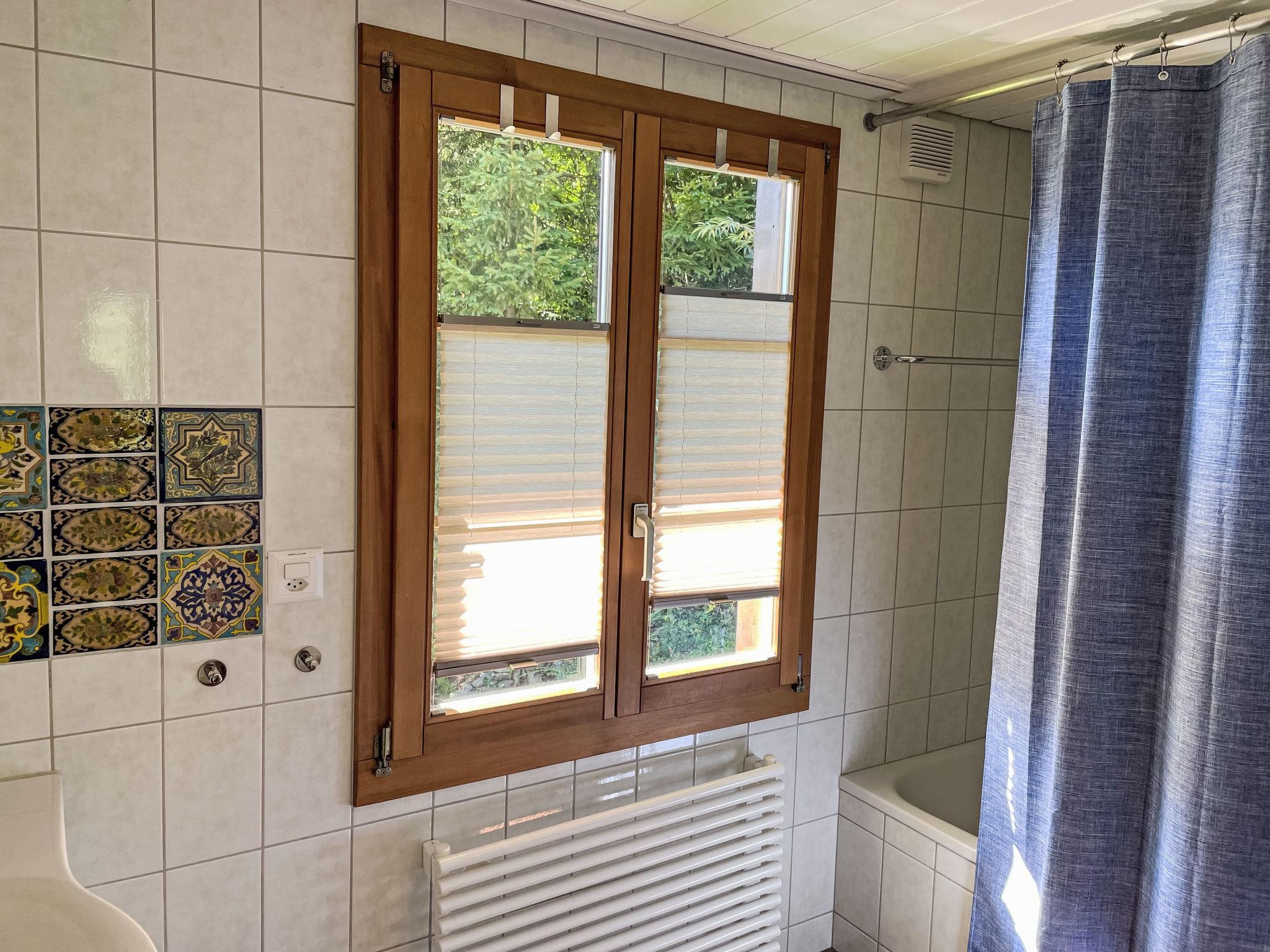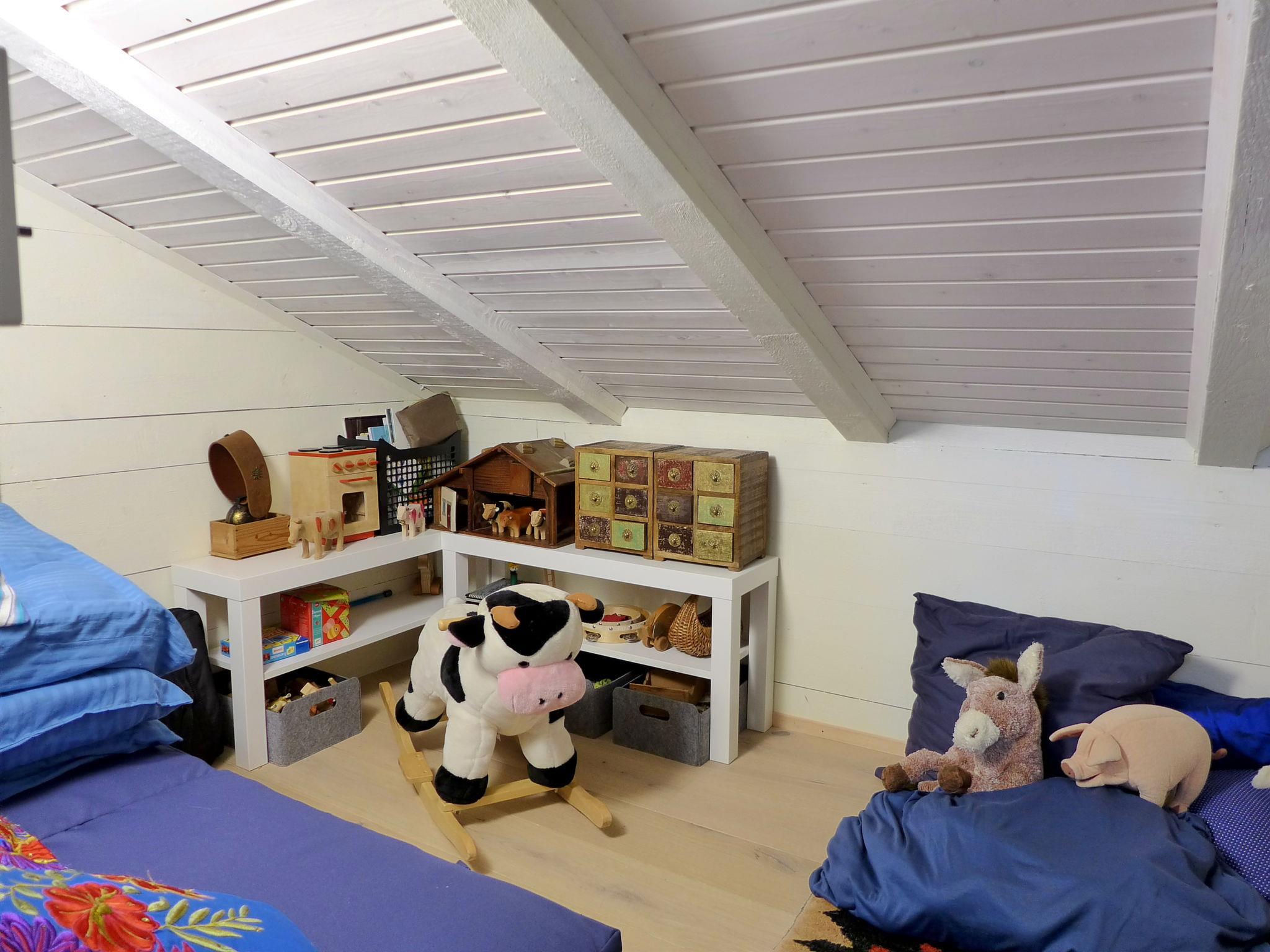 3-room chalet 130 m2 on 3 levels. Bright, partly with sloping ceilings, very comfortable and tasteful furnishings: open large living/dining room with panoramic window south facing position with Scandinavian wood stove, dining table and digital TV. Exit to the balcony. Kitchen-/living room (oven, dishwasher, 4 ceramic glass hob hotplates, toaster, kettle, microwave, electric coffee machine, Capsules for coffee machine (Nespresso) extra, raclette grill, fondue Set (cheese)) with dining nook. Bath/WC. On the lower ground floor: shower/WC. Top floor: 1 room with sloping ceilings with 1 french bed (160 cm, length 200 cm). 1 room with sloping ceilings with 3 beds (90 cm, length 200 cm). Open gallery. Open small playroom. Large balcony, south facing position, large terrace. Terrace furniture, barbecue. Marvellous panoramic view of the mountains and the countryside. Facilities: washing machine, dryer, iron, baby cot for up to 2 year olds, hair dryer, logs (free). Internet (WiFi, free). Parking, garage at the house. Please note: non-smoking house. Maximum 2 pets/ dogs allowed. Smoke alarm, fire extinguisher.