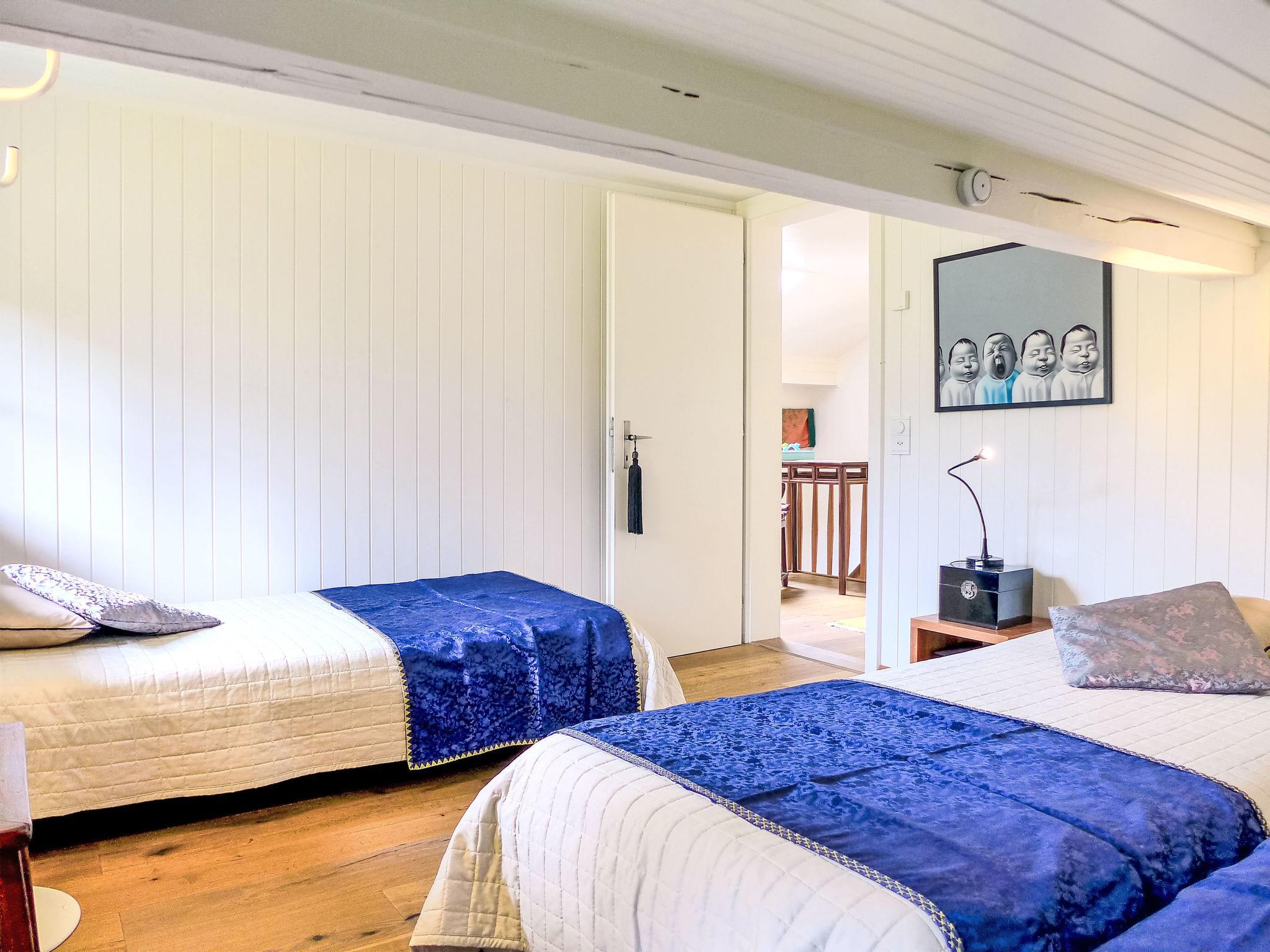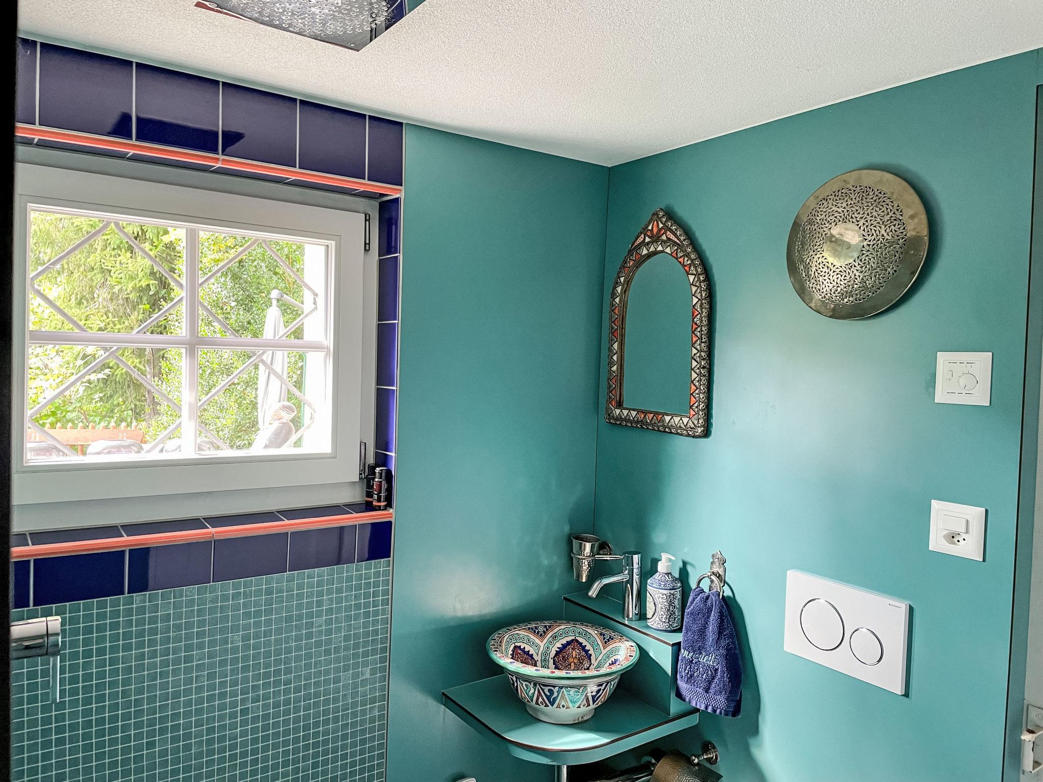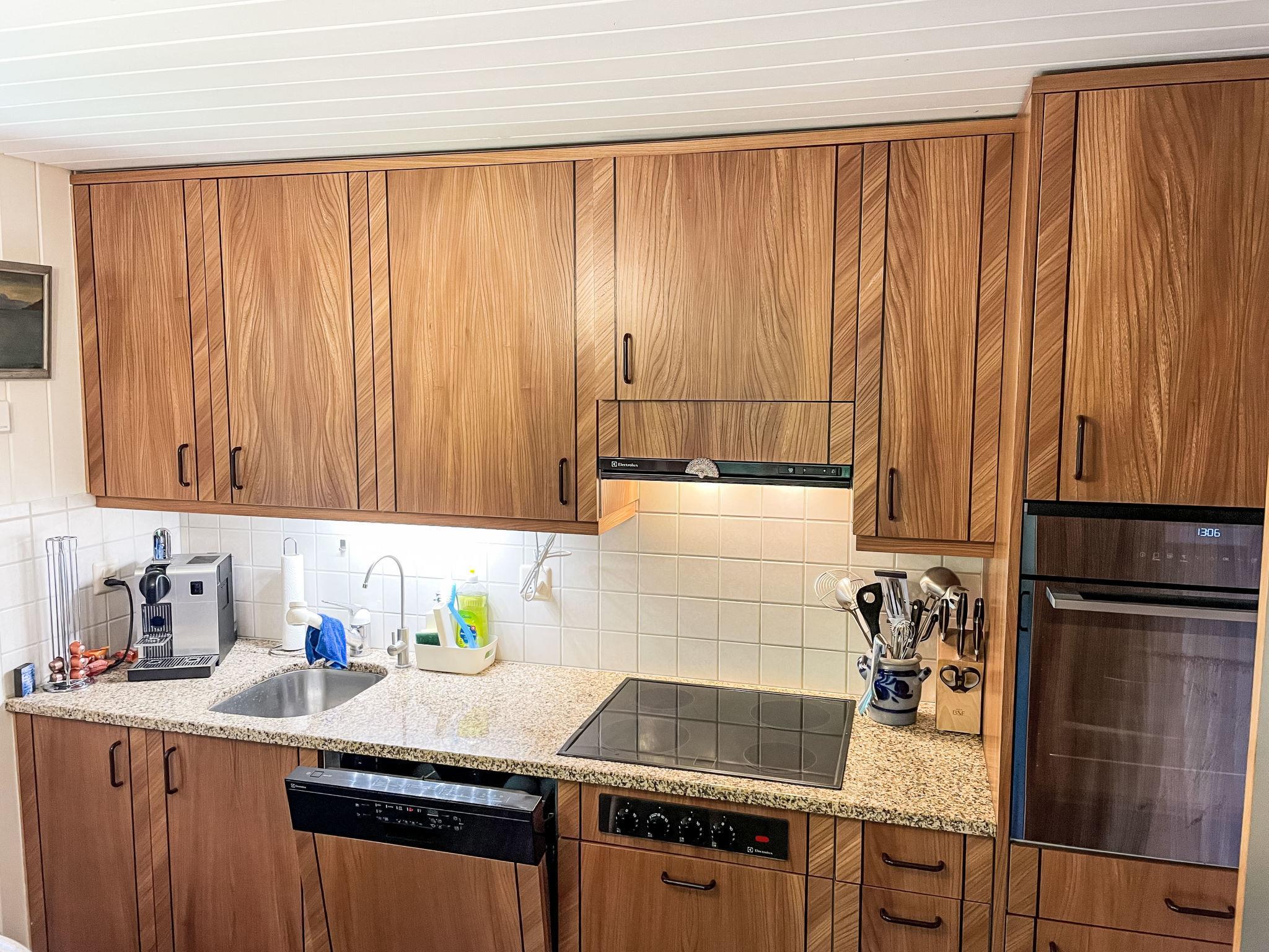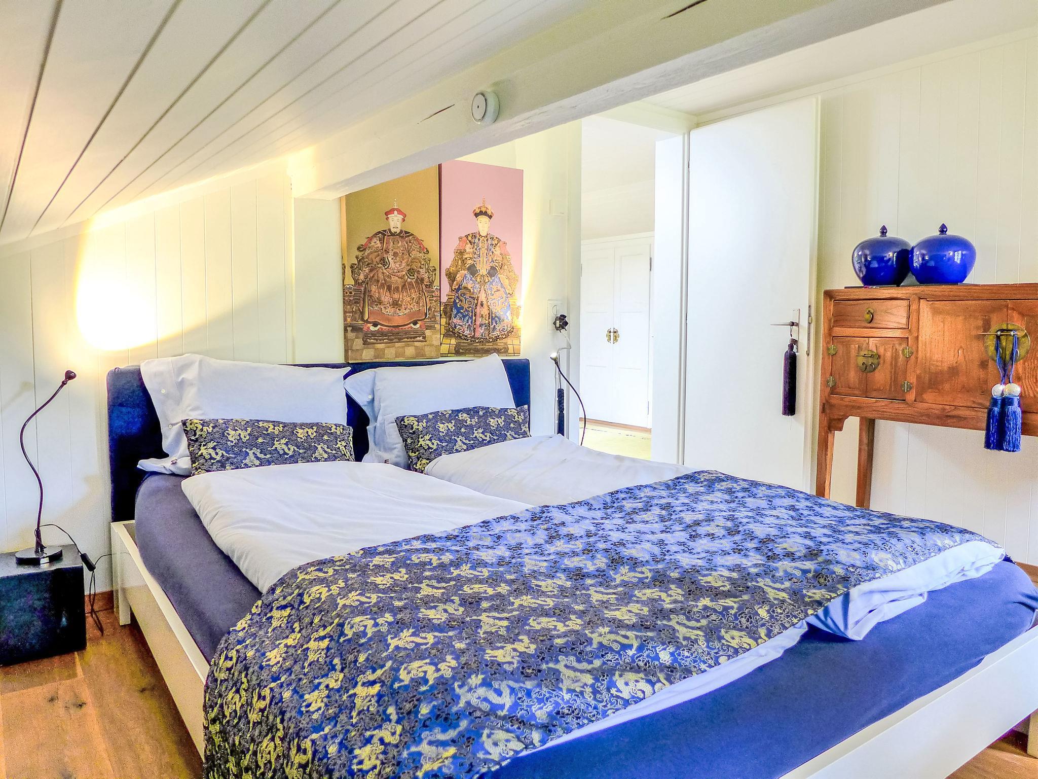 3-room chalet 130 m2 on 3 levels. Bright, partly with sloping ceilings, very comfortable and tasteful furnishings: open large living/dining room with panoramic window south facing position with Scandinavian wood stove, dining table and digital TV. Exit to the balcony. Kitchen-/living room (oven, dishwasher, 4 ceramic glass hob hotplates, toaster, kettle, microwave, electric coffee machine, Capsules for coffee machine (Nespresso) extra, raclette grill, fondue Set (cheese)) with dining nook. Bath/WC. On the lower ground floor: shower/WC. Top floor: 1 room with sloping ceilings with 1 french bed (160 cm, length 200 cm). 1 room with sloping ceilings with 3 beds (90 cm, length 200 cm). Open gallery. Open small playroom. Large balcony, south facing position, large terrace. Terrace furniture, barbecue. Marvellous panoramic view of the mountains and the countryside. Facilities: washing machine, dryer, iron, baby cot for up to 2 year olds, hair dryer, logs (free). Internet (WiFi, free). Parking, garage at the house. Please note: non-smoking house. Maximum 2 pets/ dogs allowed. Smoke alarm, fire extinguisher.