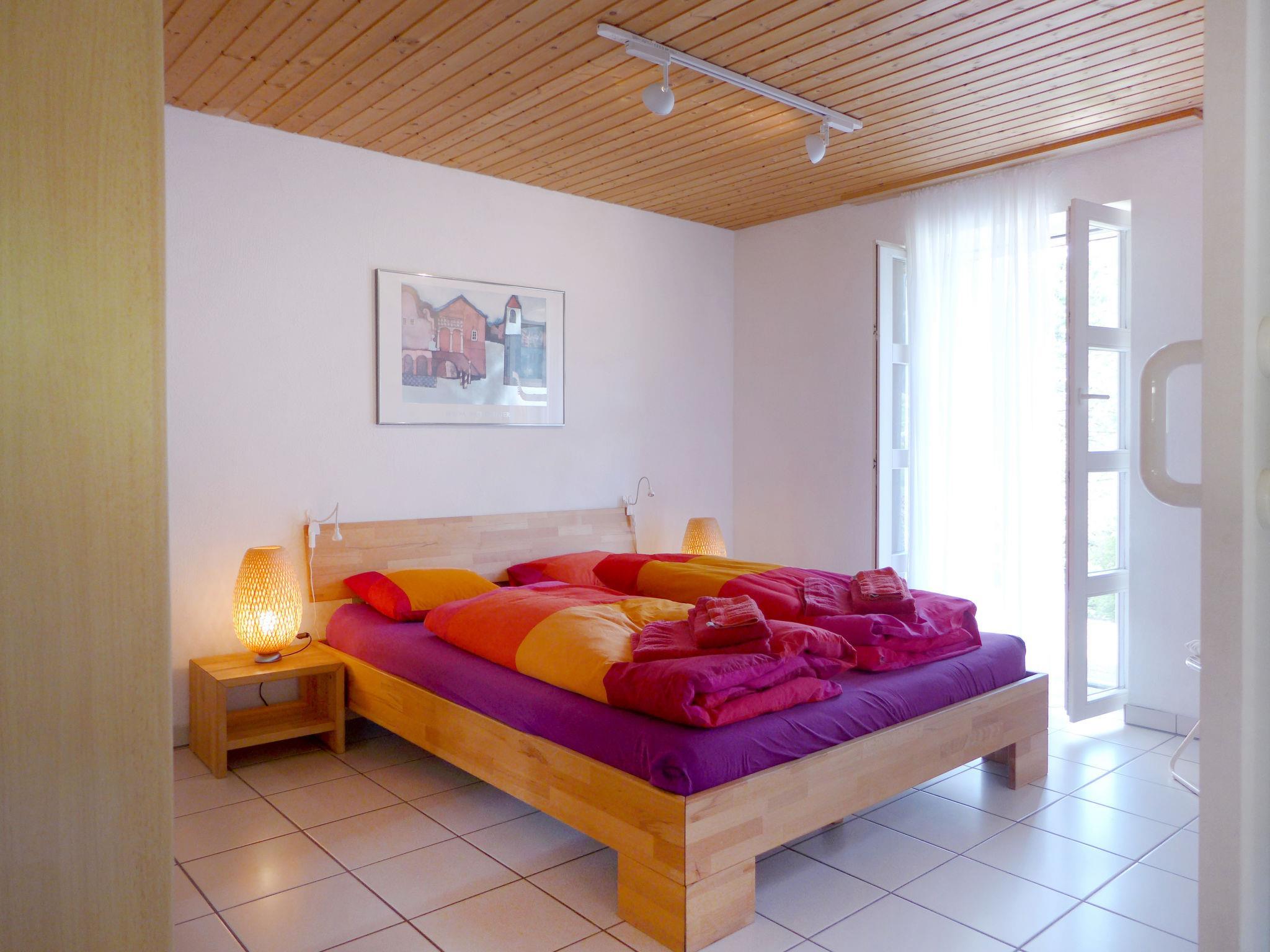 2-room apartment 40 m2, on the ground floor, south facing position. Bright, comfortable and cosy furnishings: open living/dining room with dining table, cable TV, radio, hi-fi system and DVD. Exit to the terrace. 1 room with 1 french bed (160 cm). Exit to the terrace. Open kitchen (oven, 4 ceramic glass hob hotplates, toaster, kettle, microwave, electric coffee machine, Capsules for coffee machine (Nespresso) extra, raclette grill, fondue Set (cheese)). Bath/WC. Underfloor heating. Terrace 20 m2. Terrace furniture, box-room. Marvellous panoramic view of the mountains and the countryside. Facilities: washing machine, dryer, baby cot. Internet (WiFi, free). Parking (roofed, 1 car). Please note: non-smokers only.