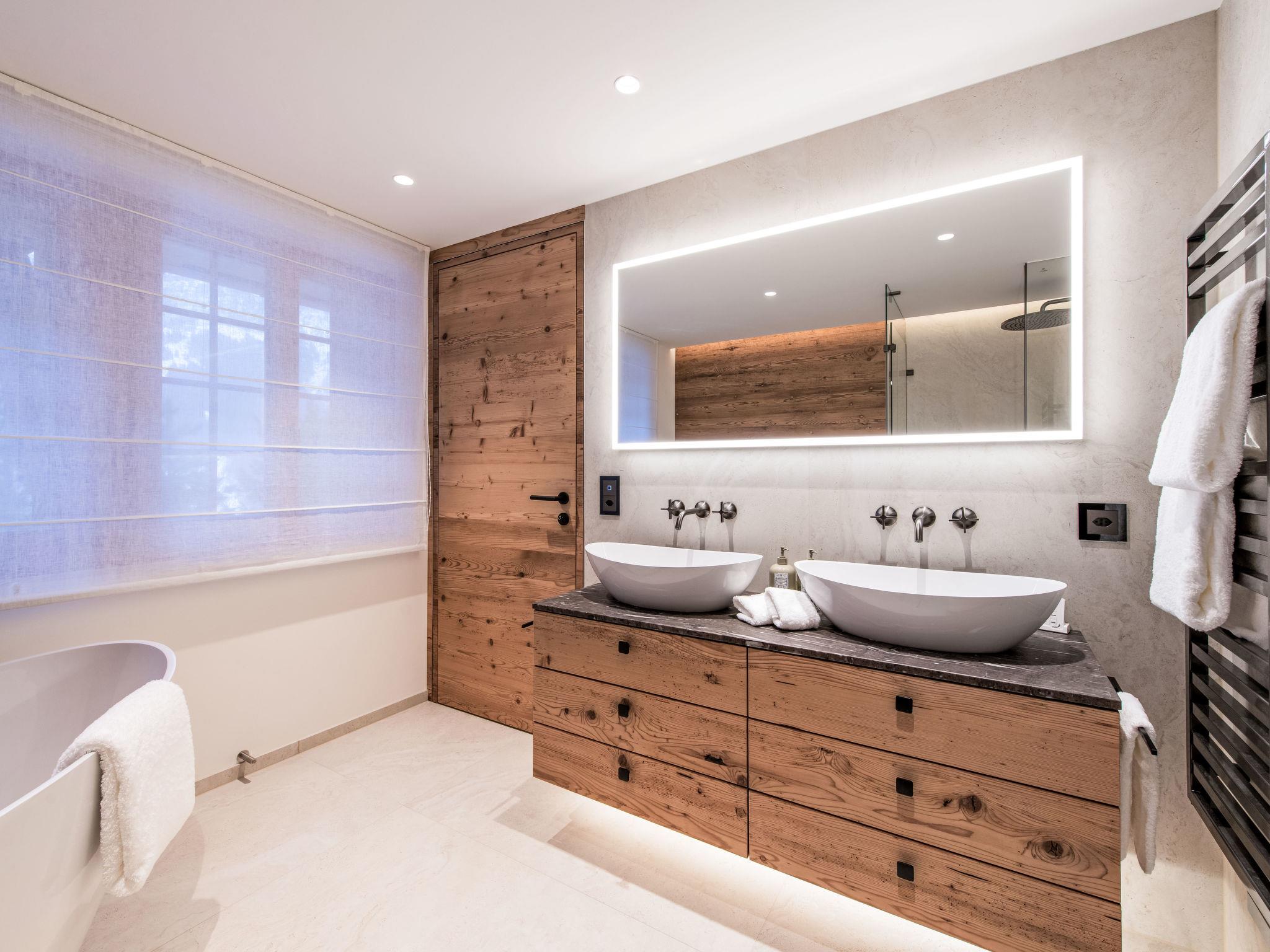 8-room chalet 405 m2 on 3 levels. Luxurious and stylish furnishings: 1 room with 1 double bed, bath/shower/WC and double hand-basin. 1 room with 1 double bed, bath/shower/WC and double hand-basin. 1 room with 2 beds and shower/WC. Floor heating. On the lower ground floor: 1 room with 1 double bed. Bath/shower/WC, double hand-basin. Upper floor: large living room with open-hearth fireplace, dining table and TV. Open kitchen (oven, dishwasher, 4 induction hot plates, toaster, kettle, microwave, freezer, electric coffee machine) with dining table. Sep. WC. Balcony 80 m2, terrace 30 m2. Balcony furniture, deck chairs (3). Very beautiful panoramic view of the mountains. Facilities: washing machine, dryer, sauna, hair dryer. Internet (WiFi, free). Please note: non-smoking house.