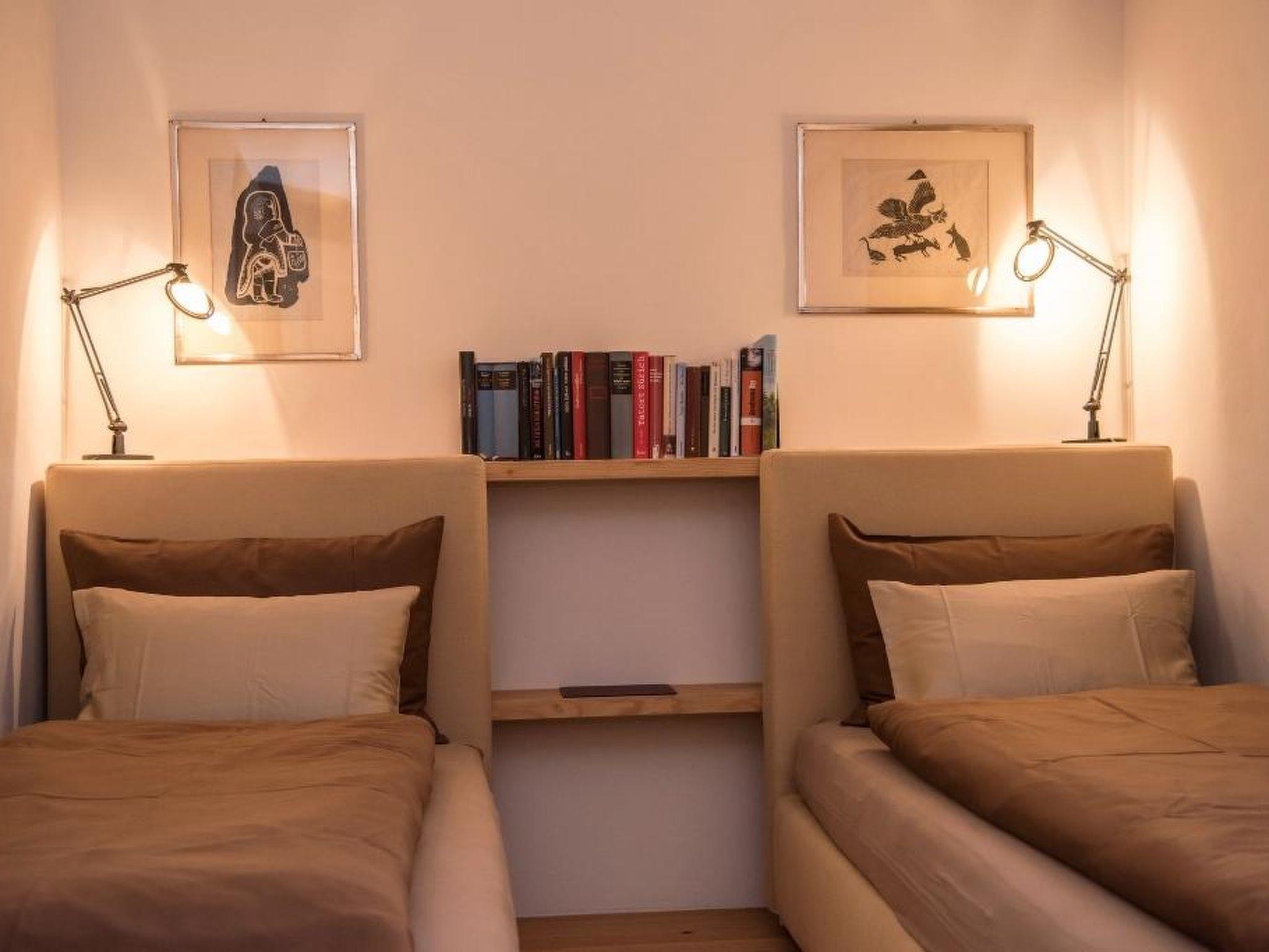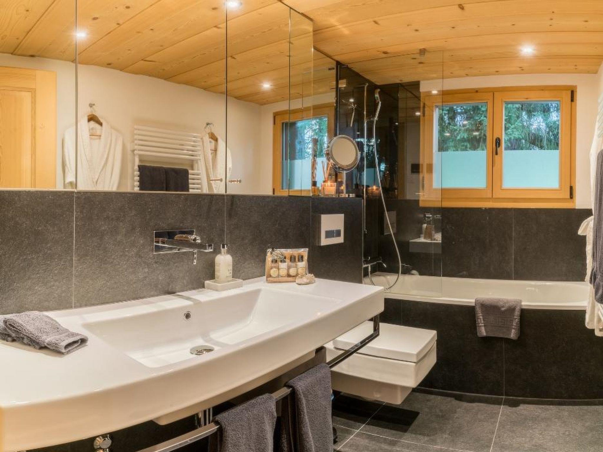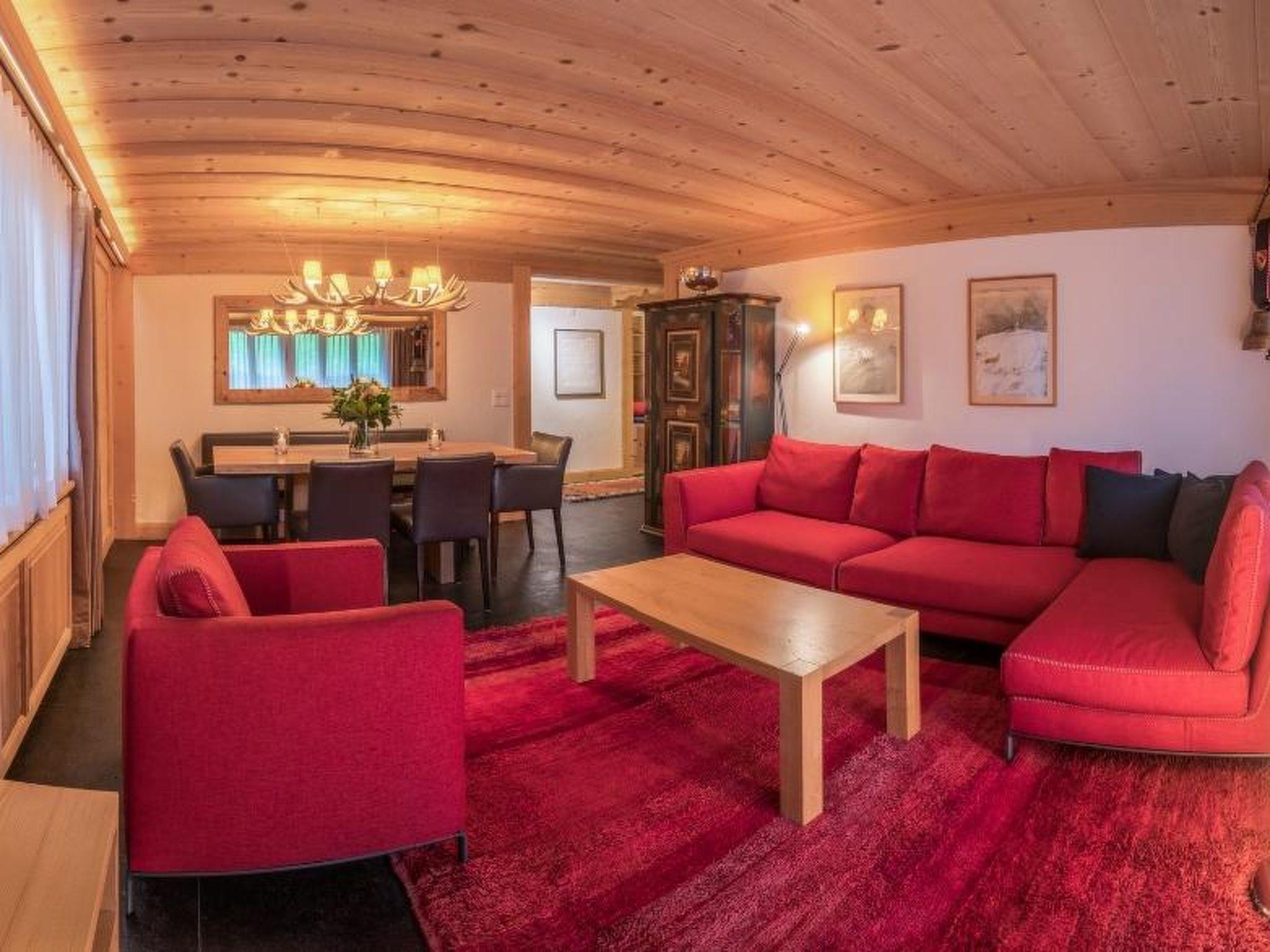 Living room with couch and armchair, leather covered bench and chairs. Large size flat screen, 3D LCD, home cinema, DVD, stereo system, digital cable connection with HDTV-channels, music choice from the iPod. W-Lan. 1 double room with 1 queen-size bed (2x90x200cm), LCD TV with DVD and digital cable connection. Desk with iMac. 3 wall cupboards and 1 wardrobe. 1 bedroom with 2 separate beds (90x200cm) and 2 wall cupboards. 1 bedroom with 2 separate beds (80x200cm), can also be used as a double bed, 1 desk and 2 wall cupboards, direct access to the bathroom. 1 bahtroom with bathtub/toilet, 1 bathroom with rain shower and toilet. Modern furnished kitchen (among other things furnished with coffee machine with capsules (Nespresso), filter coffee machine, fondue-raclette set. Baby cot (60x120cm) incl. bed linen and highchair available.
