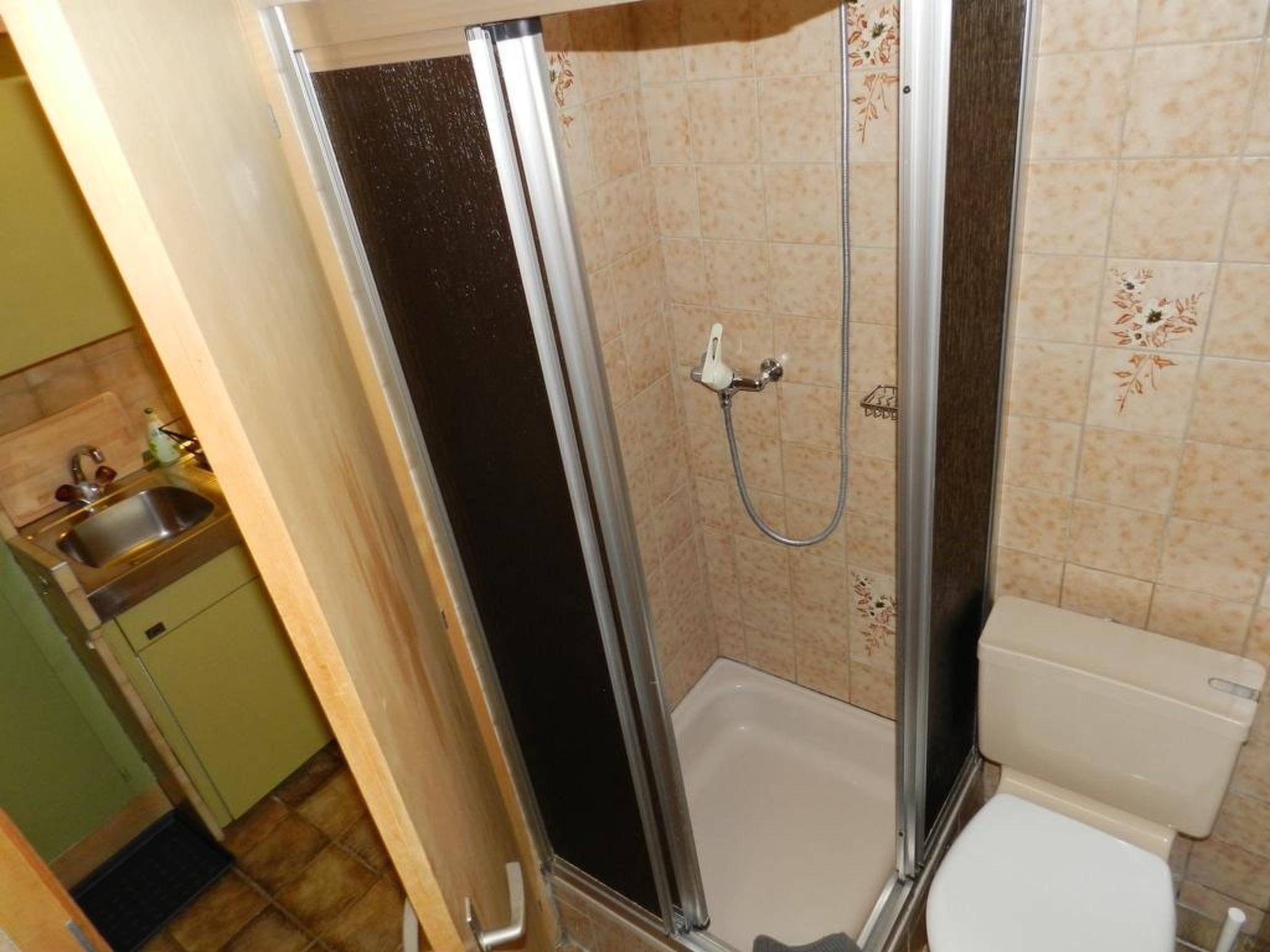 Living/dining/bedroom with 1 grand-lit (2x90x200cm), sofa, small dining table, wardrobe and flat screen TV. Small and simply furnished kitchenette (without oven) with coffee machine with capsules (Nespresso). 1 bathroom with toilet and shower. WiFi.