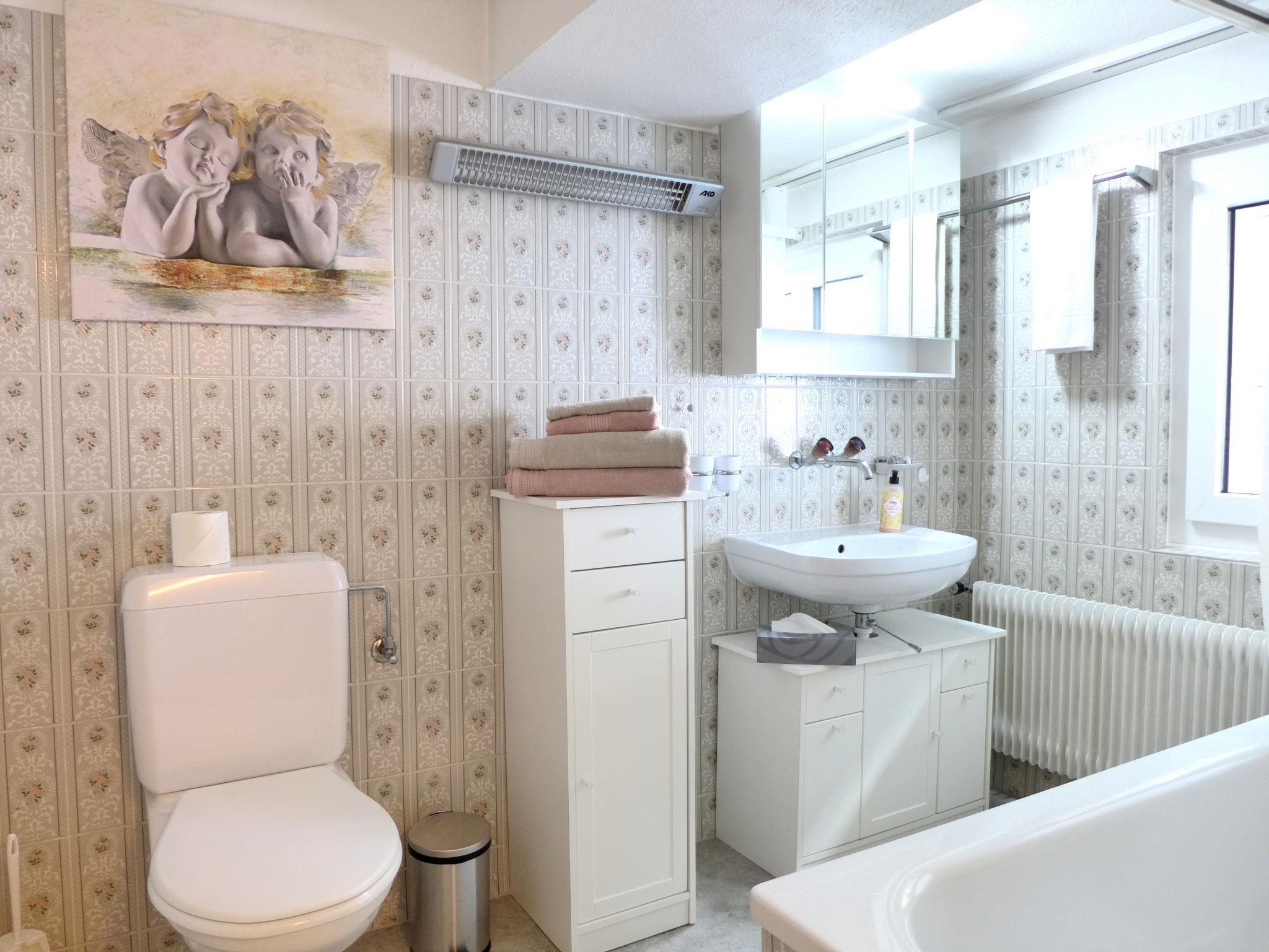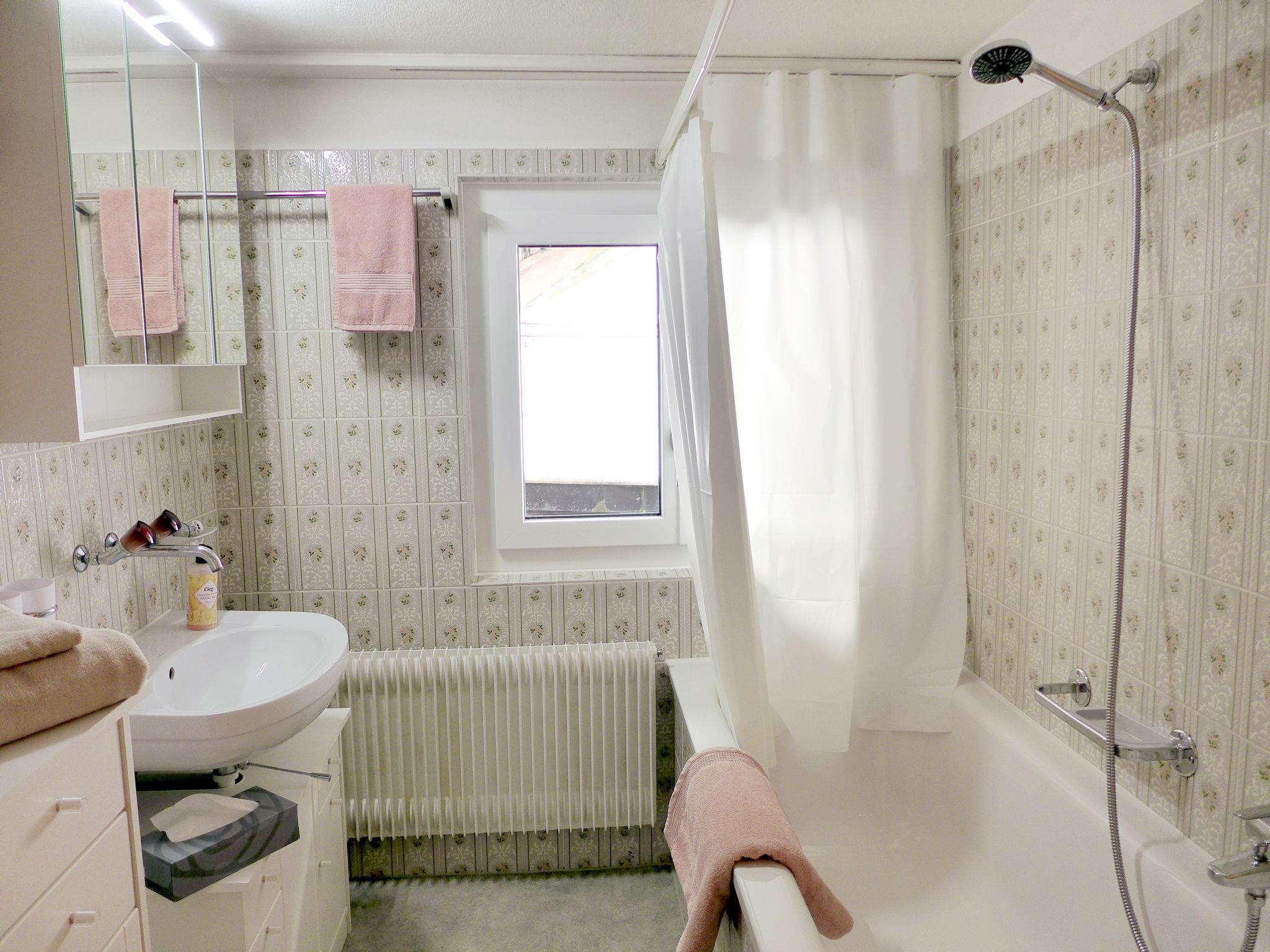 3-room apartment 70 m2 on 1st floor. Spacious and bright, practical and cosy furnishings: large living/dining room with dining table and cable TV. 1 small room with 2 beds (80 cm, length 190 cm). 1 large room with 1 double bed (160 cm, length 200 cm). Large kitchen (3 hot plates, oven, dishwasher, toaster, kettle, freezer, electric coffee machine, Capsules for coffee machine (Delizio) extra, raclette grill, fondue Set (cheese)) with small dining table. Bath/WC. Wooden floors. Large porch 16 m2, east facing position and south facing position. Balcony furniture. Very beautiful view of the mountains, the resort and the river. Facilities: iron, hair dryer. Internet (WiFi, free). Parking (1 car). Please note: non-smoking house. Smoke alarm, fire extinguisher.