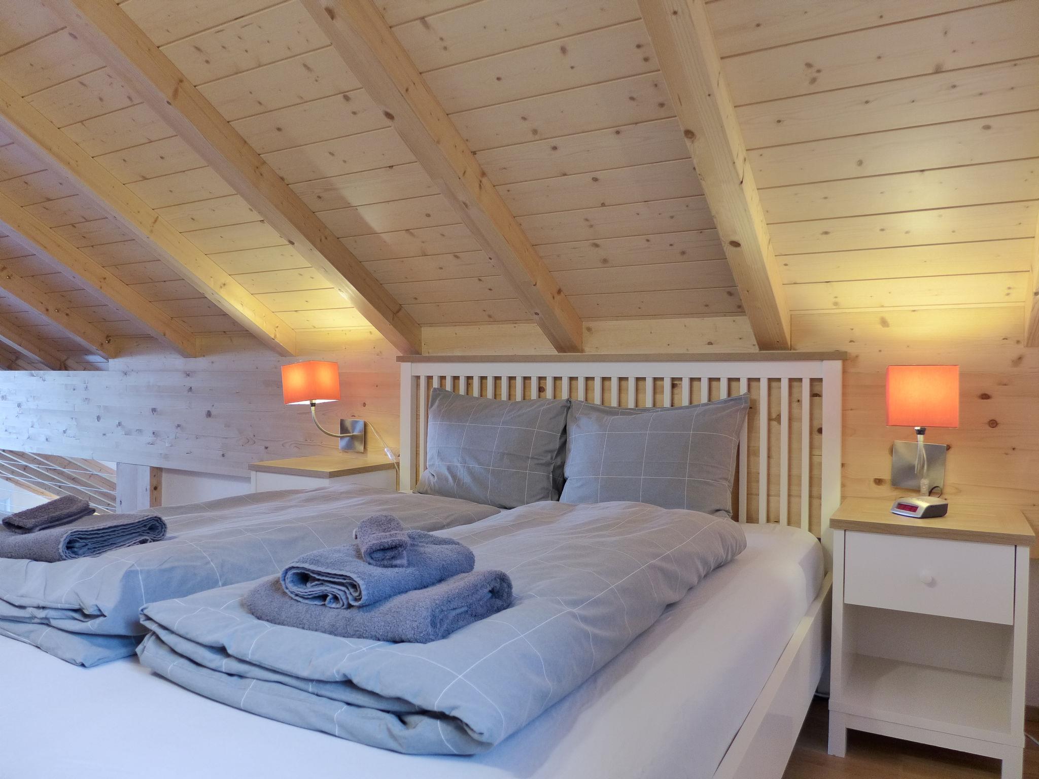 "Momento", 3-room apartment 101 m2 on 2 levels, on the top floor, south facing position. Spacious and bright, very comfortable and tasteful furnishings: open living/dining room with panoramic window with digital TV, hi-fi system and electric shutters. Exit to the balcony. 1 room with 1 double bed (180 cm, length 200 cm). 1 room with 1 french bed (140 cm, length 200 cm). Exit to the balcony. Open kitchen (oven, dishwasher, 4 ceramic glass hob hotplates, freezer, electric coffee machine, Capsules for coffee machine (Nespresso) extra, steamer, raclette grill, fondue Set (cheese)) with dining table. Shower/WC. Underfloor heating. Upper floor: (steep stair) open gallery with sloping ceilings, ceiling height 120 - 300 cm with panoramic window with 1 french bed (160 cm, length 200 cm). Parquet floors, natural stone floors. Large balcony, south facing position. Balcony furniture. Marvellous panoramic view of the mountains and the countryside. Facilities: iron, children's high chair, baby cot, hair dryer. Internet (WiFi, free). Parking (roofed, 1 car). Please note: suitable for families. Non-smokers only. Maximum 1 pet/ dog allowed. Smoke alarm, fire extinguisher. Instead of an enclosed bedroom, some sleeping areas are located in an open-plan area (gallery, alcove, etc.).