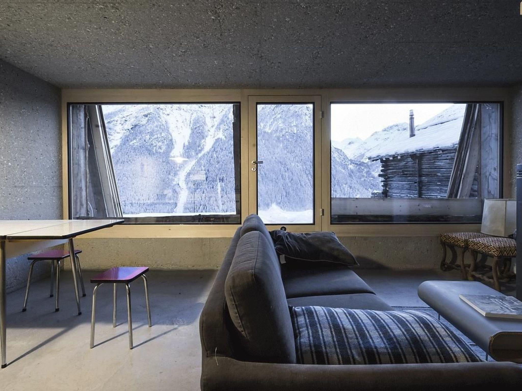 The former stable is now a modern living space heated by a pellet stove. The upper part has been converted into a spacious bedroom with a view of the Dent Blanche at 4357 metres. The different areas allow us to offer you two completely different atmospheres. The former stable has a mineral feel, combining concrete and stone, while the raccard area is a cocoon lined with wood, inviting you to relax and unwind. The passage from one floor to the other is via a wooden staircase that crosses the void, a journey in itself!