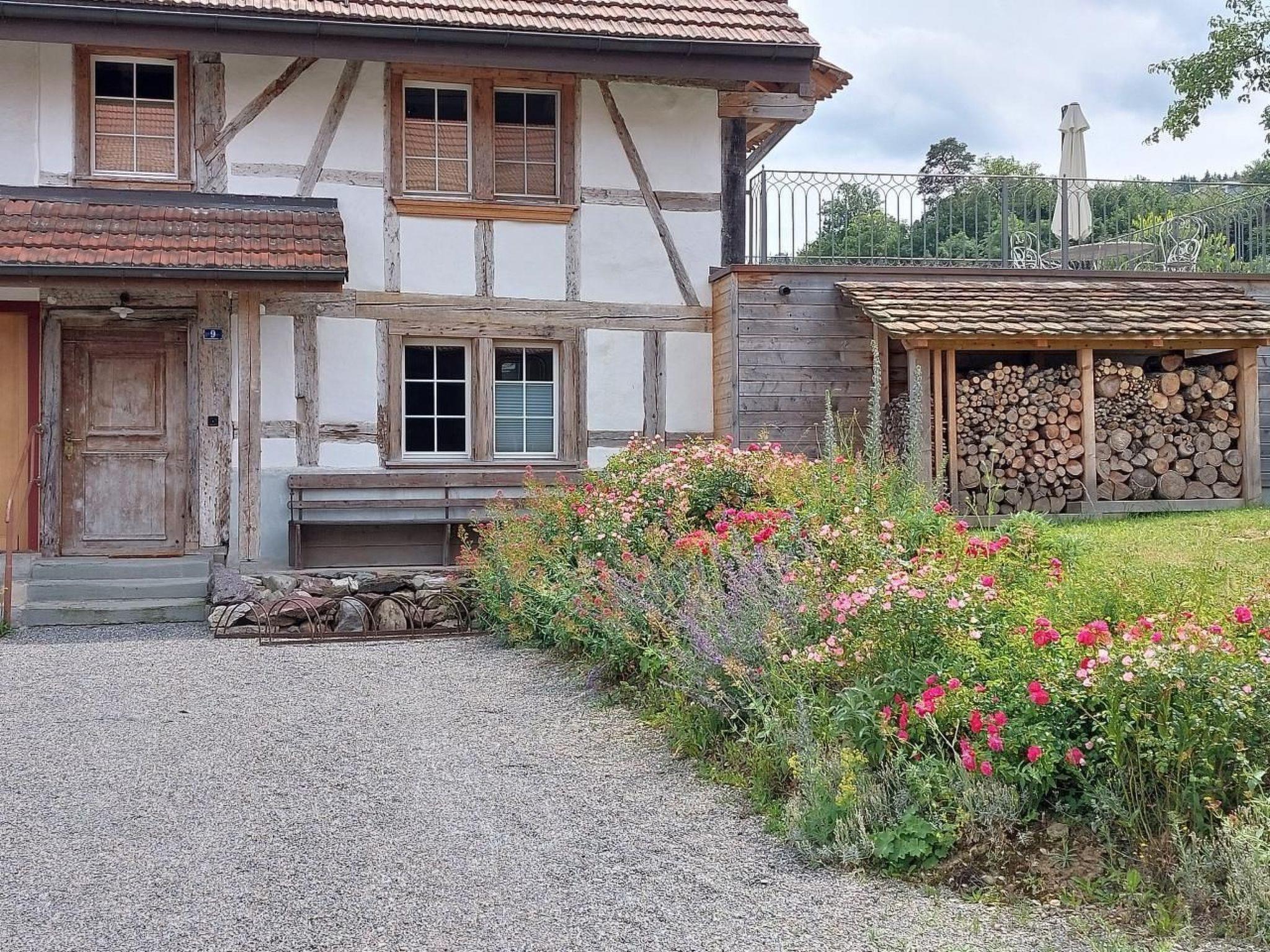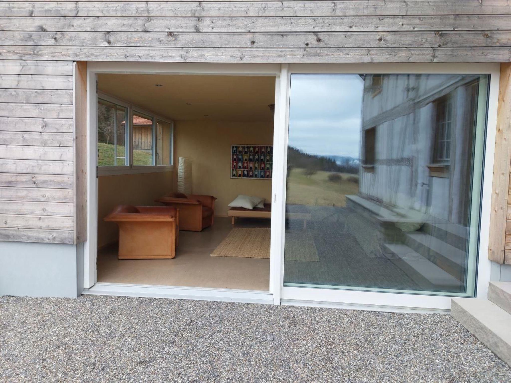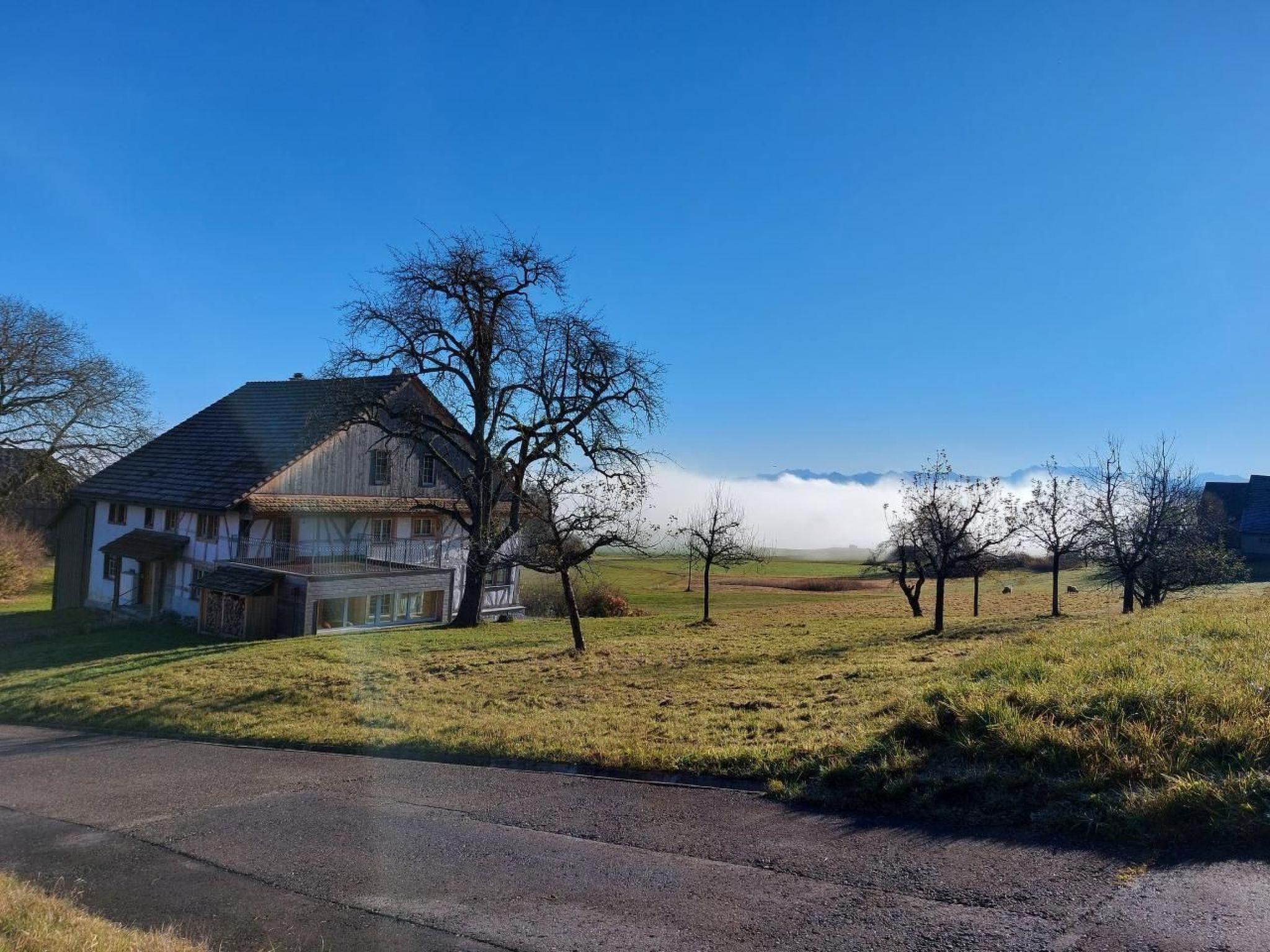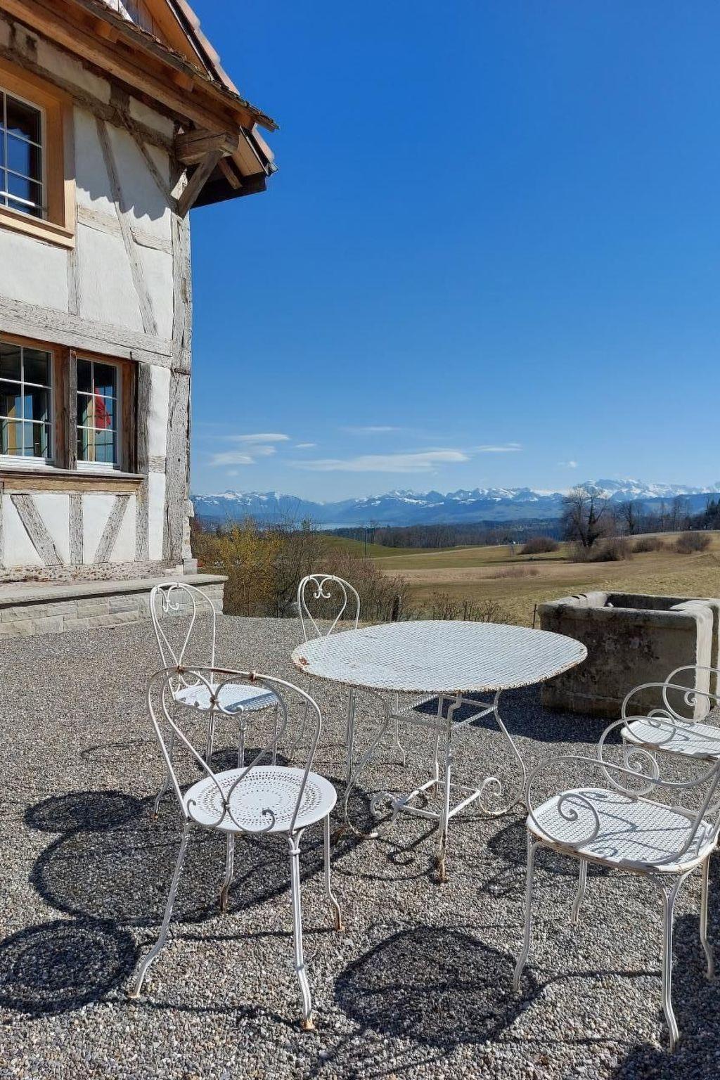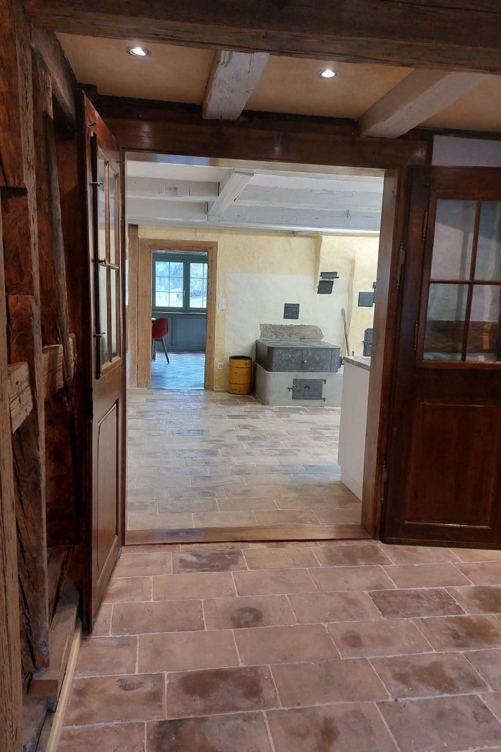 This timber-framed farmhouse, which will be renovated over several years using traditional and natural materials by spring 2022, is located just outside the city of Zurich. It is surrounded by partly old fruit trees, dry stone walls, rough pastures and agricultural land. The mown meadow garden, the large gravelled area in front of the kitchen and living room and the raised terrace invite you to relax and enjoy. The view extends from the city of Zurich across Lake Zurich to the distant mountains, some of which are still covered in snow in summer.