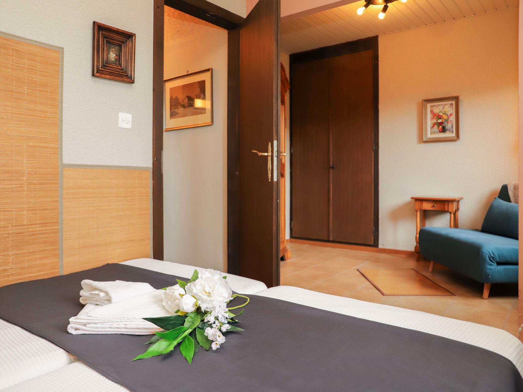 "Dorenavant", 3-room house 90 m2. Partly renovated in 2025, comfortable and tasteful furnishings: living/dining room with open-hearth fireplace (only for decoration), satellite TV and electric heating. Exit to the garden. 1 room with 1 bed (160 cm, length 200 cm). 1 room with 2 beds (90 cm, length 200 cm). Open kitchen (4 hot plates, dishwasher, toaster, kettle, freezer, electric coffee machine, Capsules for coffee machine (Nespresso) extra). Sep. WC, bath/shower/WC. Electric heating. Large garden. Terrace furniture, deck chairs (2). View of the mountains. Facilities: washing machine, dryer, iron, hair dryer. Internet (WiFi, free). Parking at the house. Please note: non-smokers only. 1 small pet/ dog allowed.