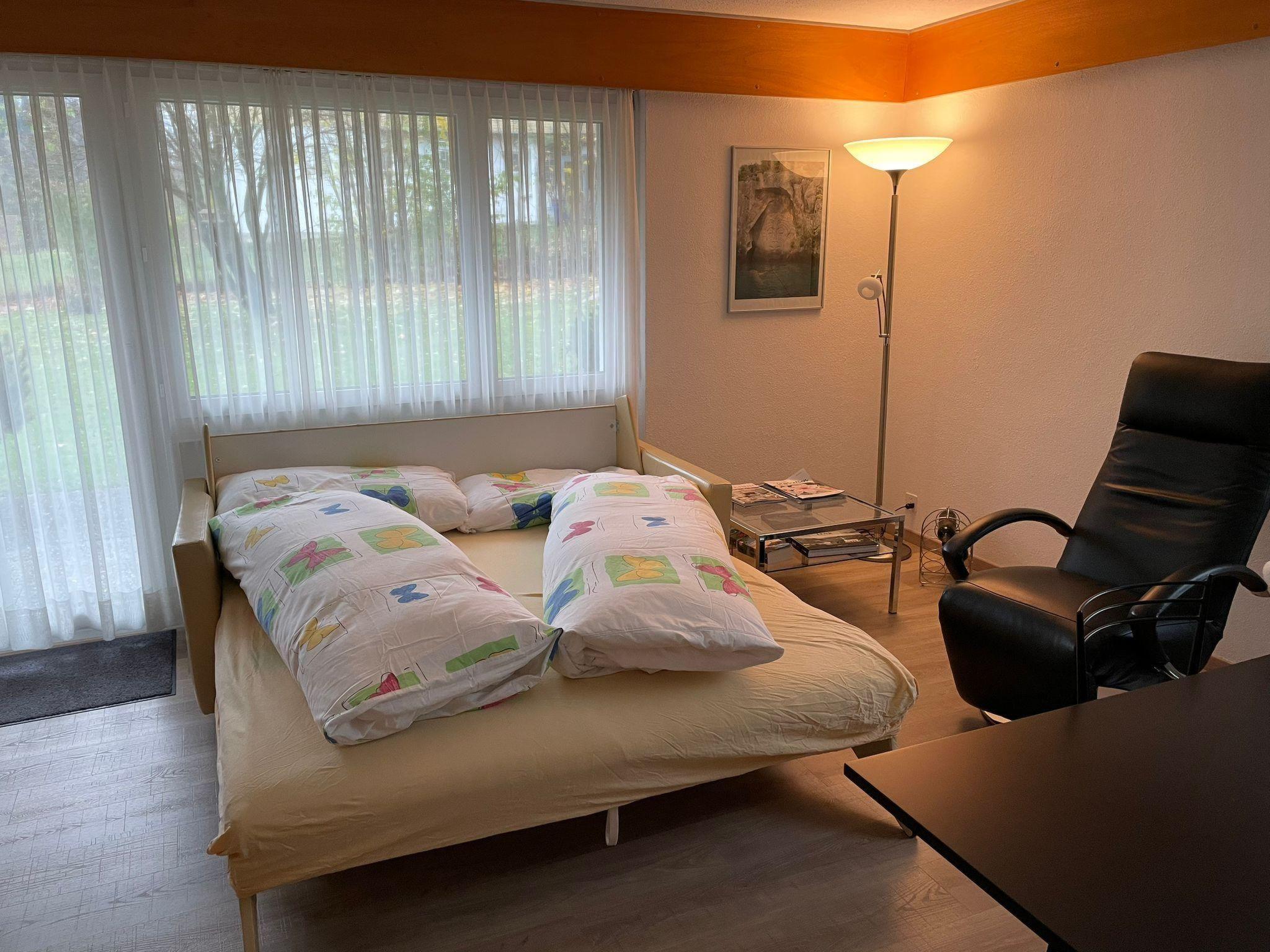 50 m2. More information by the provider: Rcentrly renovated 2.5 room apartment, very centrally located, on the ground floor with private terrace/grill and access to the garden. 5 minutes walk to Wallbach Bad and Walleg Ski Station, 10 minutes walk to the village center. Directly at the bus stop which leads free of charge to the train station or ski stations. The apartment is quiet and central at the same time. It is ideal for couples or families with 2 children.