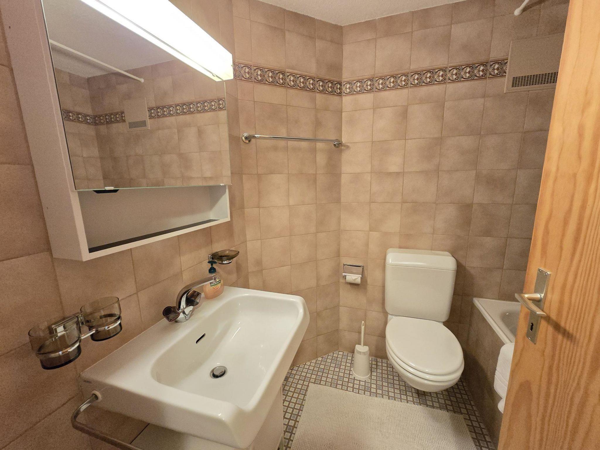 The cozy 2-room ground-floor holiday apartment is approximately 40 m² and features an entrance area with a wardrobe, a living and dining room with a dining table and four chairs, a sofa bed (135 x 200 cm), a comfortable armchair, a TV and direct access to the southwest-facing terrace. The open kitchen is equipped with a 3-burner electric stove, oven, dishwasher, refrigerator, extractor hood and plenty of built-in cupboards. The bedroom offers a French double bed (160 x 200 cm) and the bathroom is fitted with a toilet and washbasin. Shared facilities include a ski room, a ski cellar and a washing machine, which guests must register to use in a list located in the laundry room. A parking space in the underground garage is also included. Wi-Fi is available. Pets are not allowed and this is a non-smoking apartment.