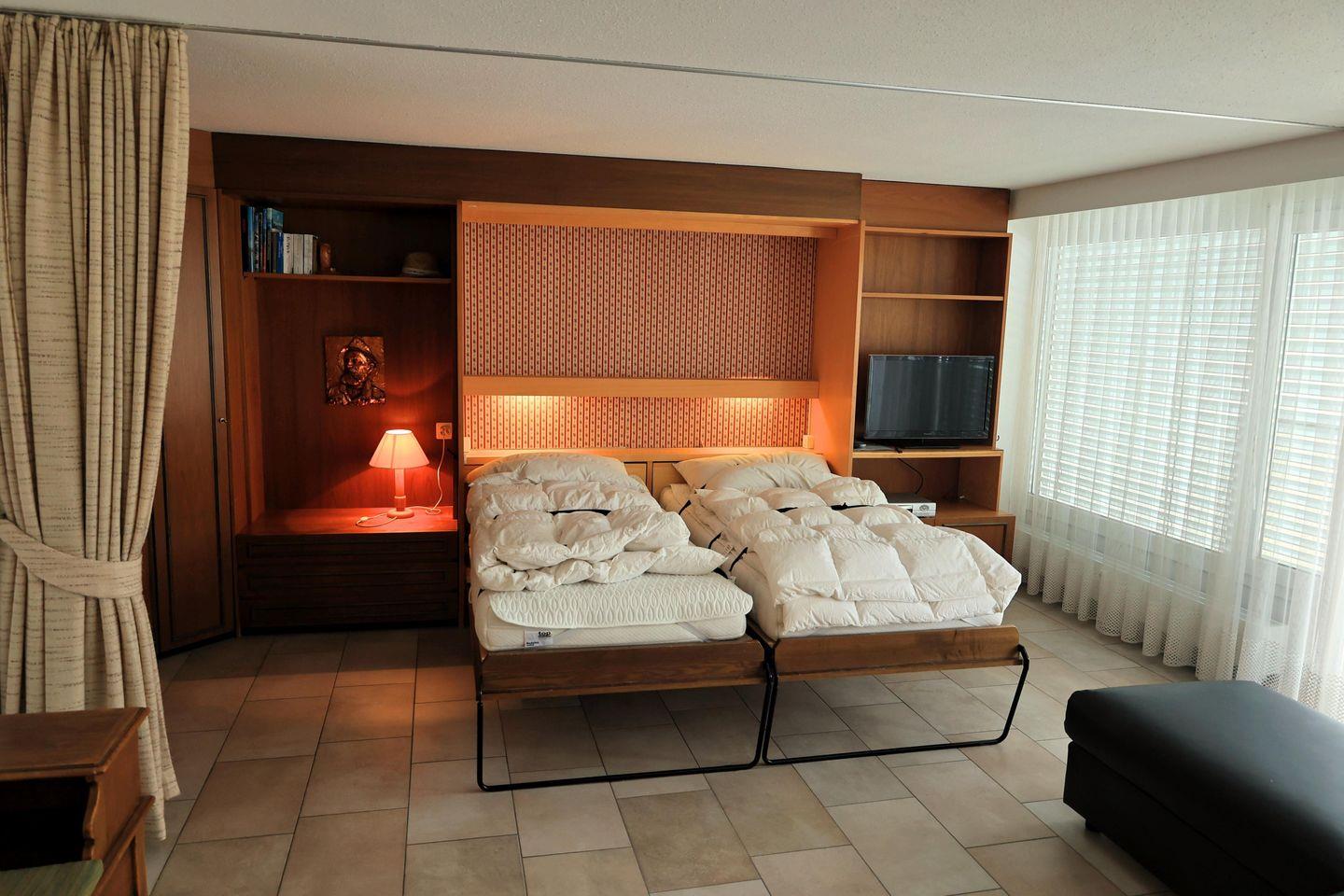 Wohn- / Esszimmer mit TV/Radio, Sitzgruppe, Esstisch und 2 Wandklappbetten