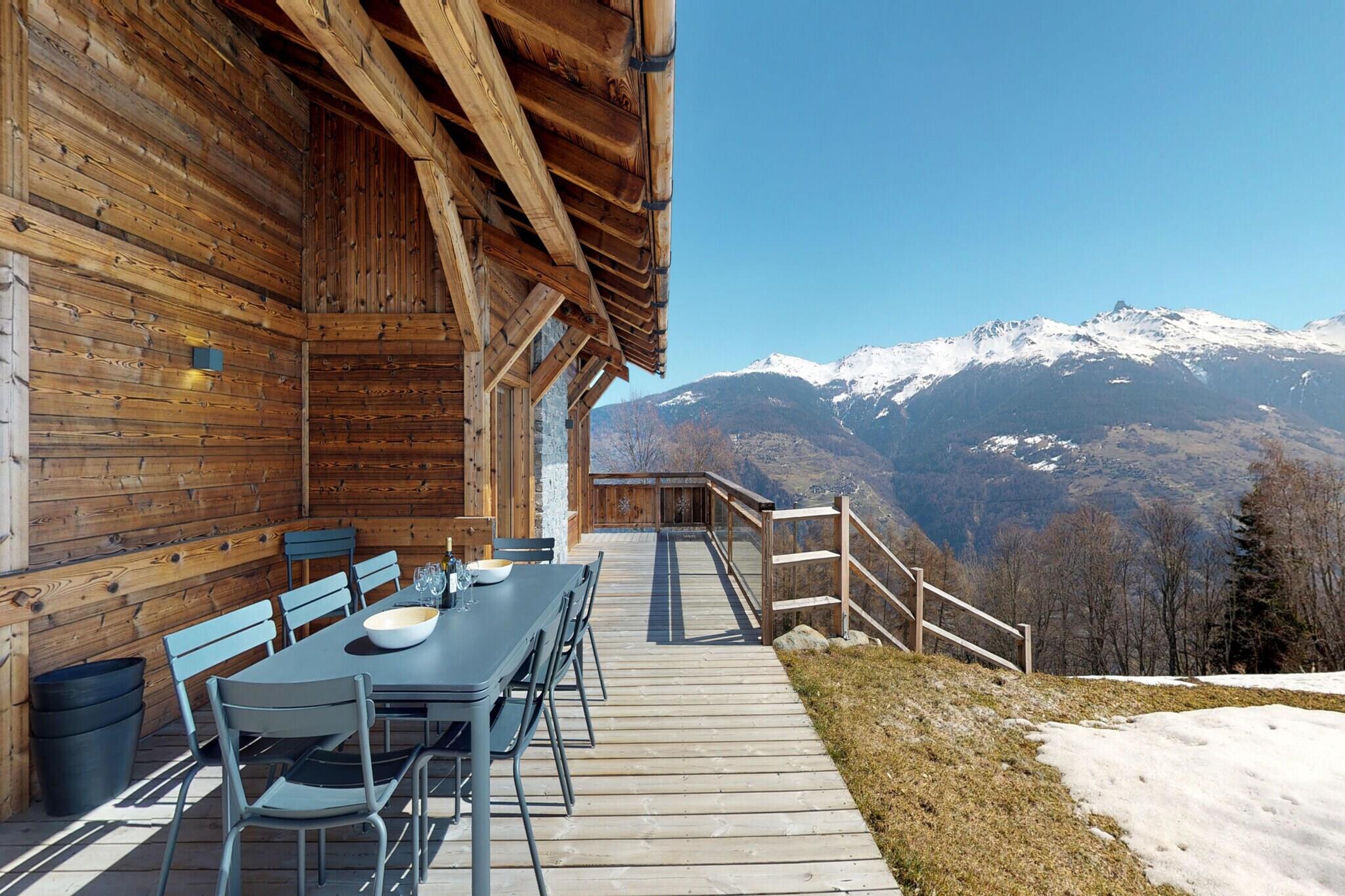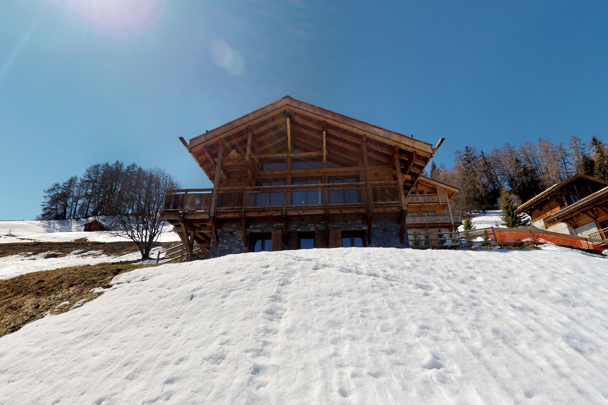 Slap af i denne fantastiske 5-stjernede luksushytte beliggende i de smukke omgivelser i de schweiziske alper, med en betagende udsigt over Rhône-dalen og Dent-Blanche. Perfekt til op til 10 gæster, hytten har et rummeligt interiør på 166 m² med en lys stue, pejs og en spiseplads med et stort bord til 10. Det moderne køkken er fuldt udstyret med et stort køleskab, fryser, opvaskemaskine, kaffe maskiner, og endda en raclettegrill og fonduesæt til en mindeværdig alpine madoplevelse. Hytten byder på fire luksuriøse soveværelser, herunder et master bedroom med dobbeltseng (180x200 cm) og tre andre værelser med komfortable enkelt- og køjesenge. Der er fire badeværelser, herunder et overdådigt tilstødende brusebad med badekar, italiensk bruser og dobbelt håndvask. Nyd det udendørs rum med en lille have og stor terrasse, der kan prale af en spektakulær udsigt over dalen. For nemheds skyld inkluderer hytten et vaskerum med vaskemaskine og tørretumbler samt to udendørs parkeringspladser. Beliggende kun 5 minutter i bil fra skiløjperne, tilbyder denne nybyggede hytte nem adgang til Les Masses stoleliften (1,4 km) og Mayens spor (4,7 km). Under dit ophold kan du nyde eksklusive fordele som op til 50 % rabat på leje af udstyr og yderligere tjenester som en gourmetkurv eller sen afgang for at gøre din ferie endnu mere speciel. Med moderne luksus, en fantastisk udsigt og rigelig komfort er denne hytte det ideelle valg til både vinter- og sommerferier.