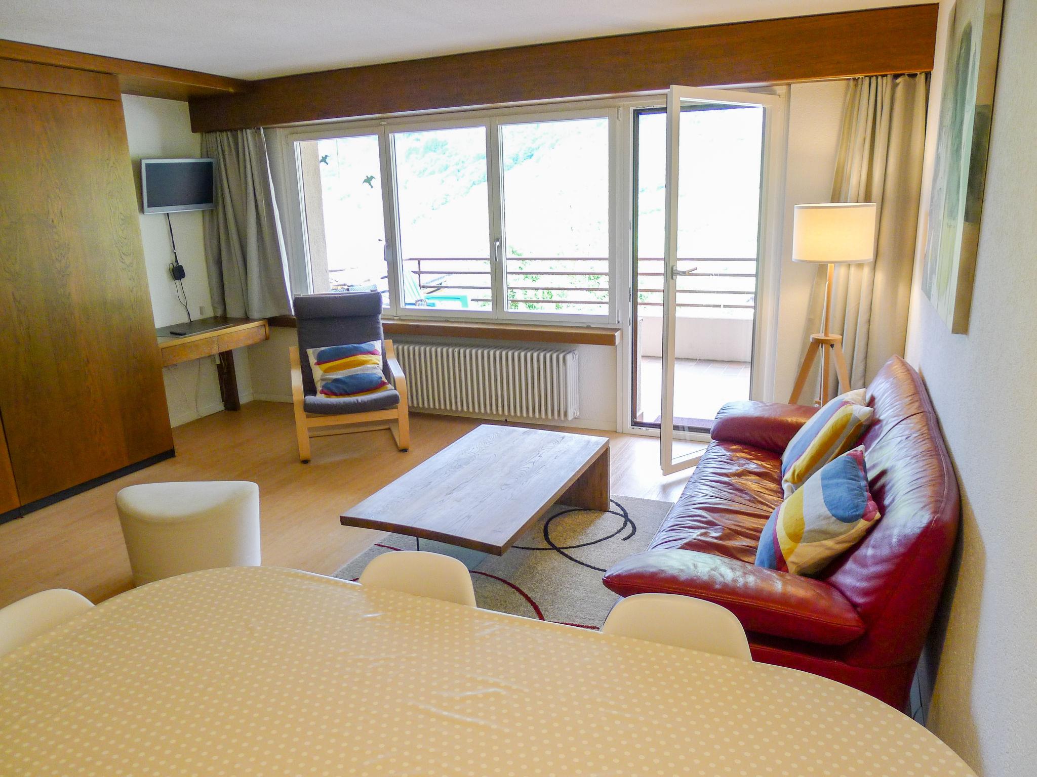 "Ringstrasse Apt 121", 1-room apartment 50 m2 on 1st floor. Cosy furnishings: living/dining room with 2 fold-away beds and cable TV (flat screen). Exit to the balcony. Alcove with curtain with 2 x 2 bunk beds. Kitchen (4 hot plates, oven) with hatch. Shower/WC, sep. WC. Balcony. Balcony furniture. View of the mountains, the valley and the countryside. Facilities: Internet (WiFi, free). Please note: non-smokers only. the bed linen for the two upper bunk beds can be provided on request, you have to make your own beds. Instead of an enclosed bedroom, some sleeping areas are located in an open-plan area (gallery, alcove, etc.).