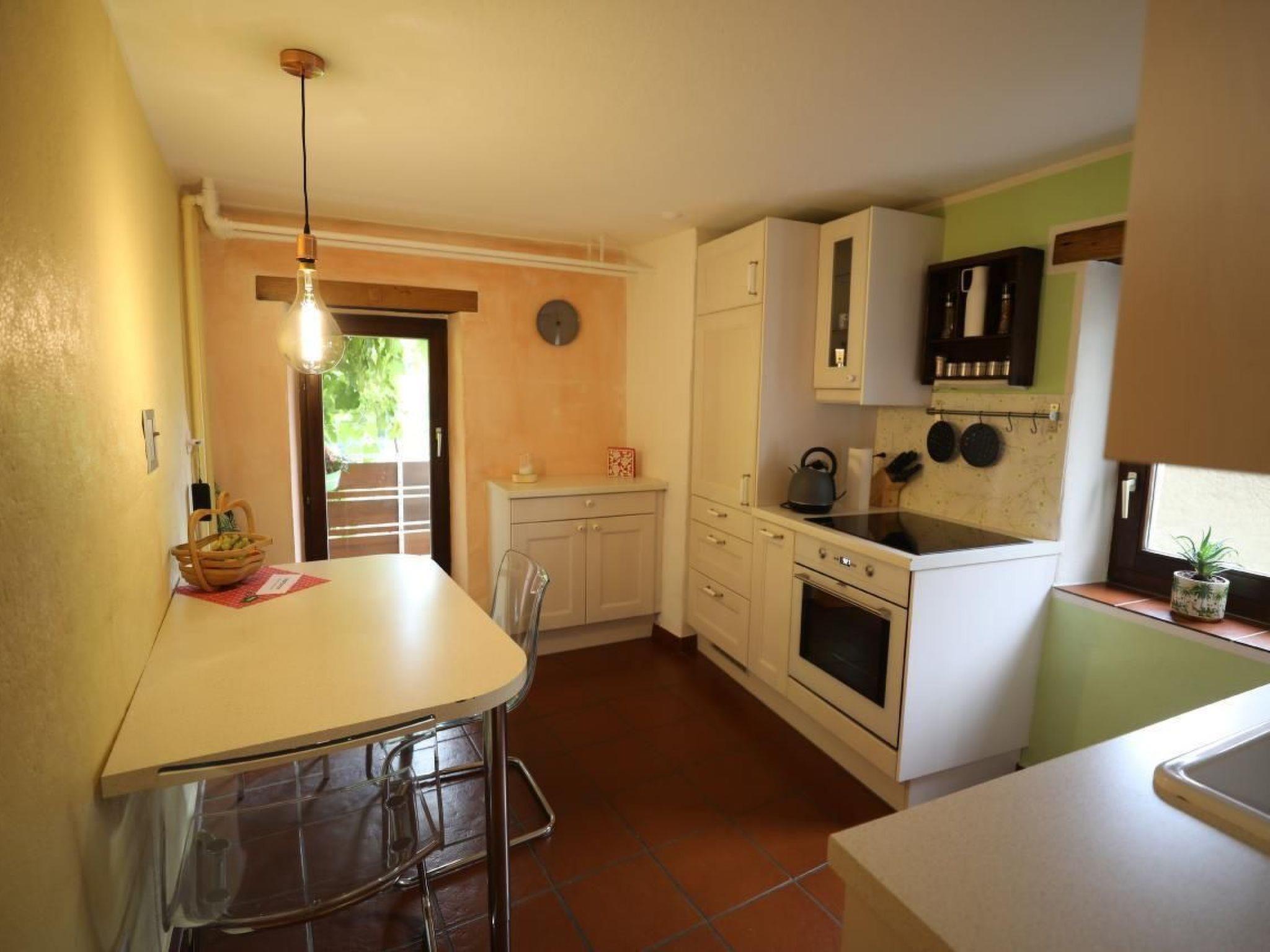 The outdoor area enchants with a sunny south-facing balcony that offers a breathtaking view of the surrounding wild forests. Equipped with deckchairs, parasols, tables and chairs, you can relax here to the full. A reserved parking space about 200 metres from the entrance and a picturesque access path that leads past a village fountain complete the offer.